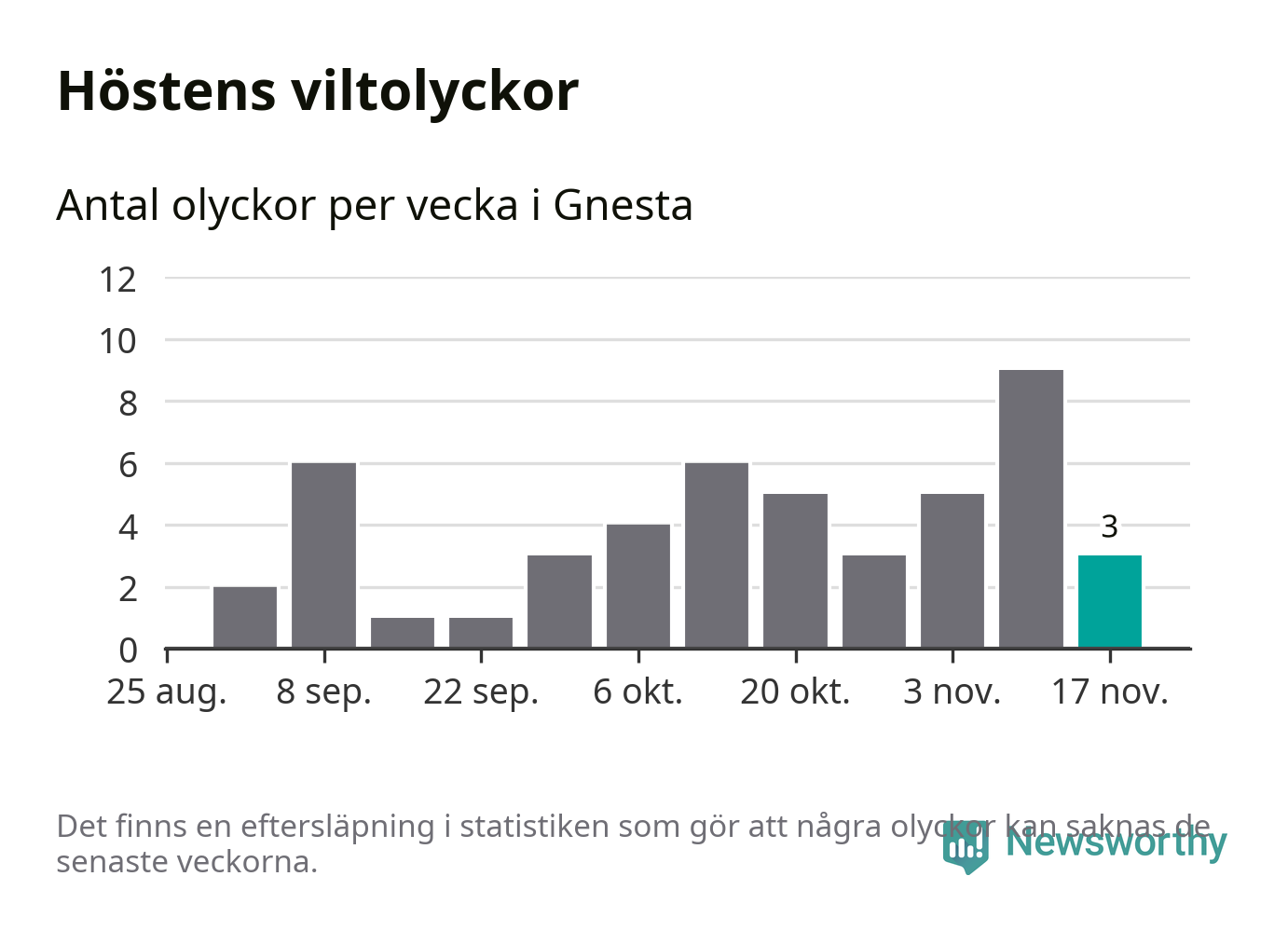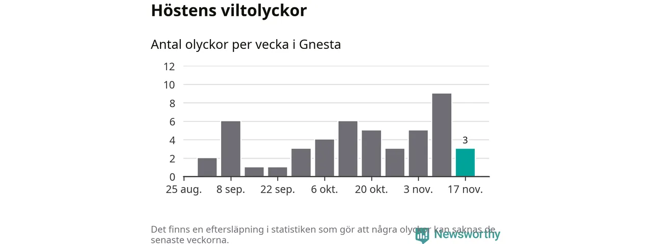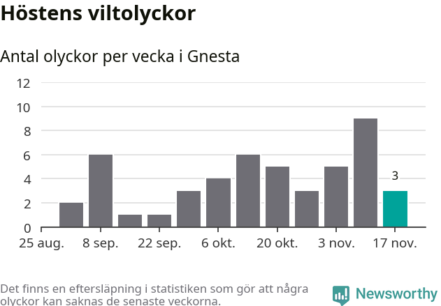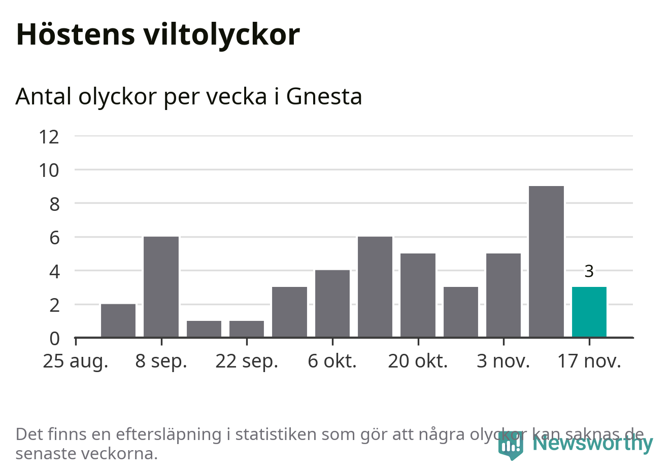 Hittills har tre viltolyckor rapporterats in i Gnesta kommun från vecka 47. Se listan här.