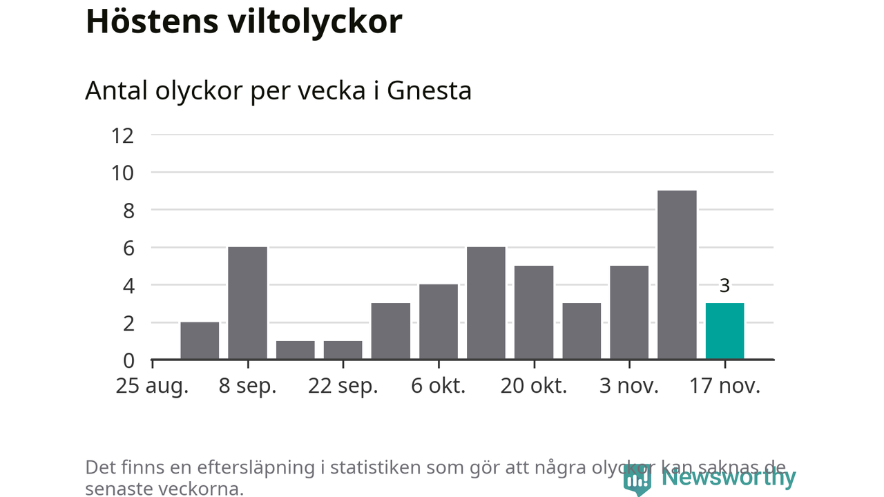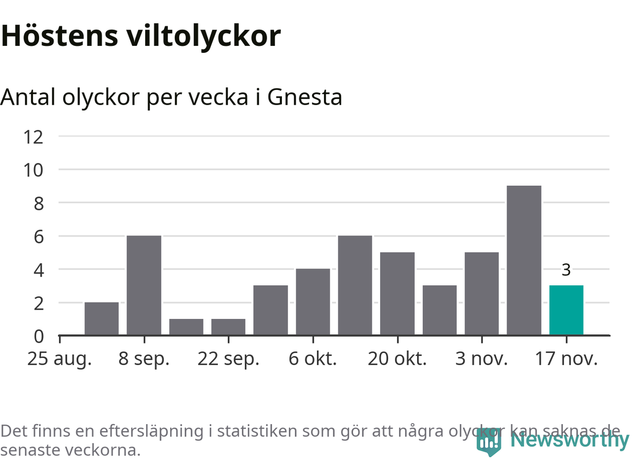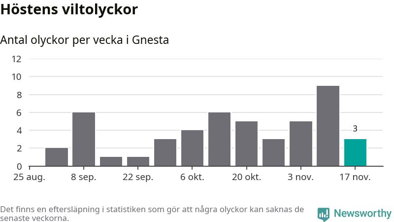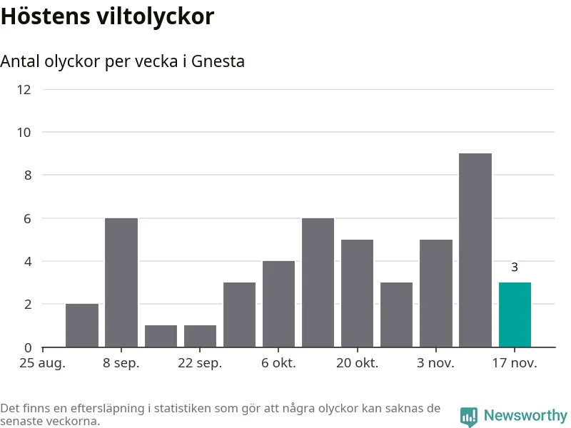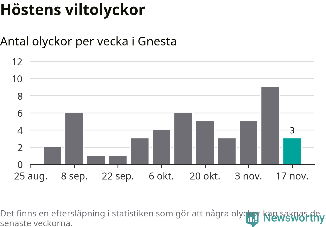 Hittills har tre viltolyckor rapporterats in i Gnesta kommun från vecka 47. Se listan här.