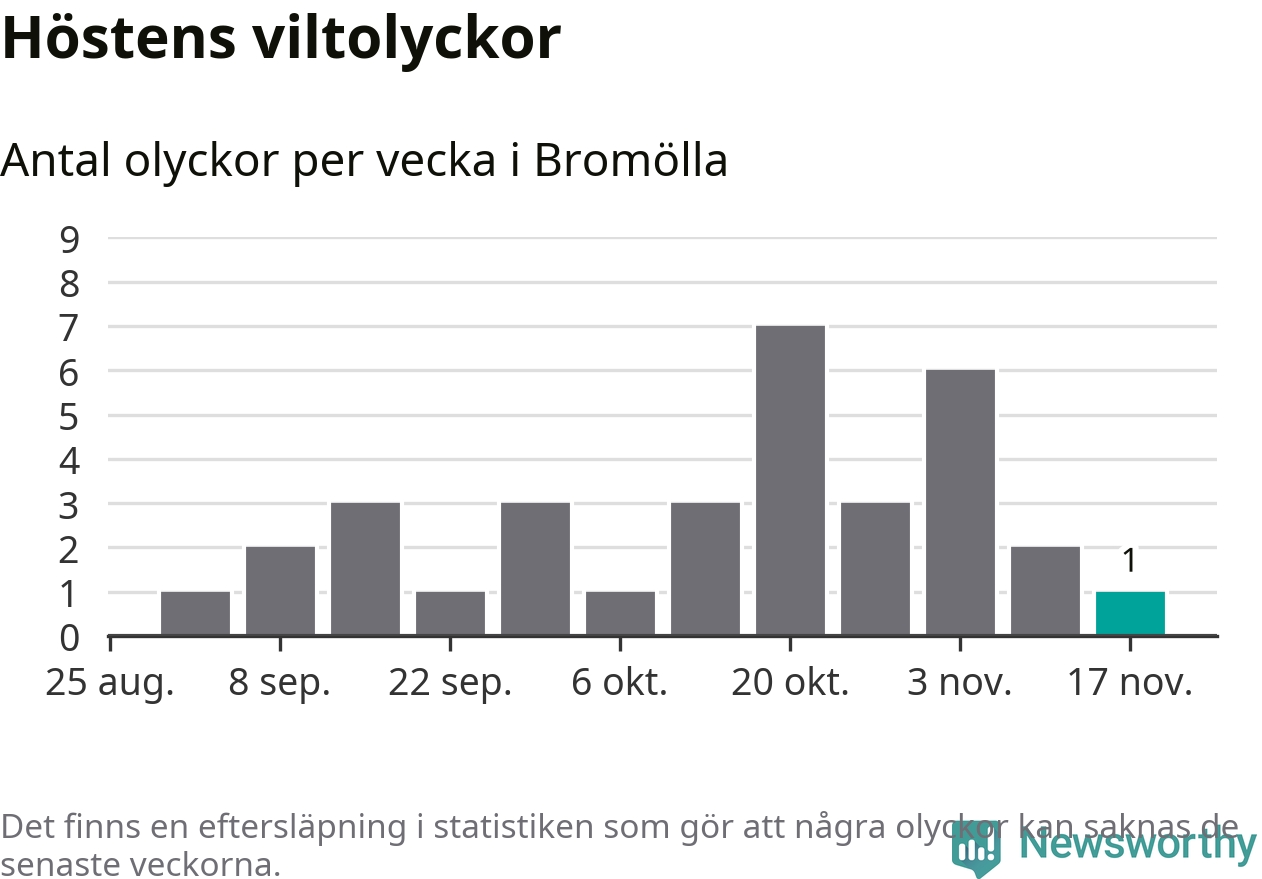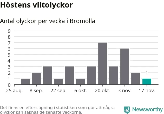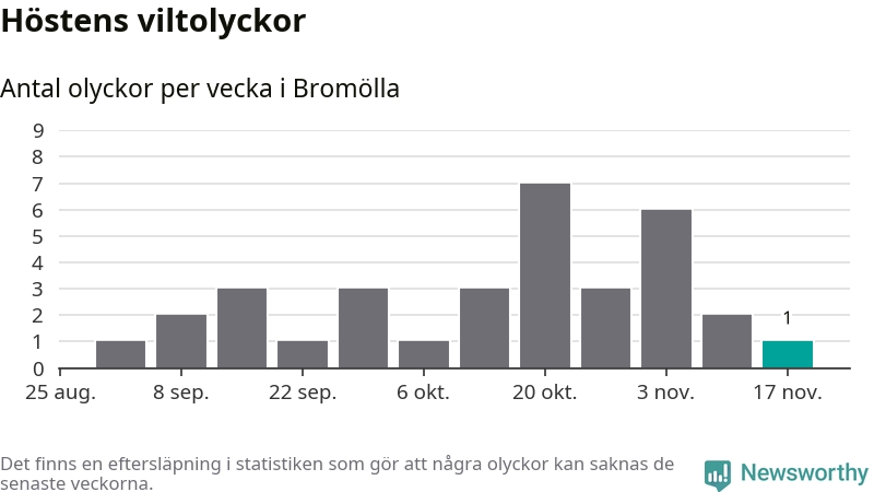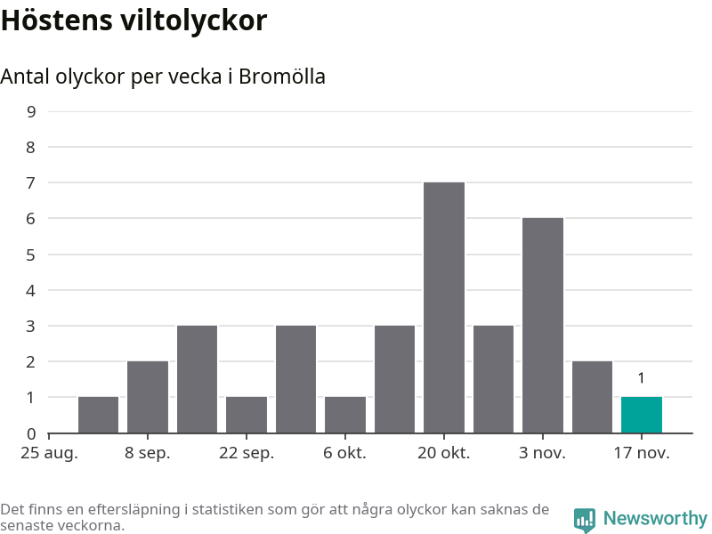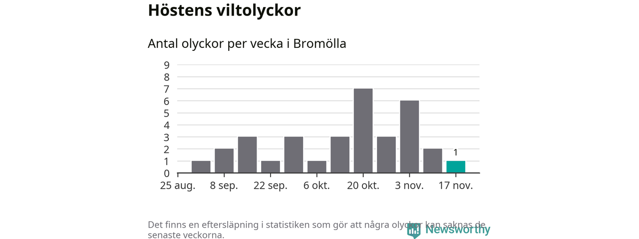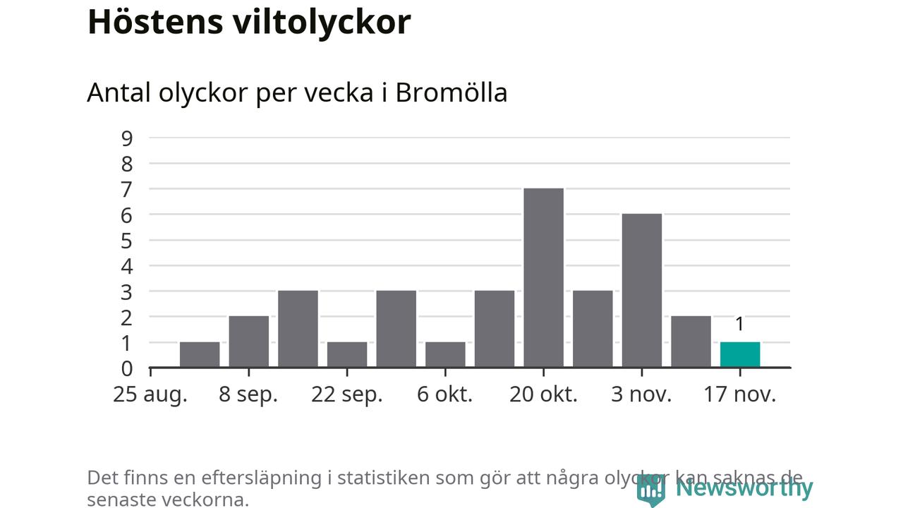 Från förra veckan (vecka 47) har hittills en viltolycka rapporterats in i Bromölla kommun.