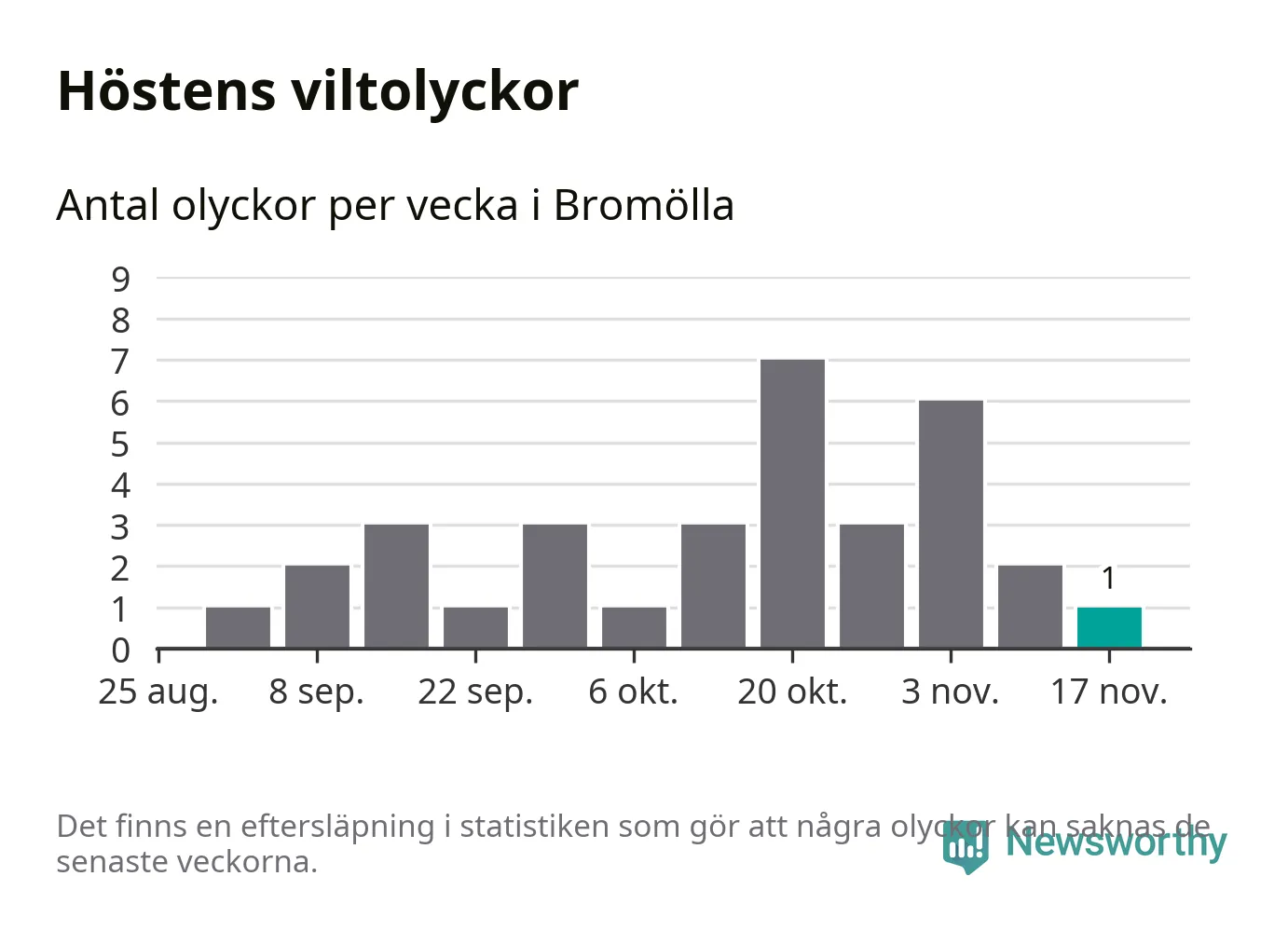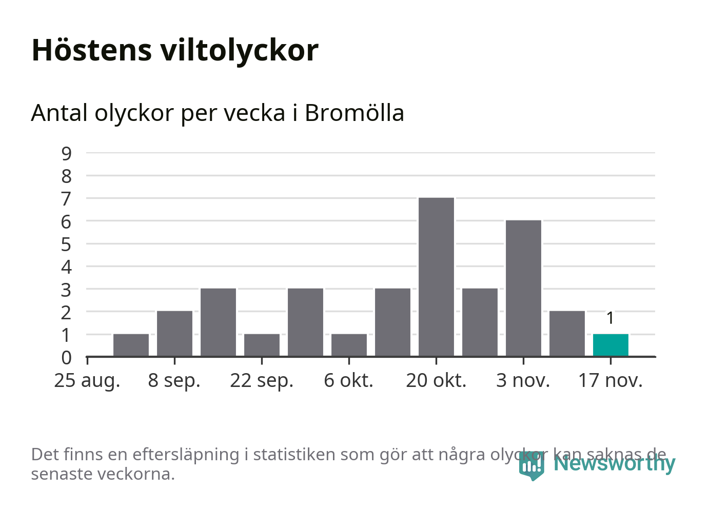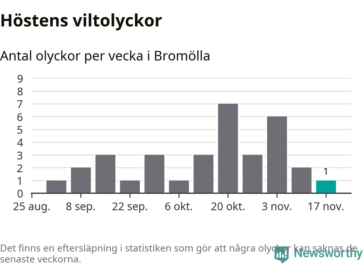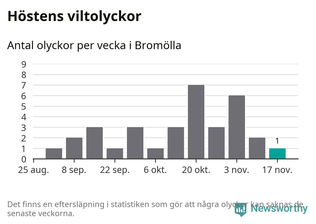 Från förra veckan (vecka 47) har hittills en viltolycka rapporterats in i Bromölla kommun.