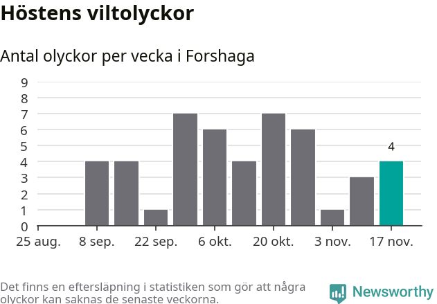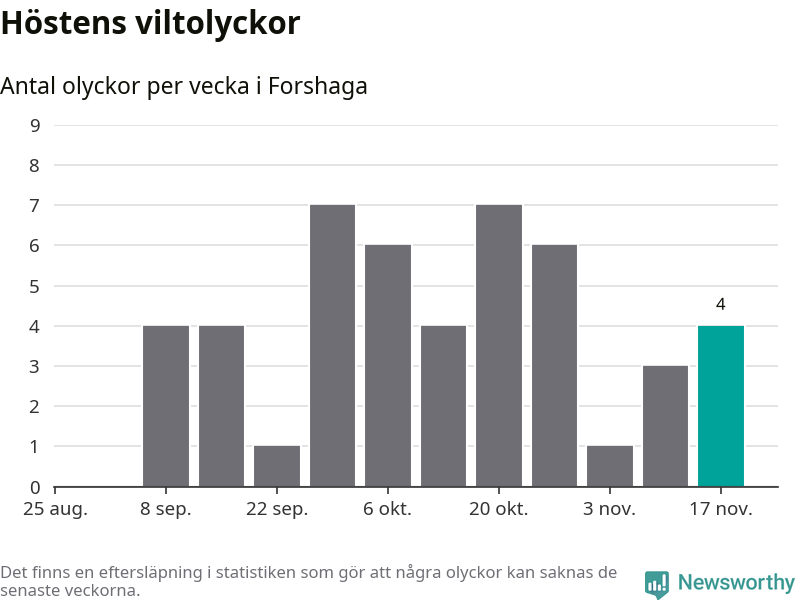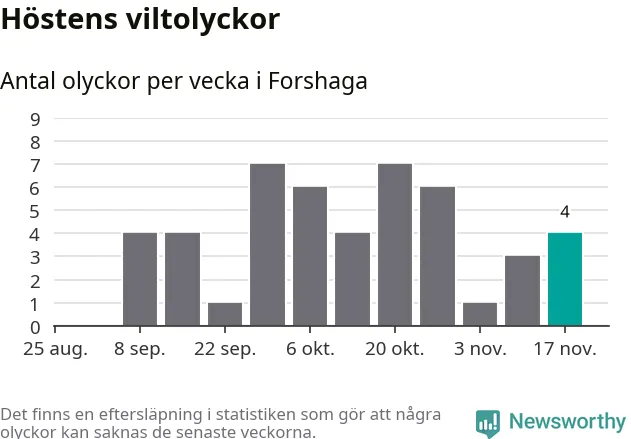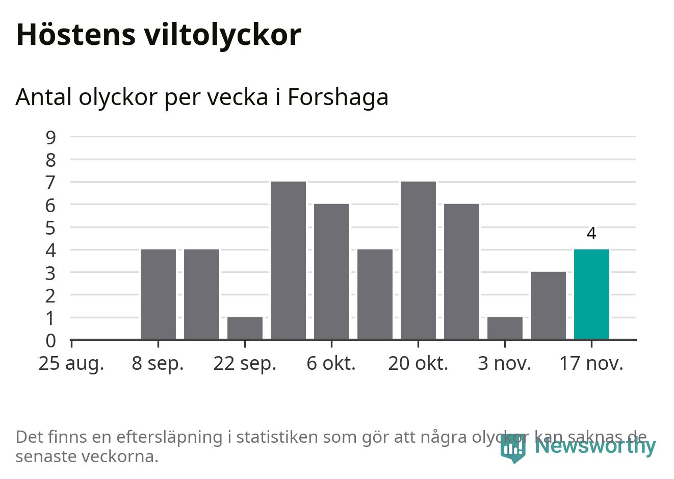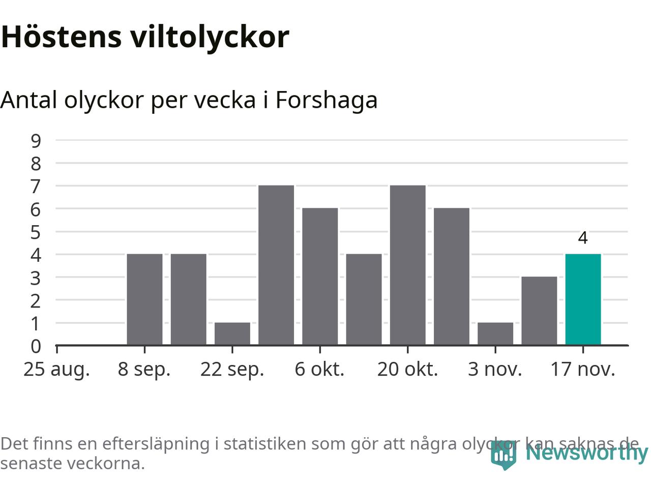 Hittills har fyra viltolyckor rapporterats in i Forshaga kommun från vecka 47. Se listan här.