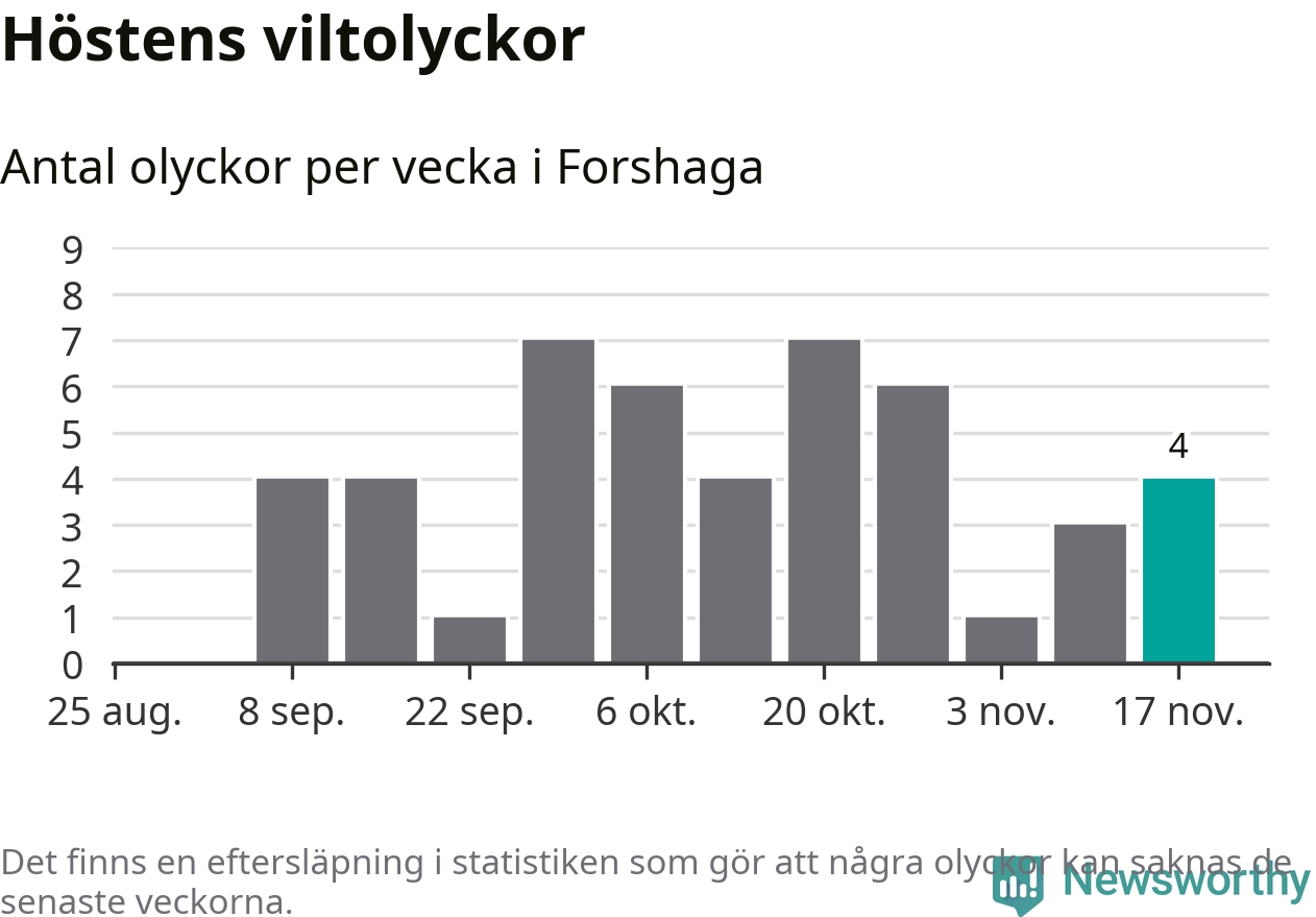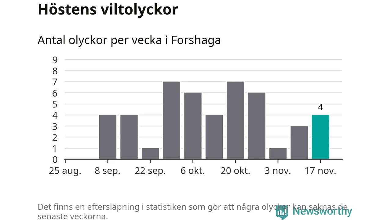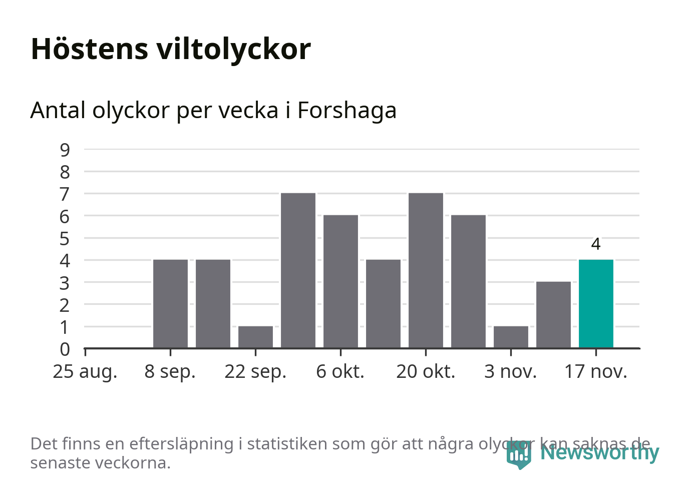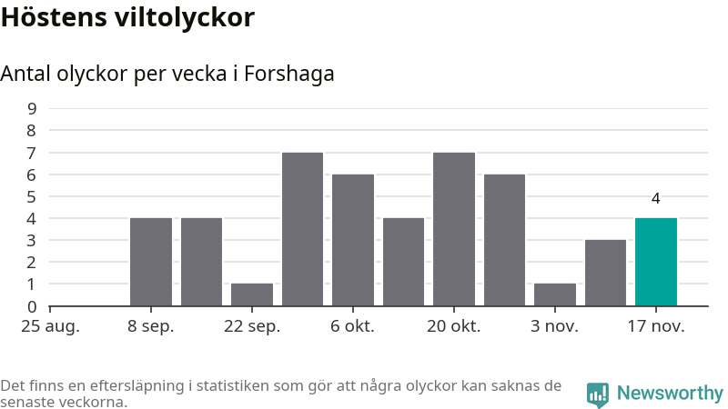 Hittills har fyra viltolyckor rapporterats in i Forshaga kommun från vecka 47. Se listan här.