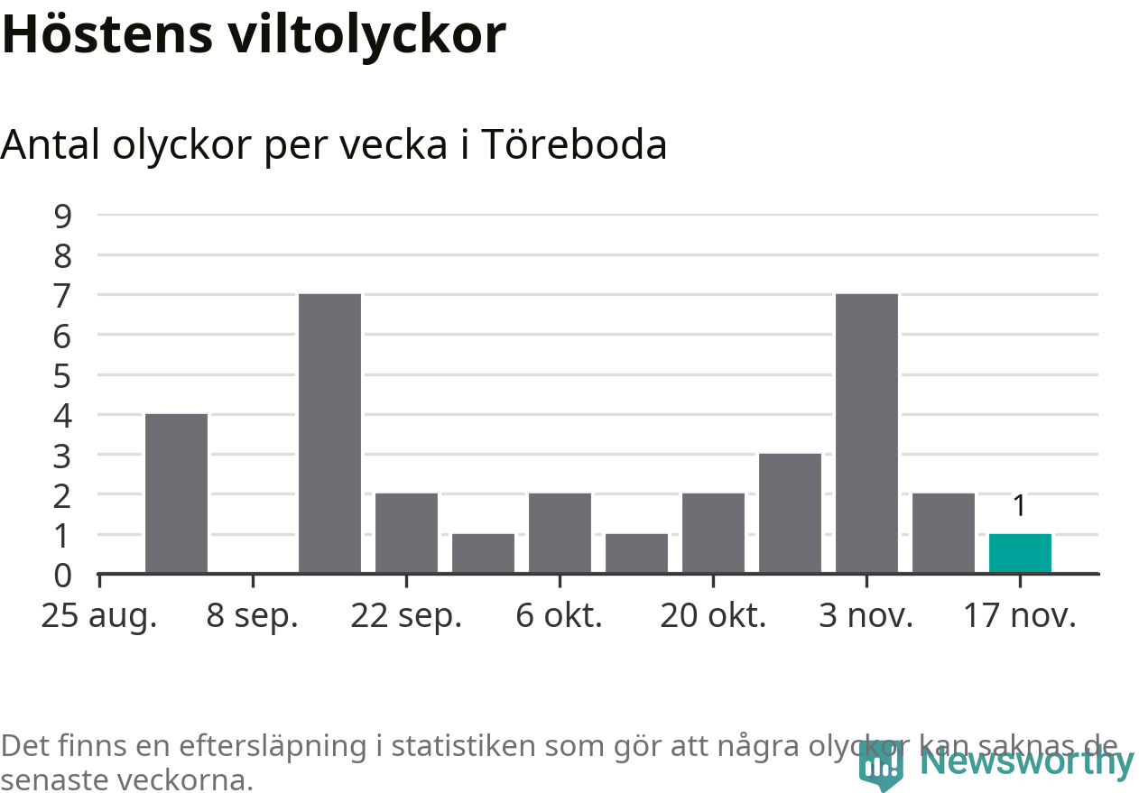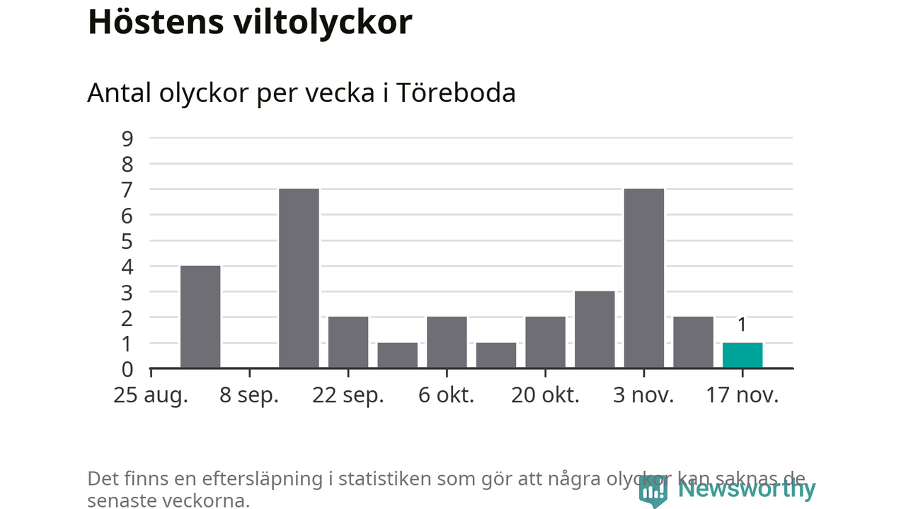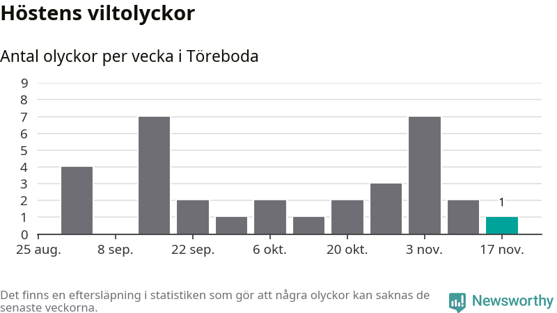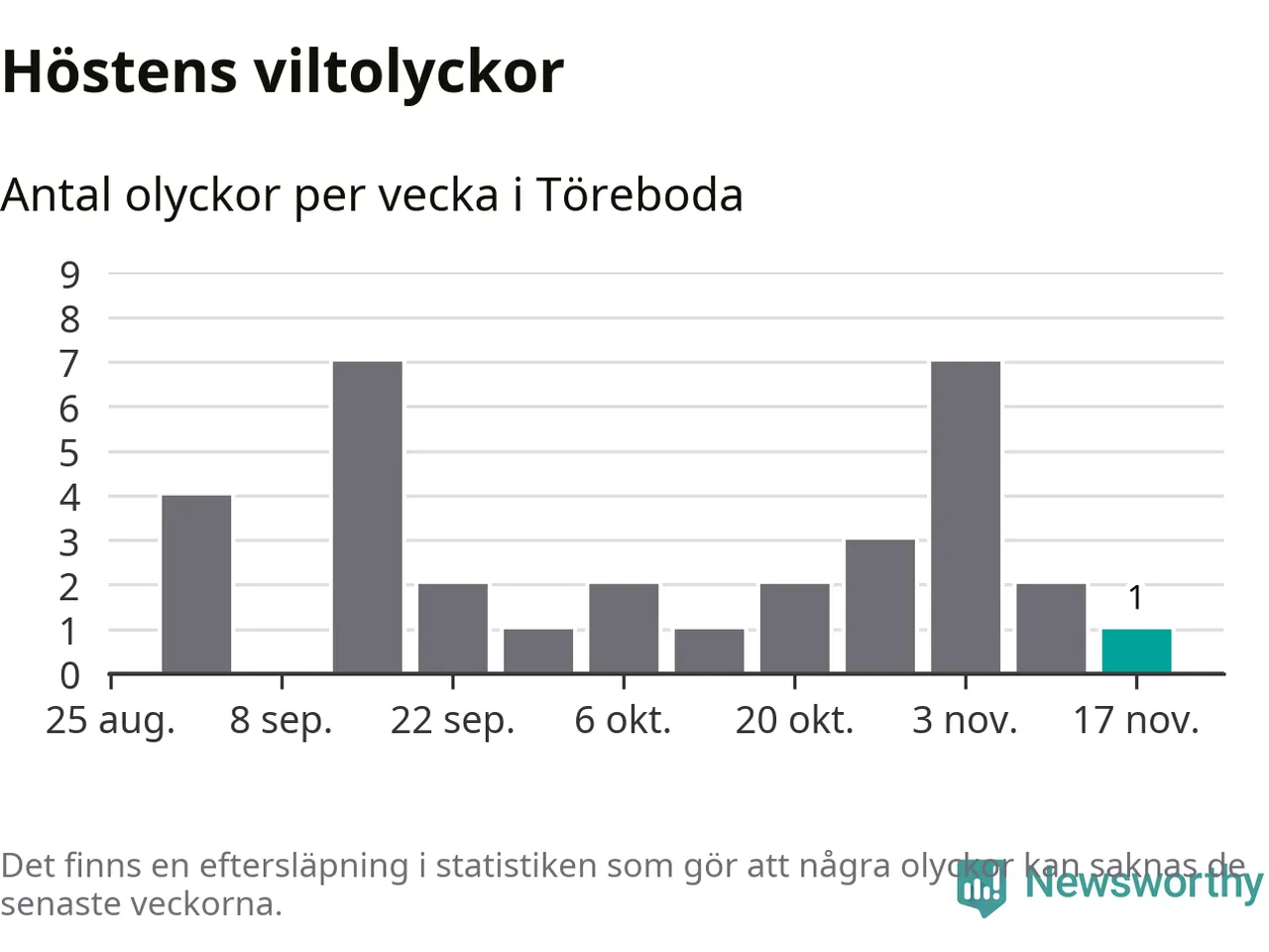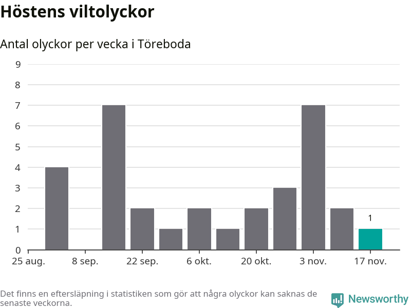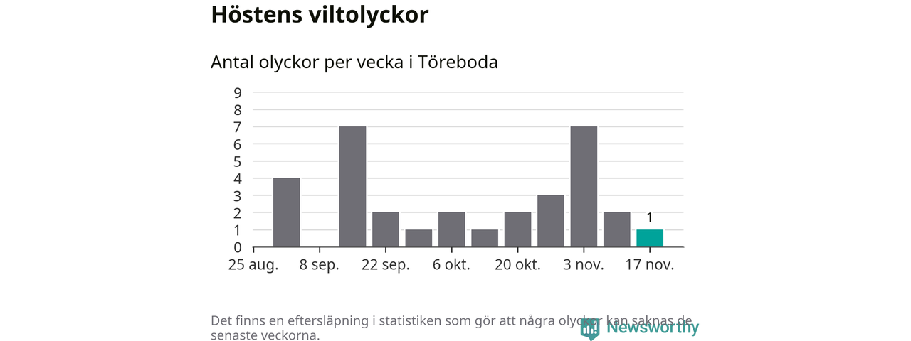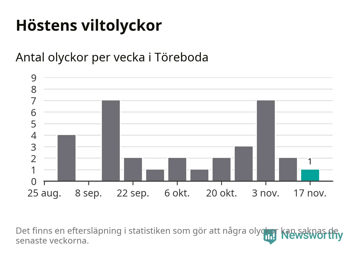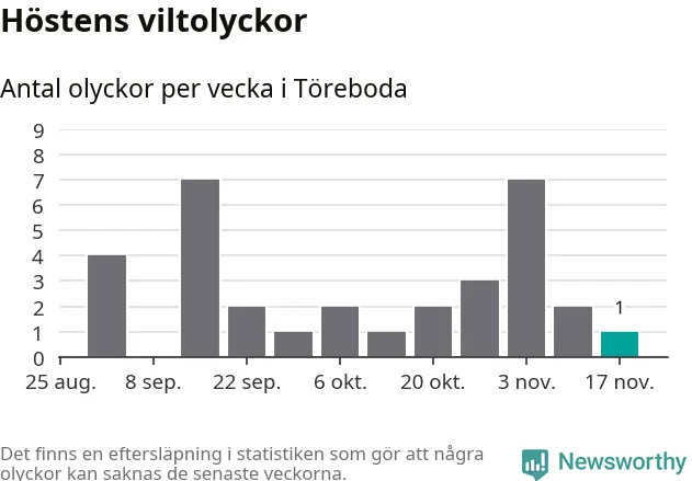 Från förra veckan (vecka 47) har hittills en viltolycka rapporterats in i Töreboda kommun.