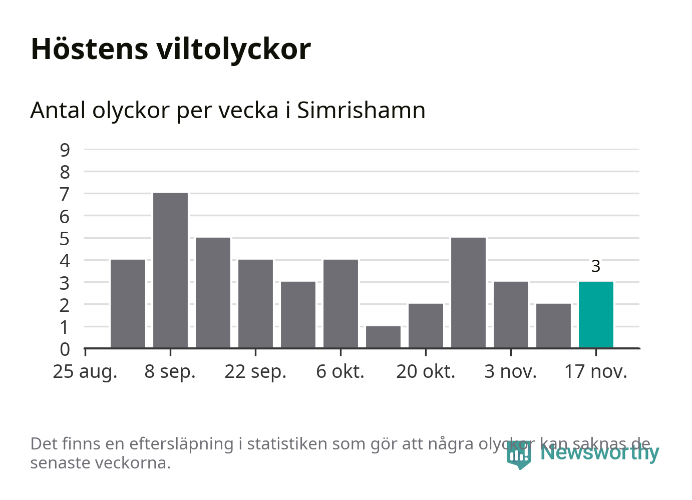 Totalt den här hösten har det inträffat 43 viltolyckor i kommunen. Det är en normal nivå i förhållande till hur det har sett ut under de senaste tio åren – genomsnittet för motsvarande period är 48.