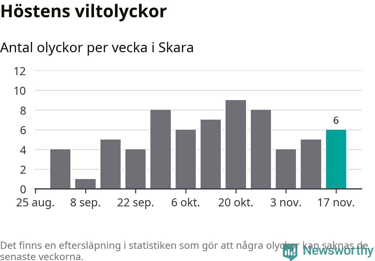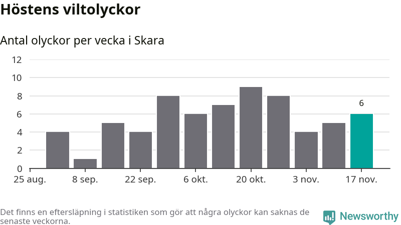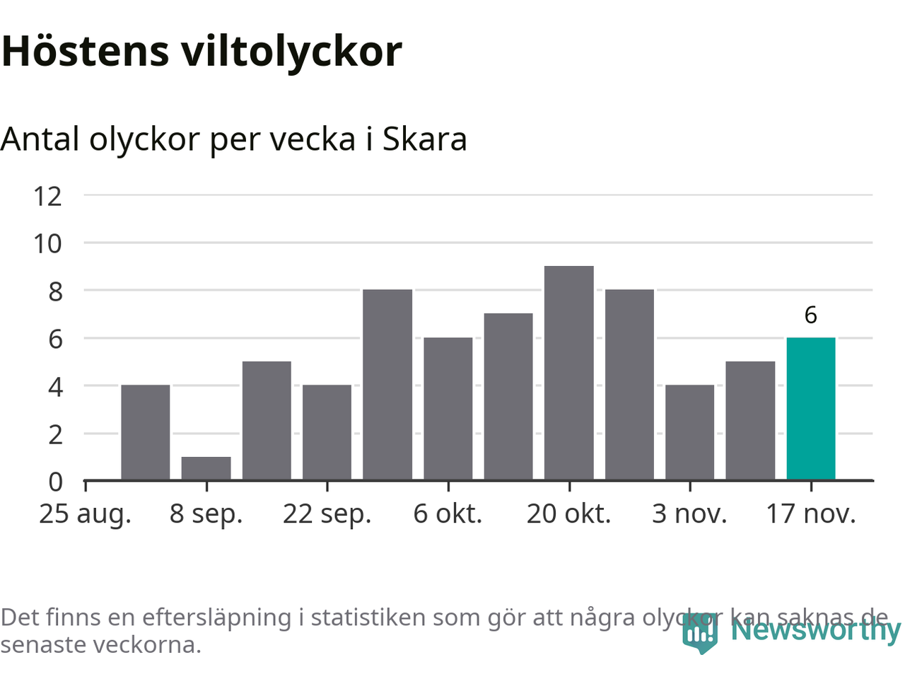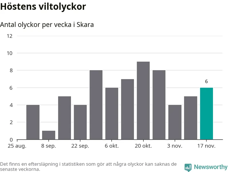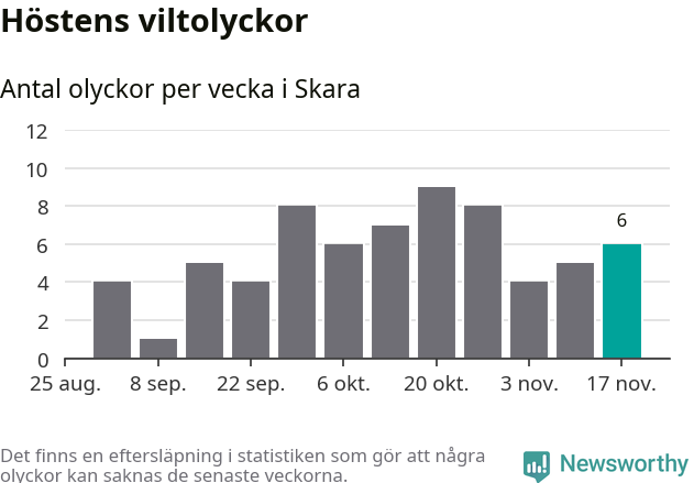 Hittills har sex viltolyckor rapporterats in i Skara kommun från vecka 47. Se listan här.