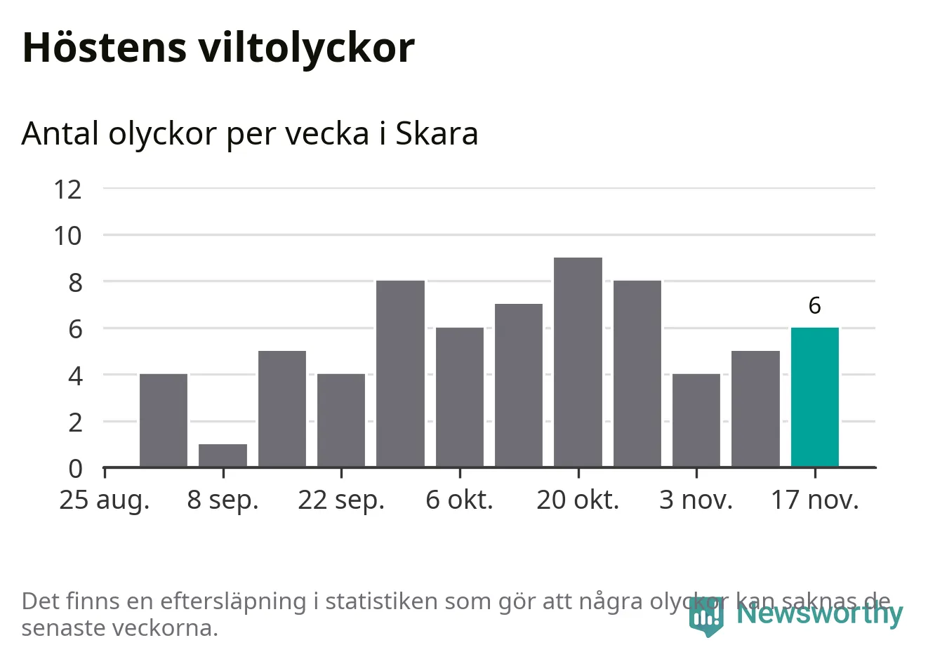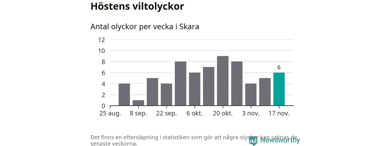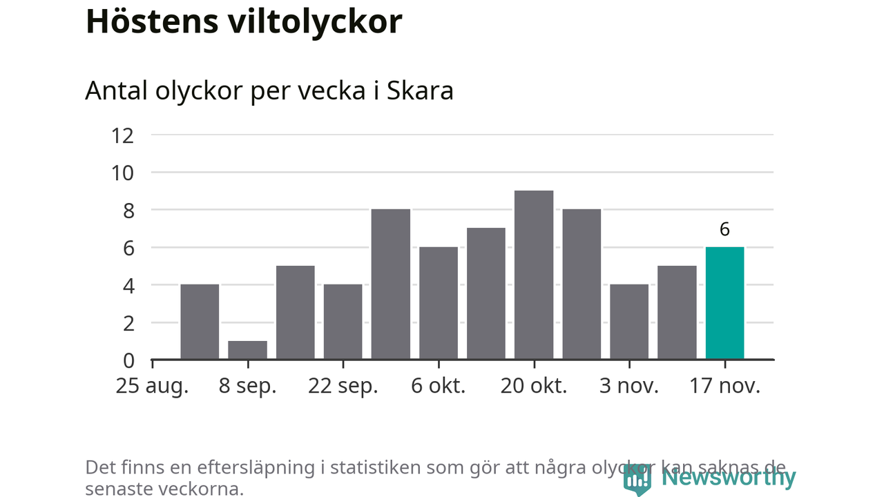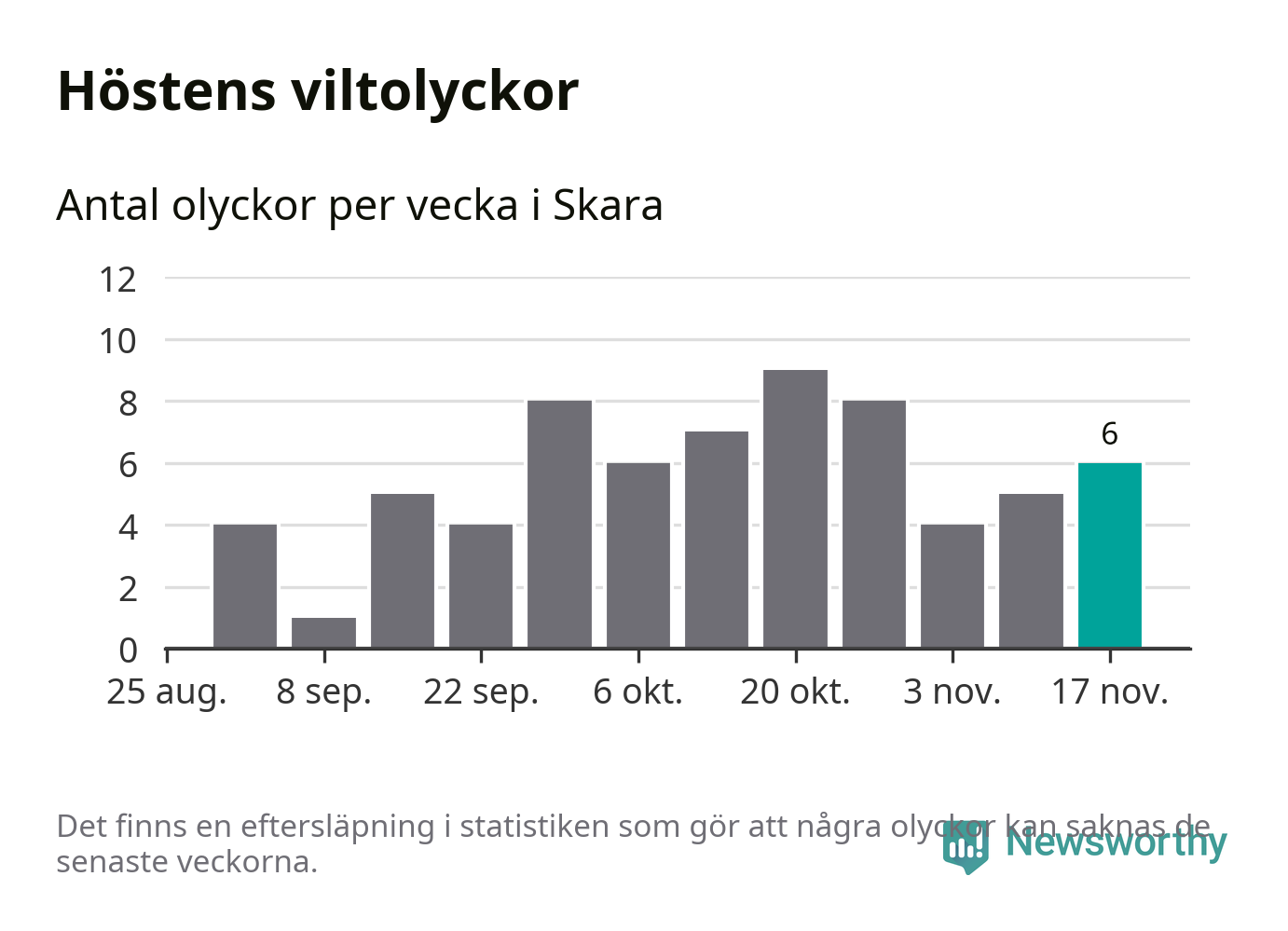 Hittills har sex viltolyckor rapporterats in i Skara kommun från vecka 47. Se listan här.