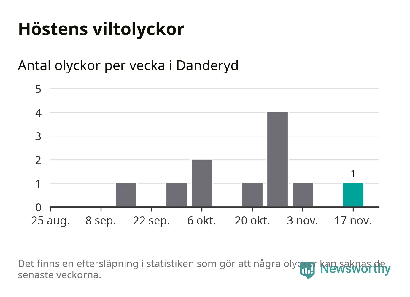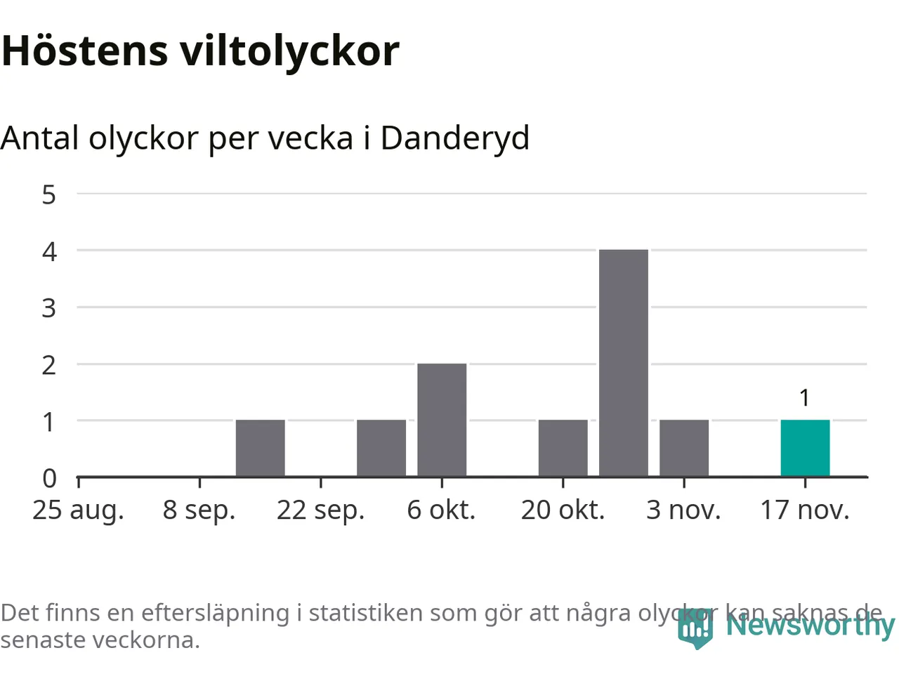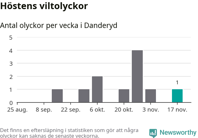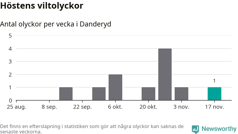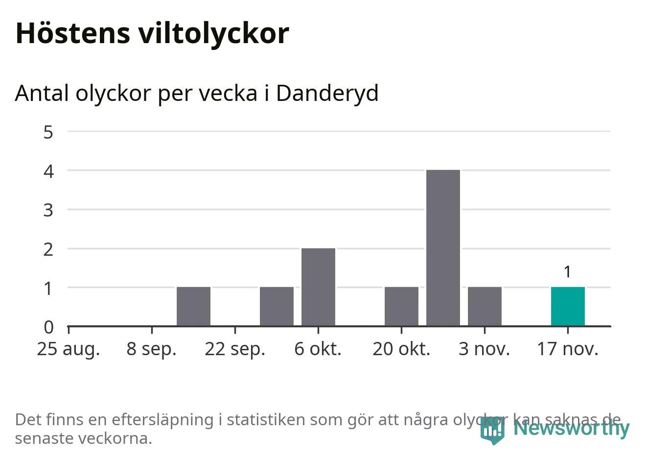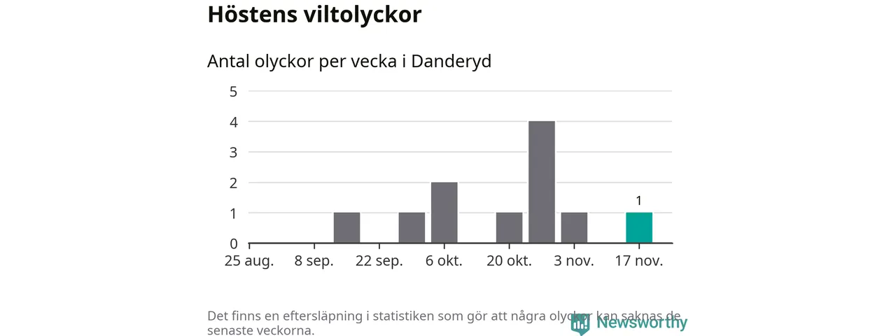 Från förra veckan (vecka 47) har hittills en viltolycka rapporterats in i Danderyds kommun.