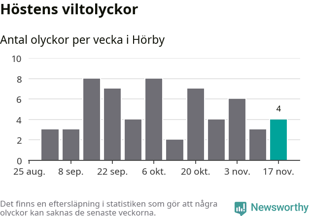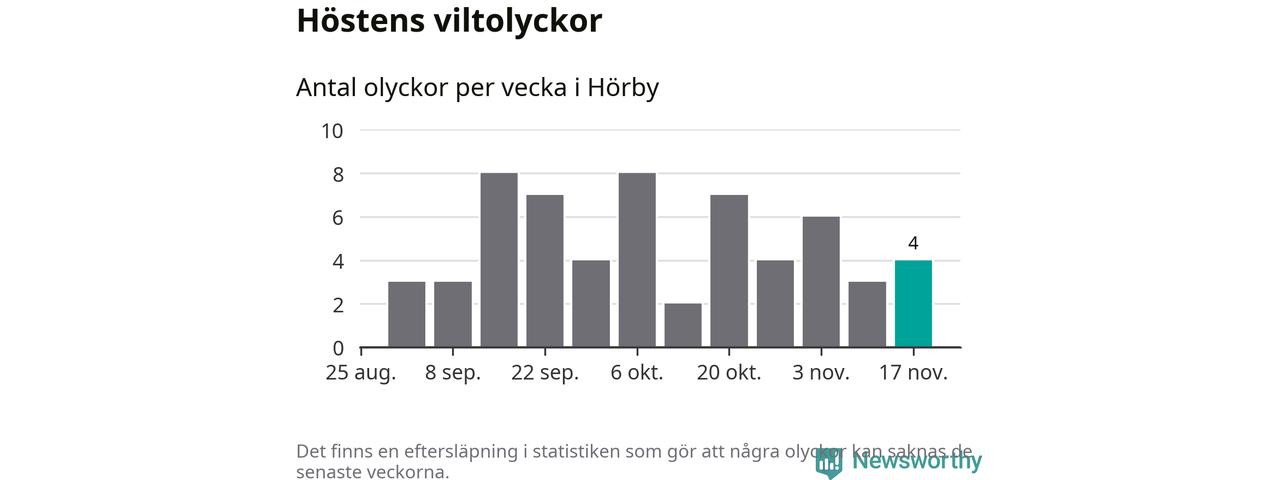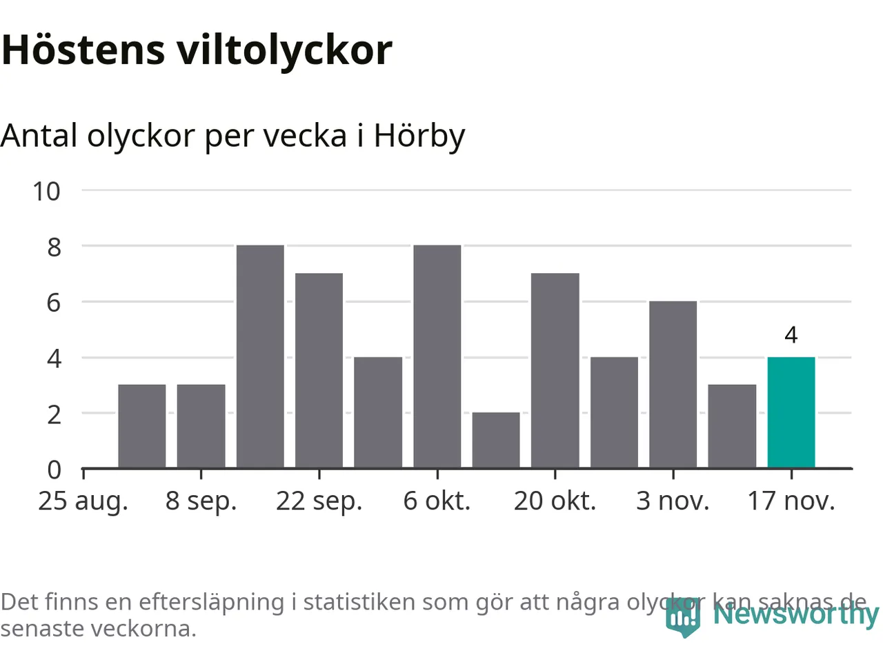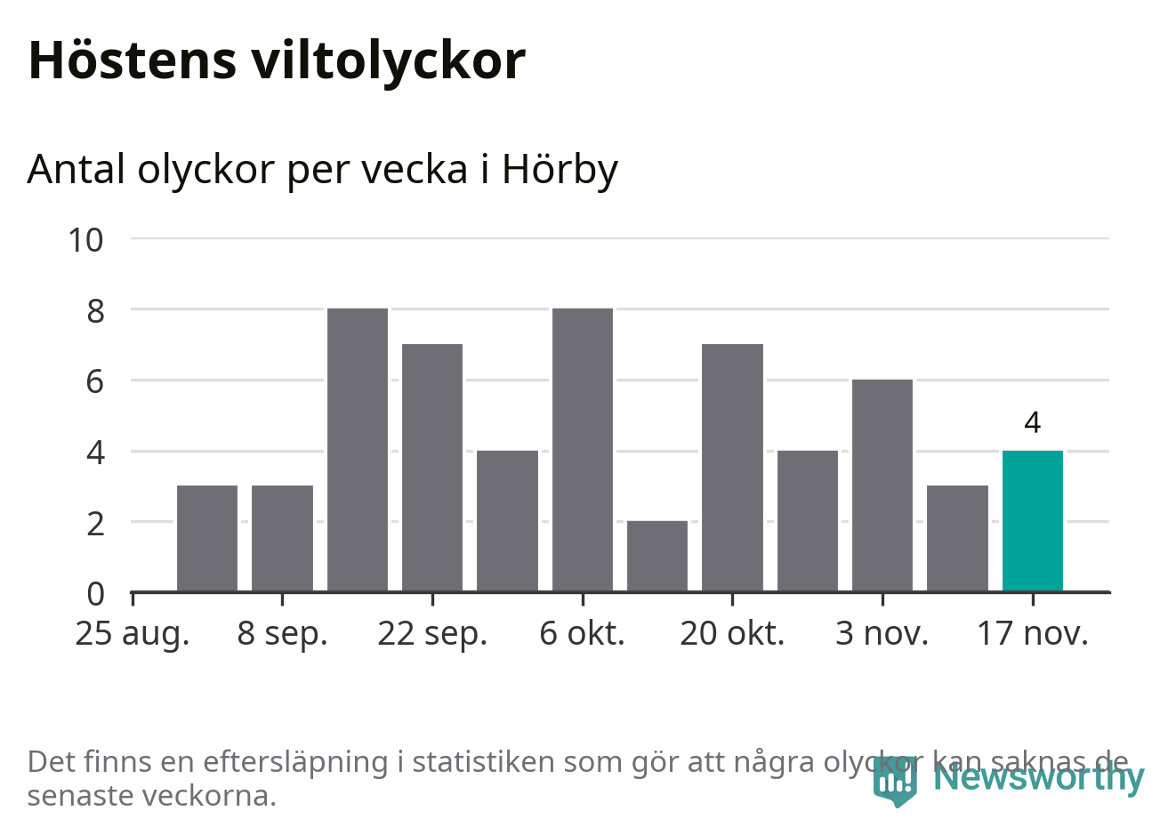 Hittills har fyra viltolyckor rapporterats in i Hörby kommun från vecka 47. Se listan här.