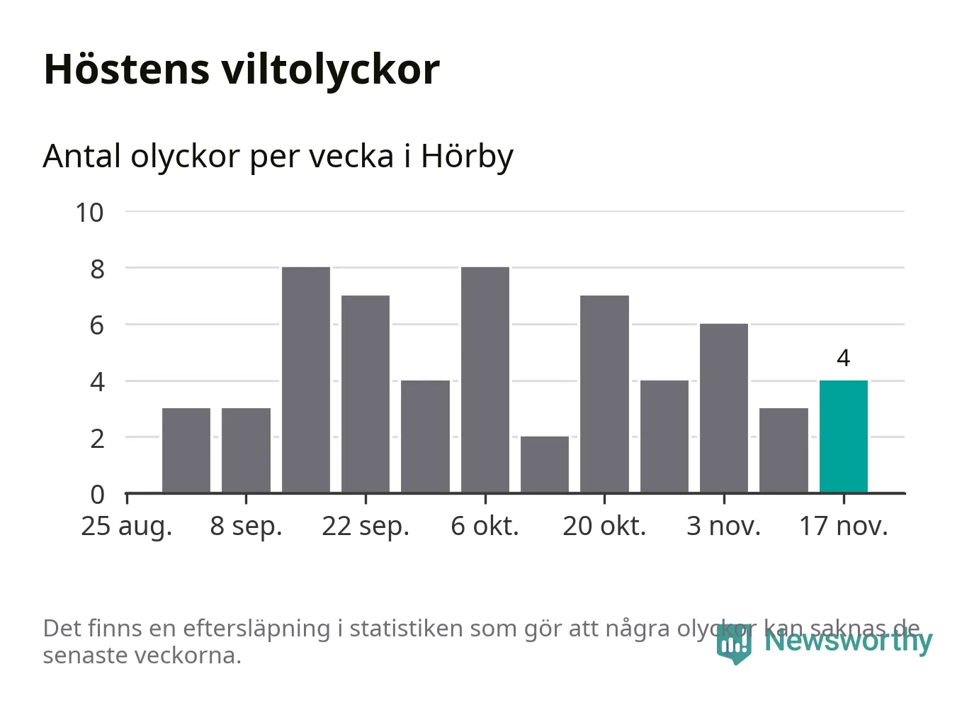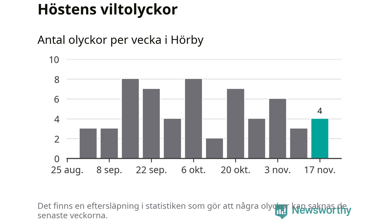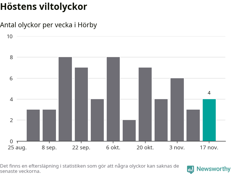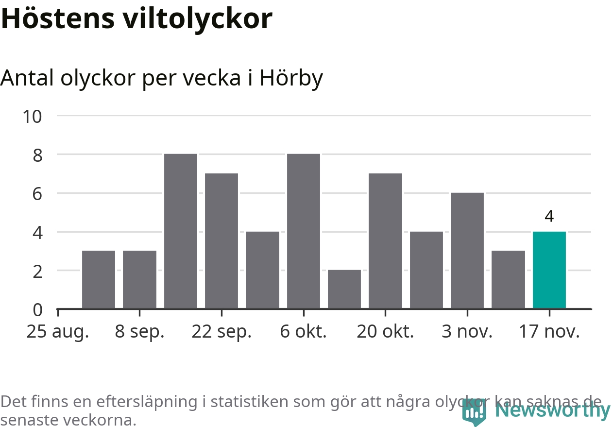 Hittills har fyra viltolyckor rapporterats in i Hörby kommun från vecka 47. Se listan här.