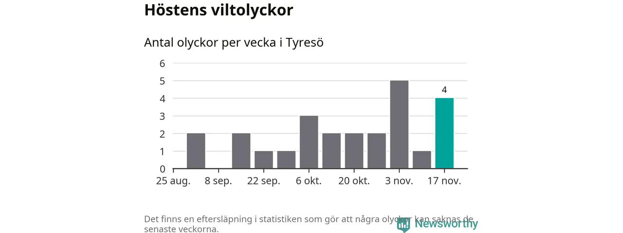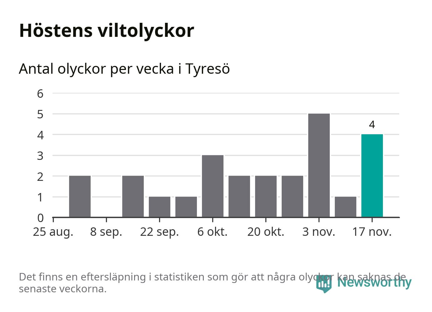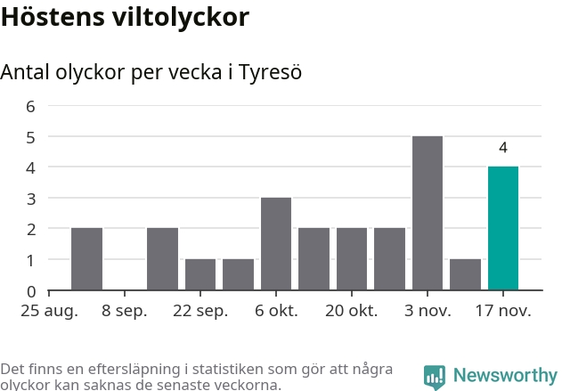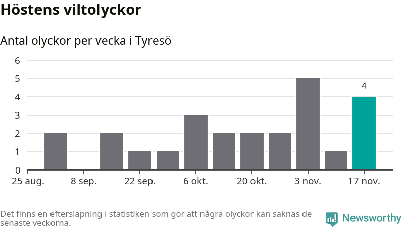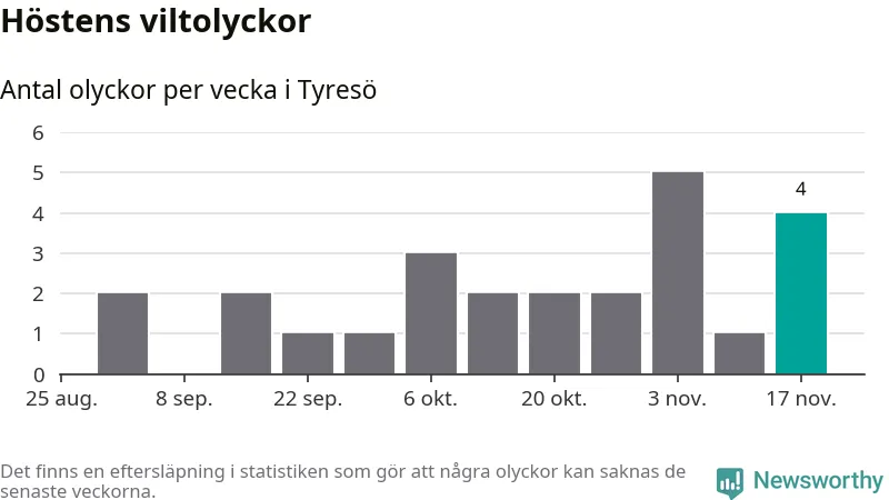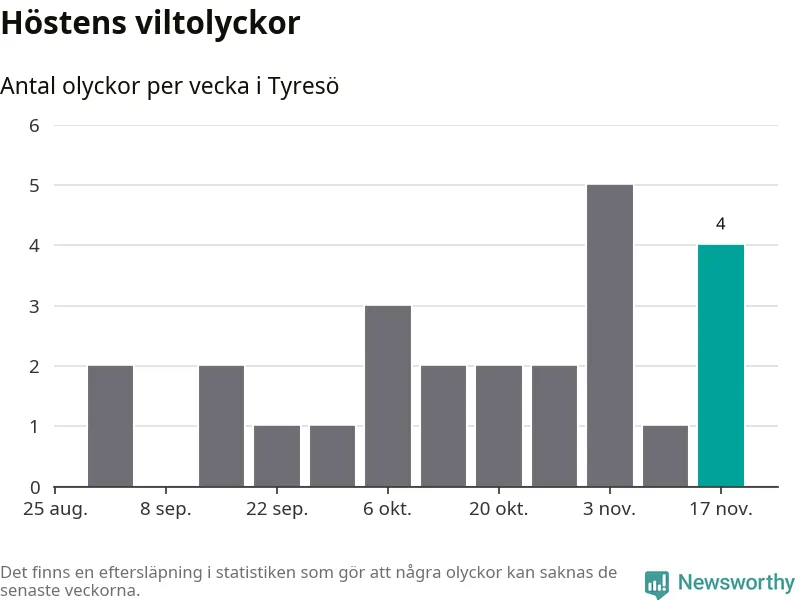 Hittills har fyra viltolyckor rapporterats in i Tyresö kommun från vecka 47. Se listan här.