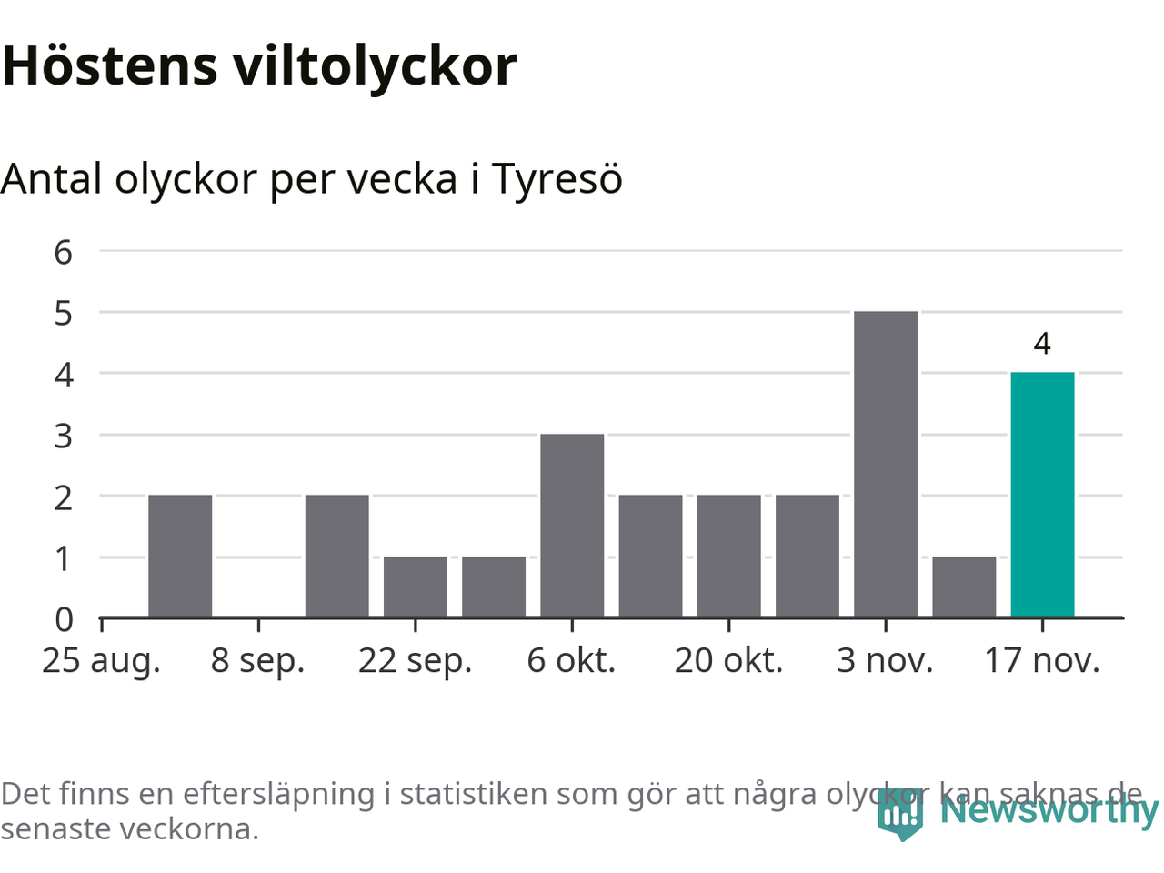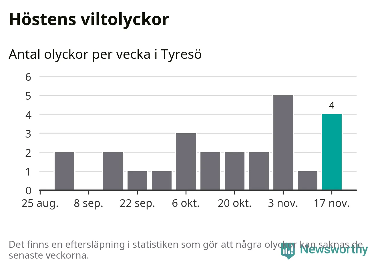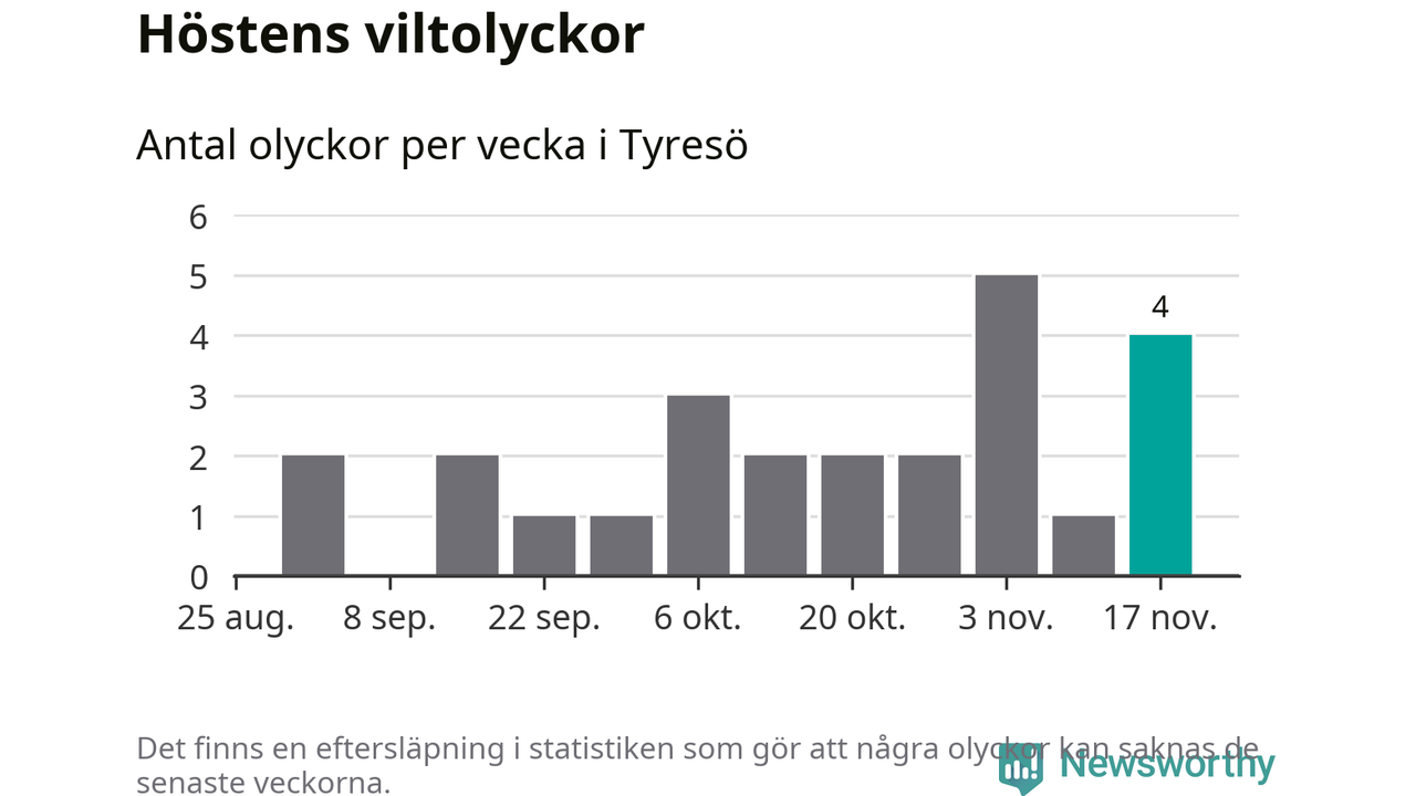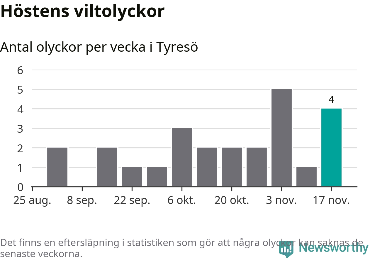 Hittills har fyra viltolyckor rapporterats in i Tyresö kommun från vecka 47. Se listan här.