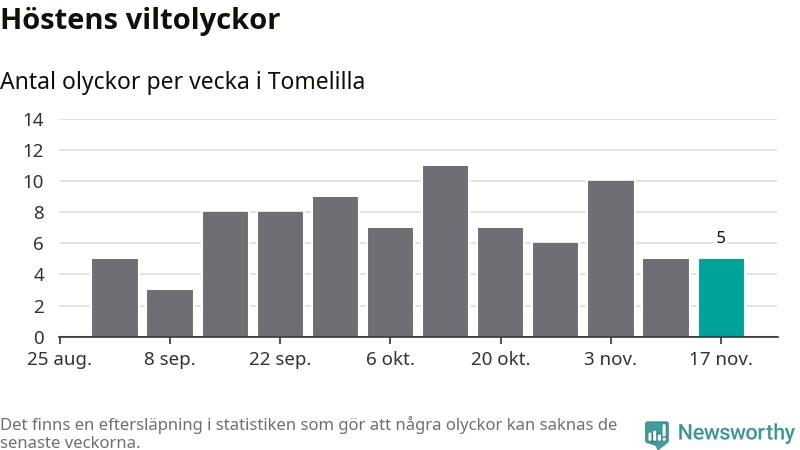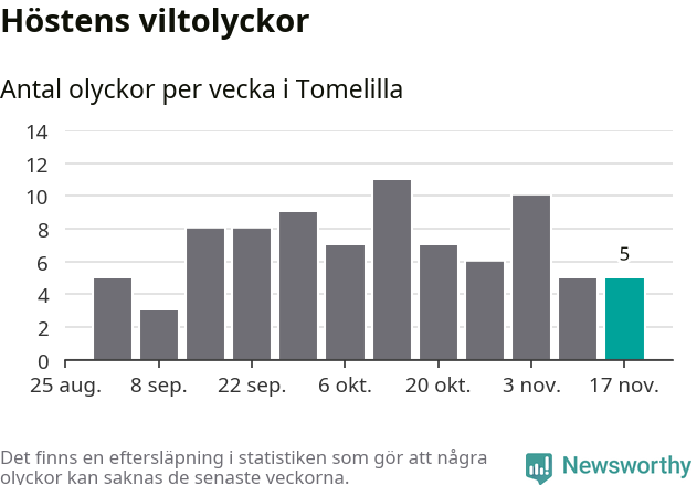 Totalt den här hösten har det inträffat 84 viltolyckor i kommunen. Det är en normal nivå i förhållande till hur det har sett ut under de senaste tio åren – genomsnittet för motsvarande period är 75.