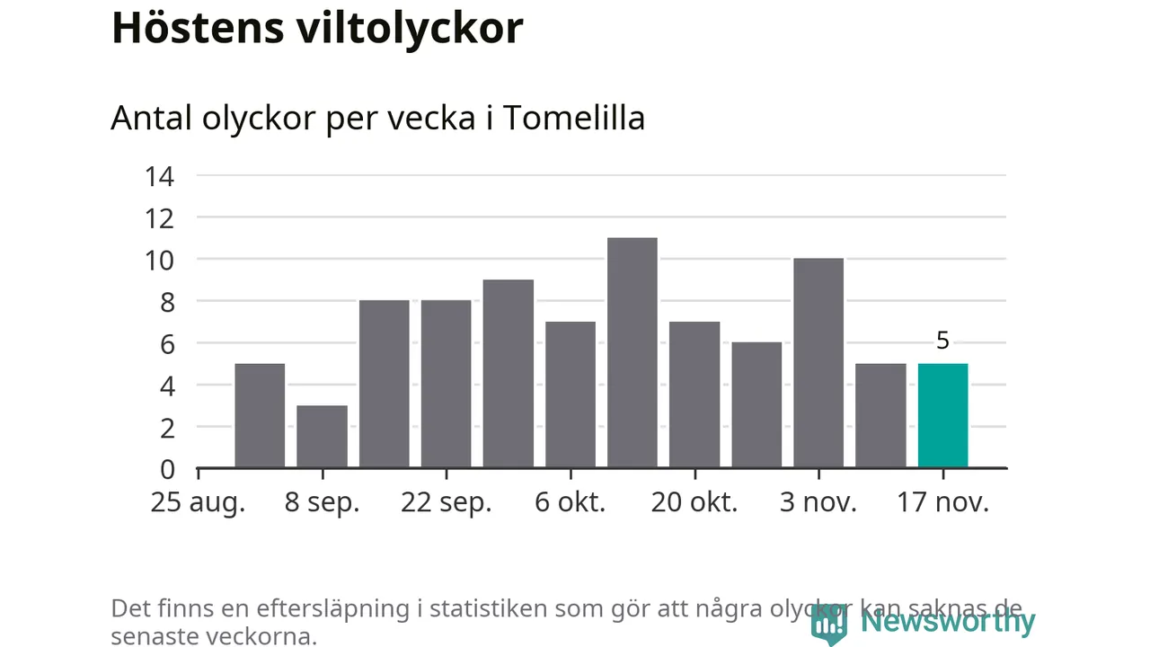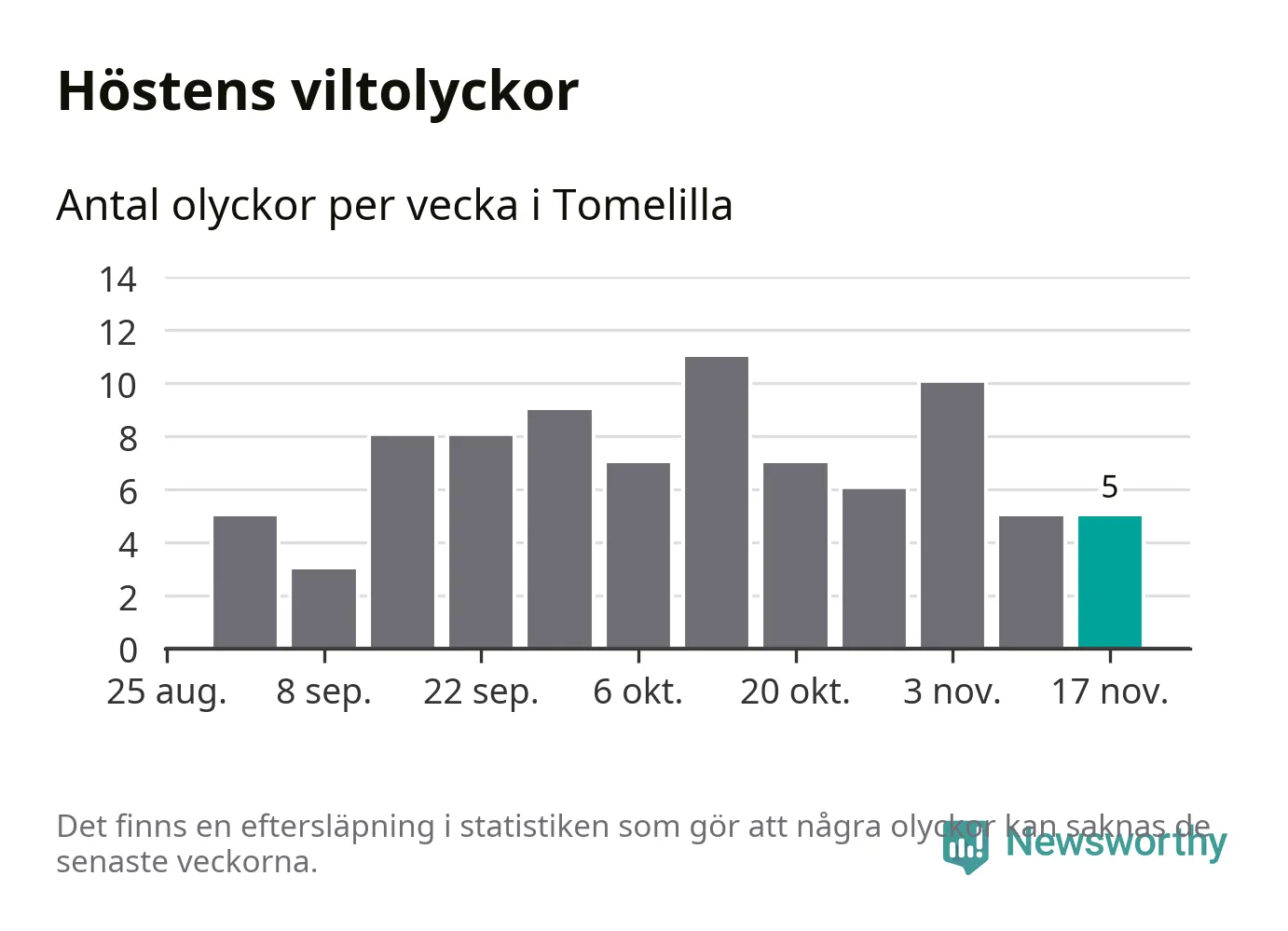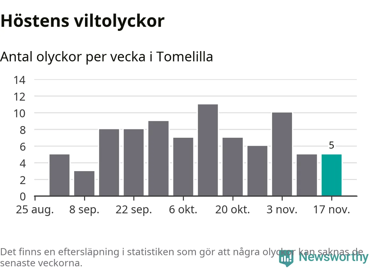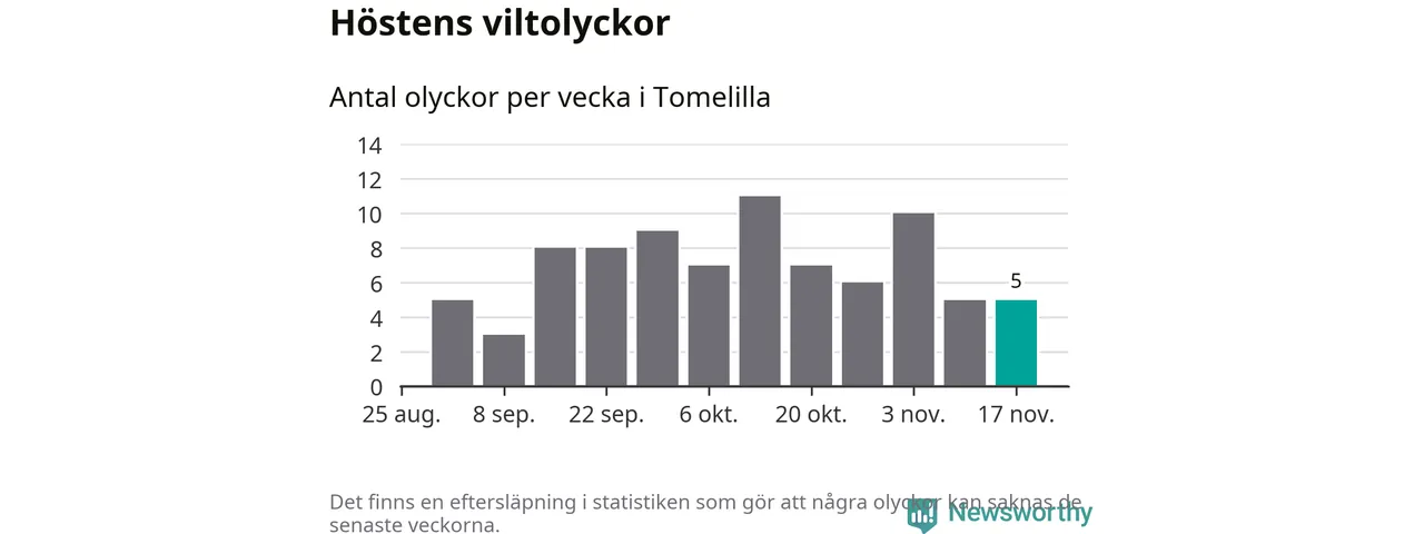 Hittills har fem viltolyckor rapporterats in i Tomelilla kommun från vecka 47. Se listan här.