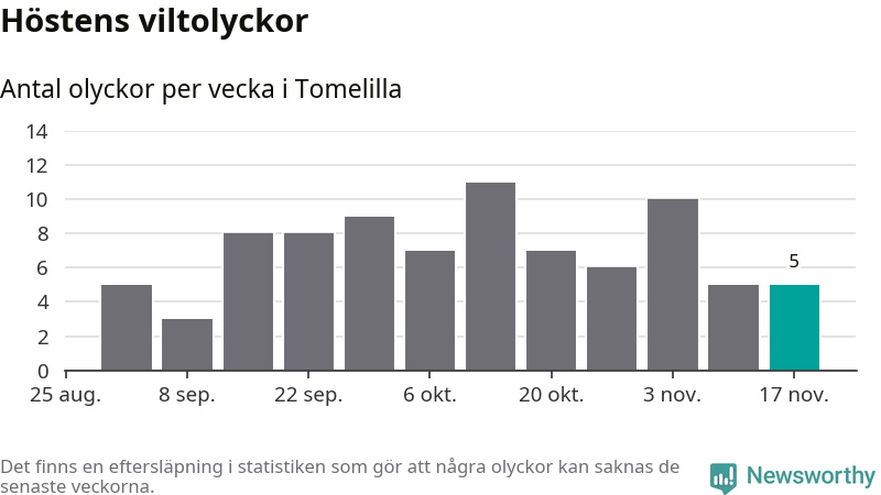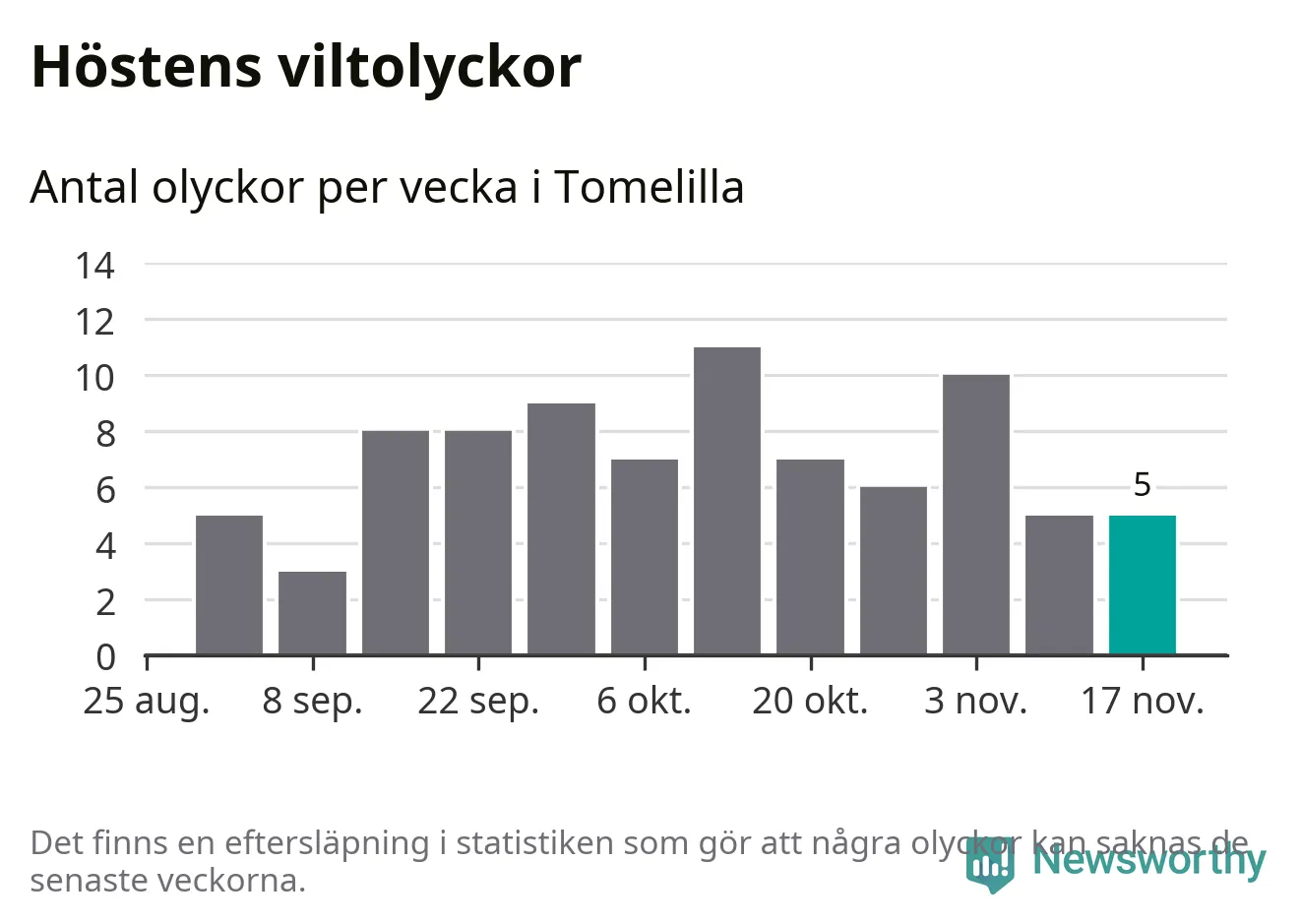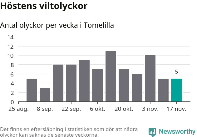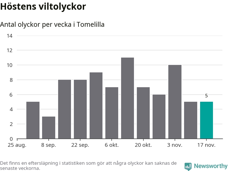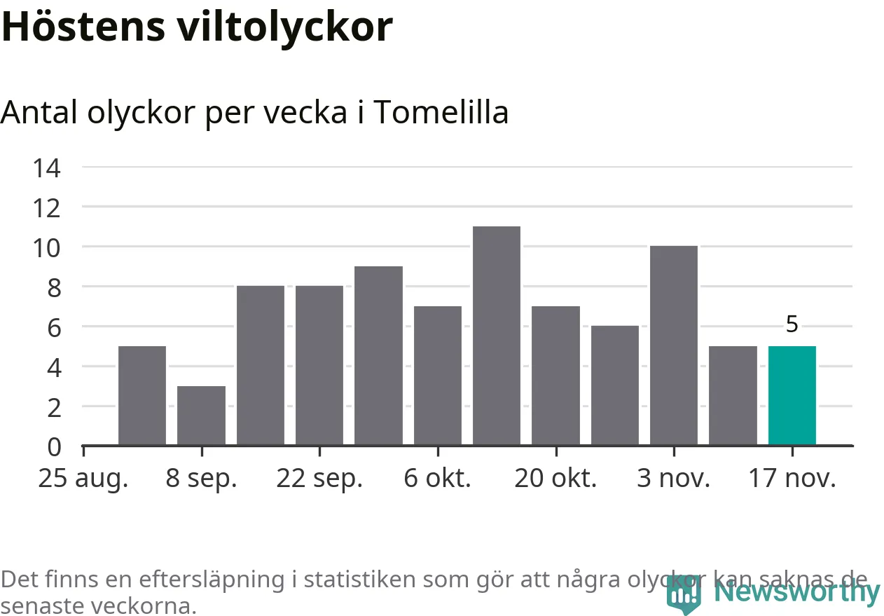 Hittills har fem viltolyckor rapporterats in i Tomelilla kommun från vecka 47. Se listan här.
