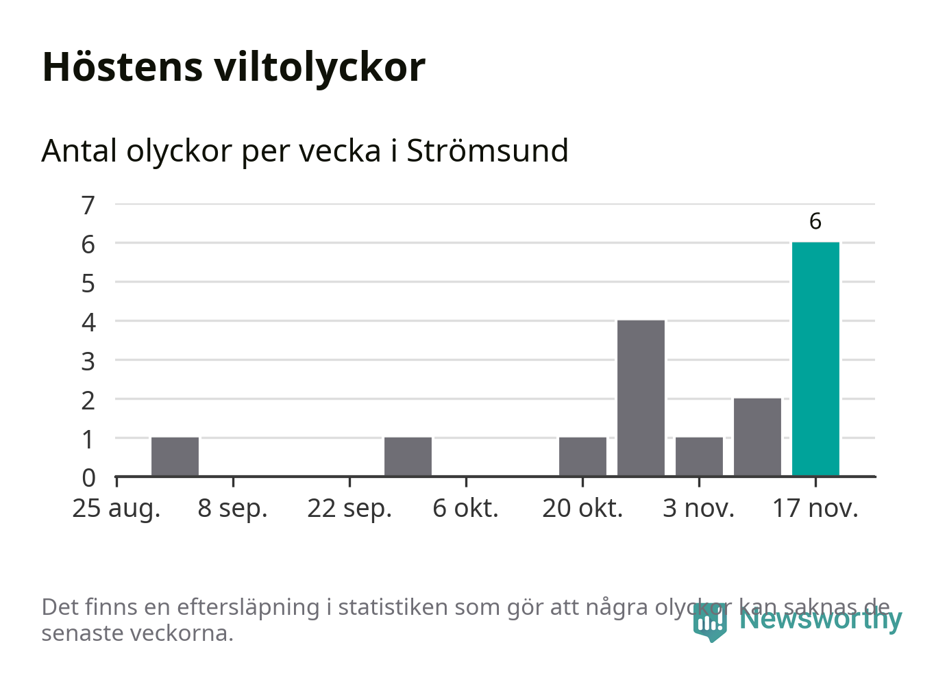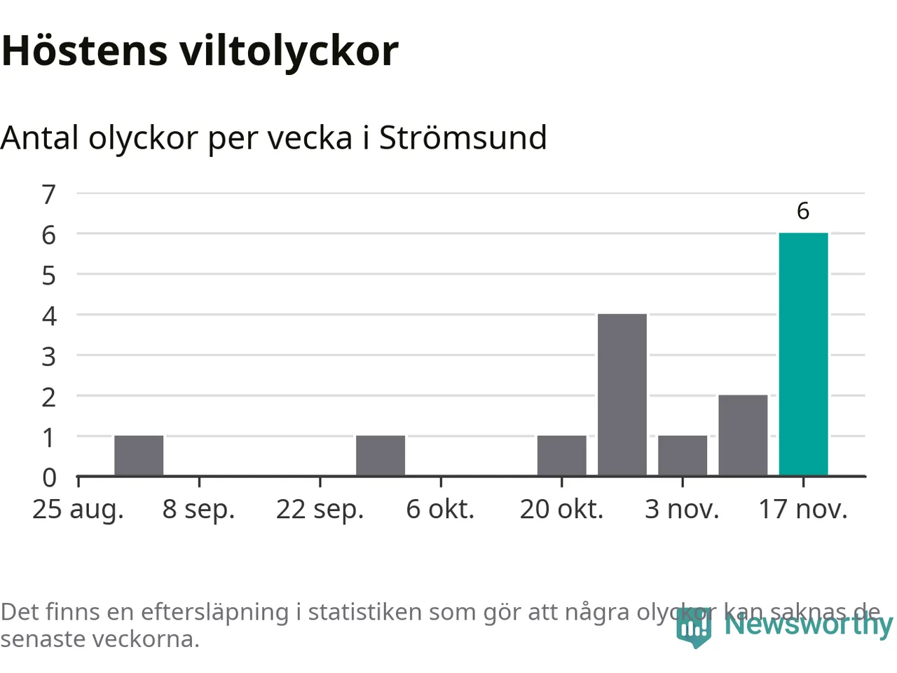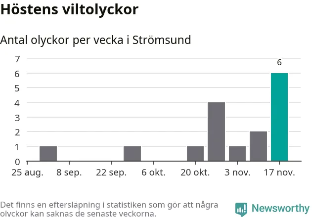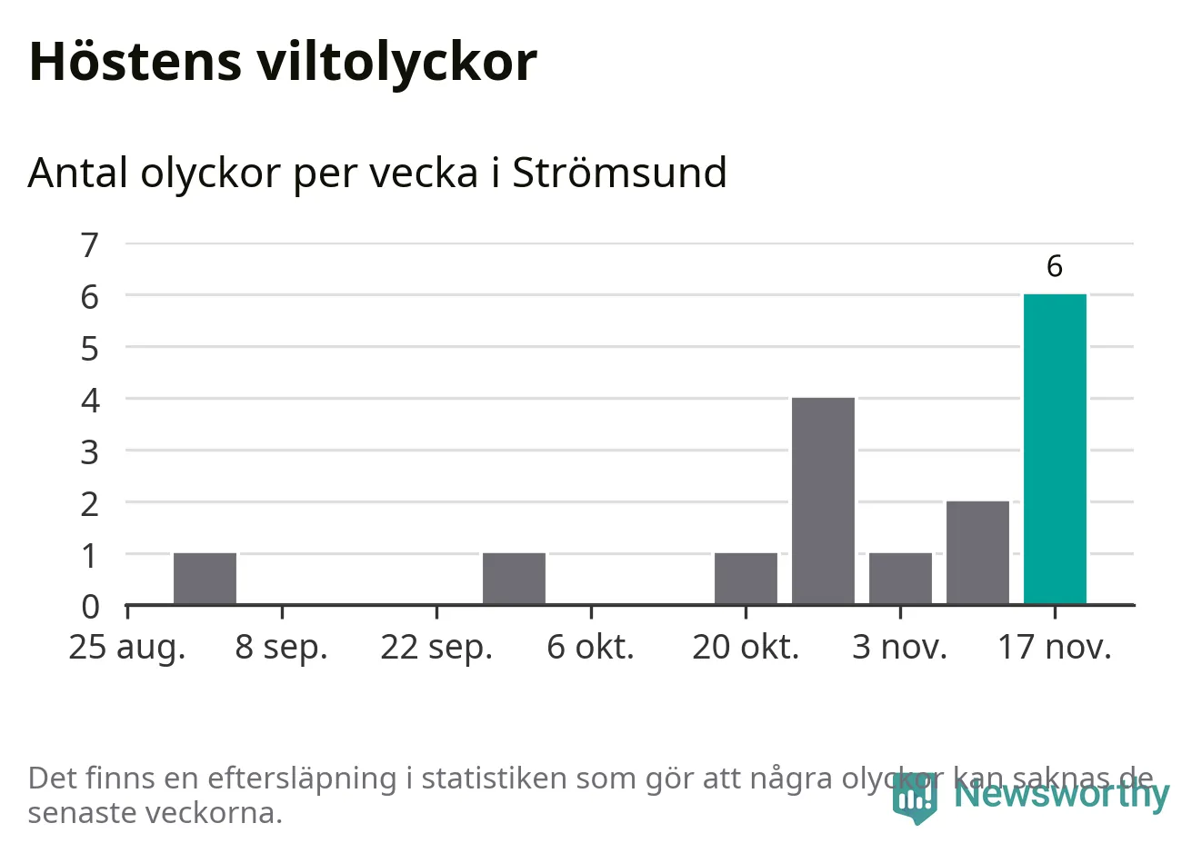 Hittills har sex viltolyckor rapporterats in i Strömsunds kommun från vecka 47. Se listan här.