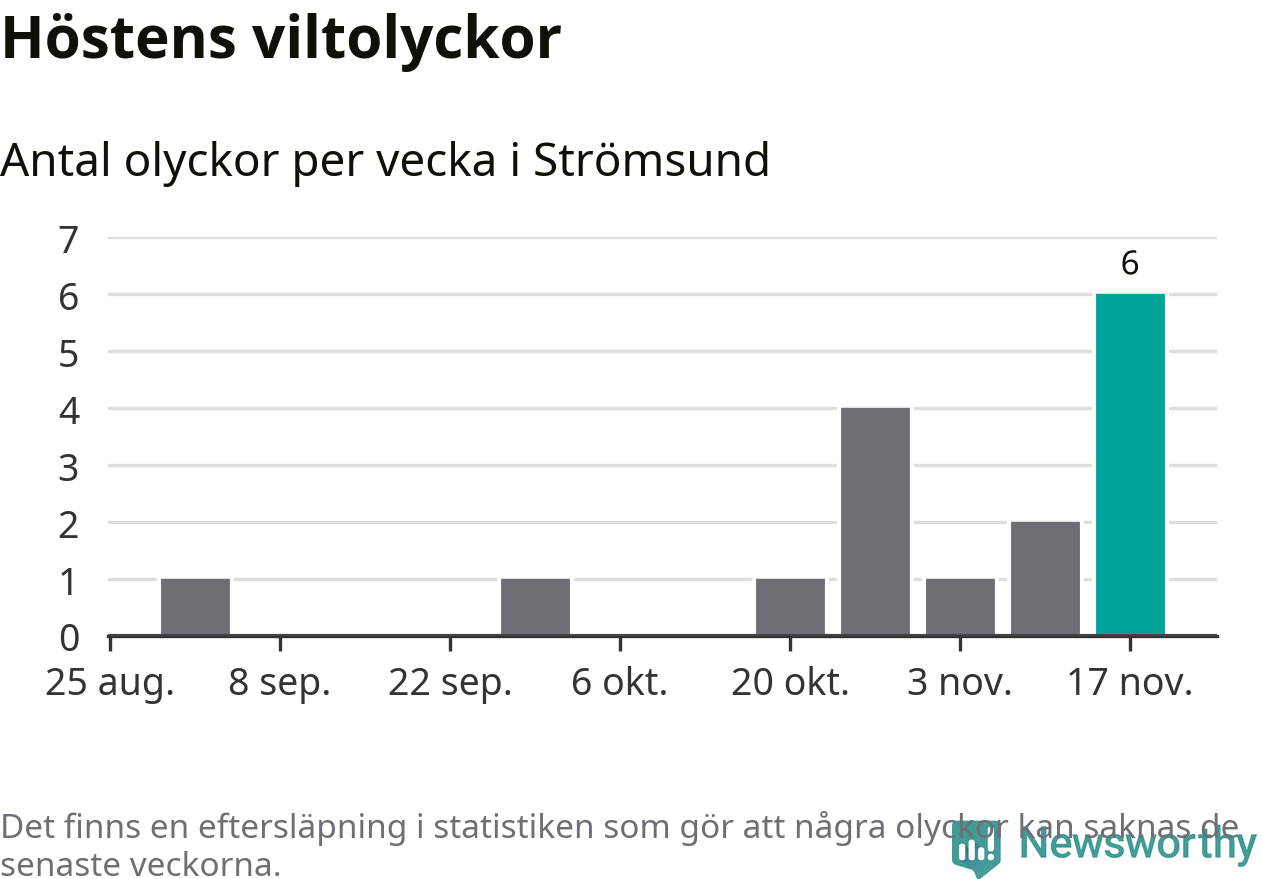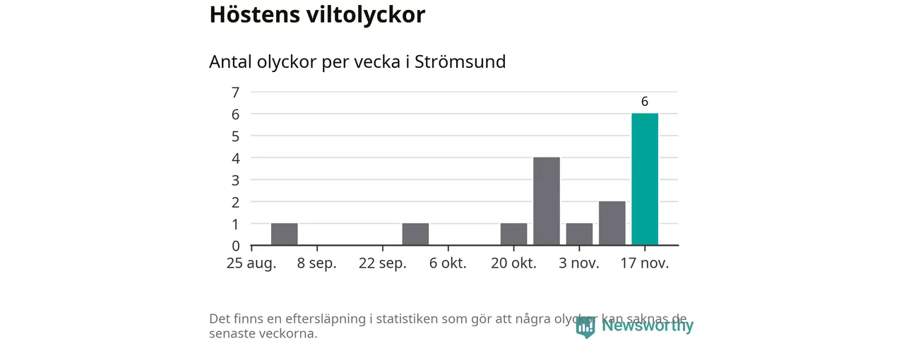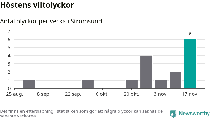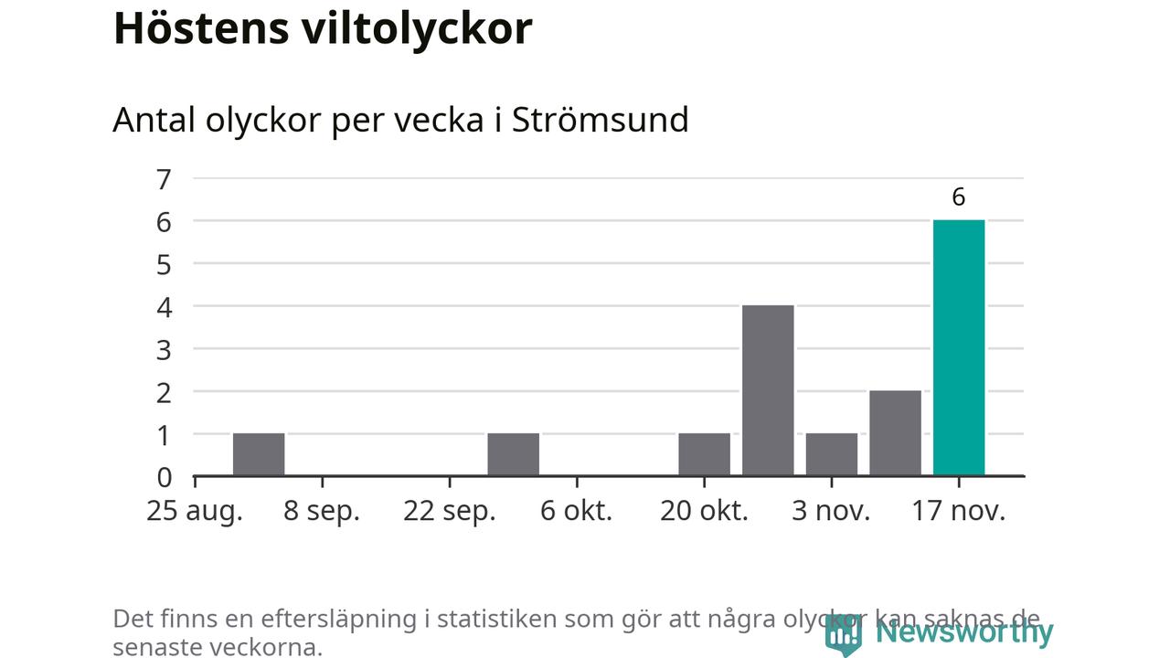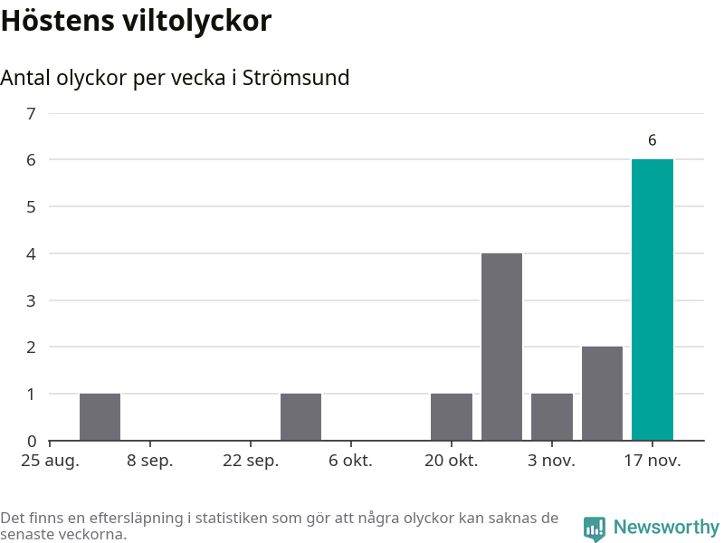 Hittills har sex viltolyckor rapporterats in i Strömsunds kommun från vecka 47. Se listan här.