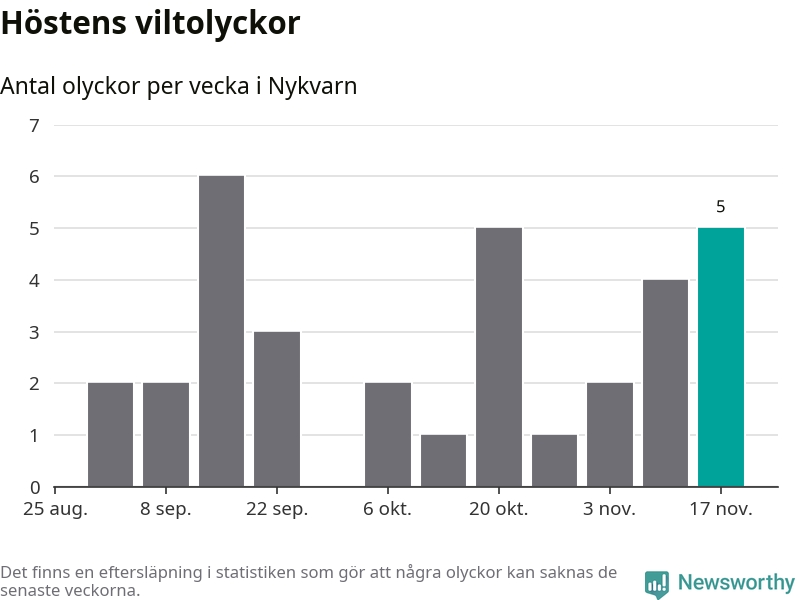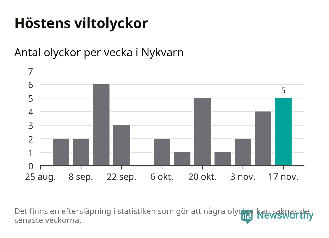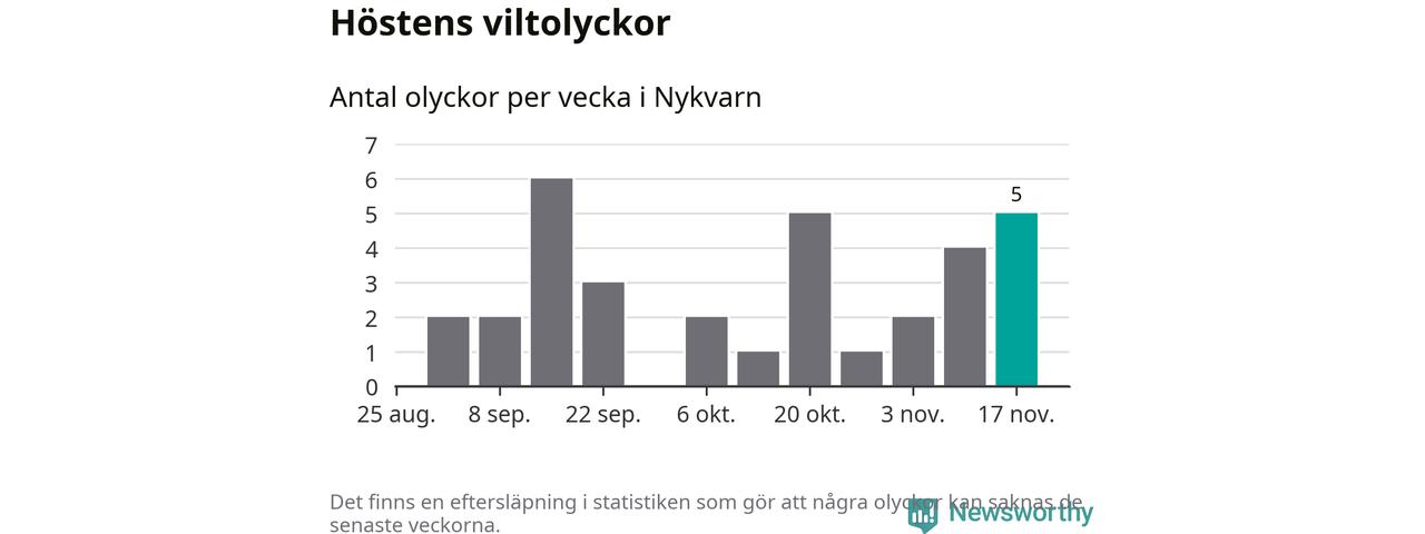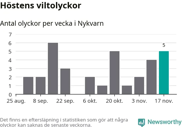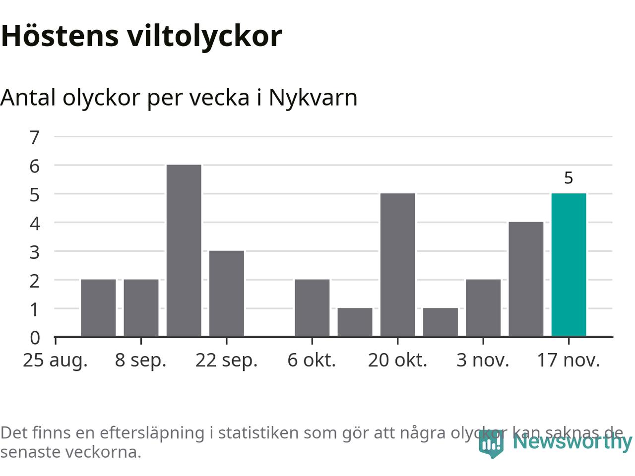 Hittills har fem viltolyckor rapporterats in i Nykvarns kommun från vecka 47. Se listan här.