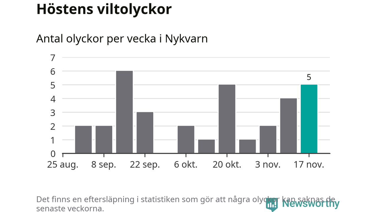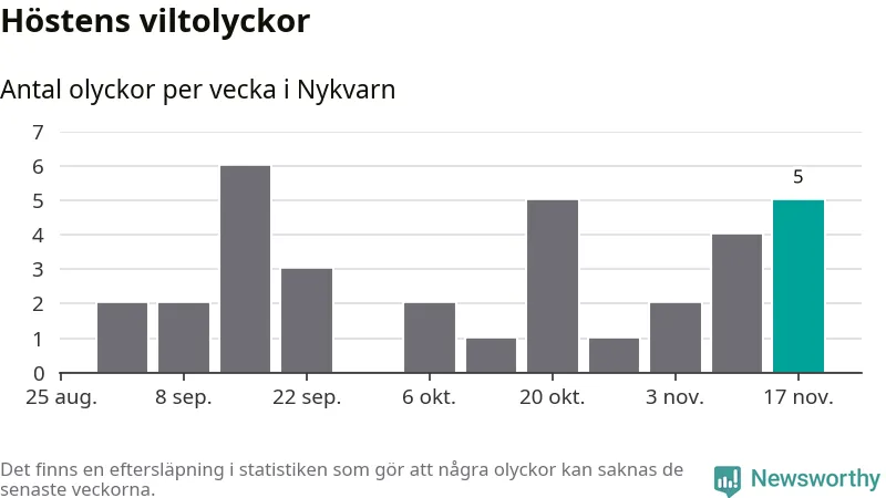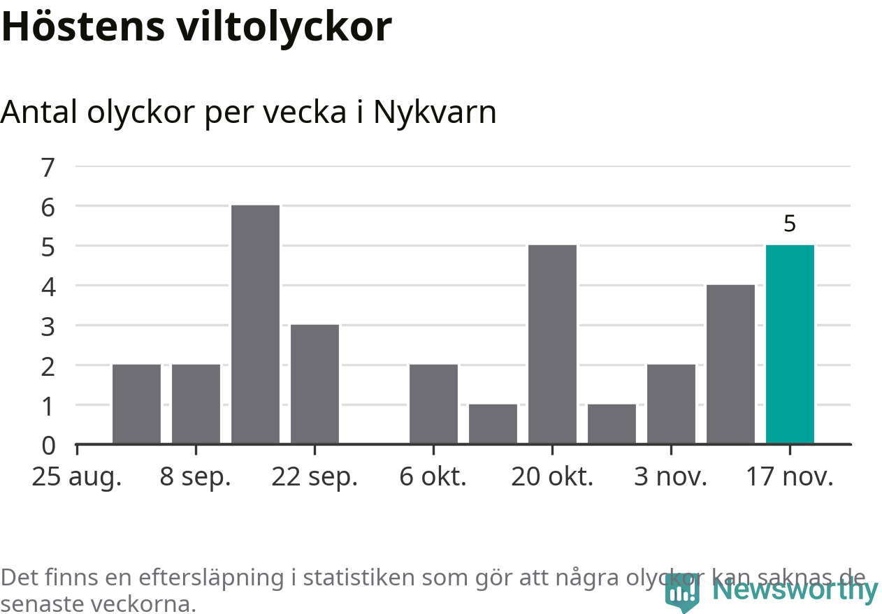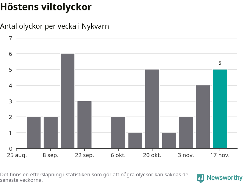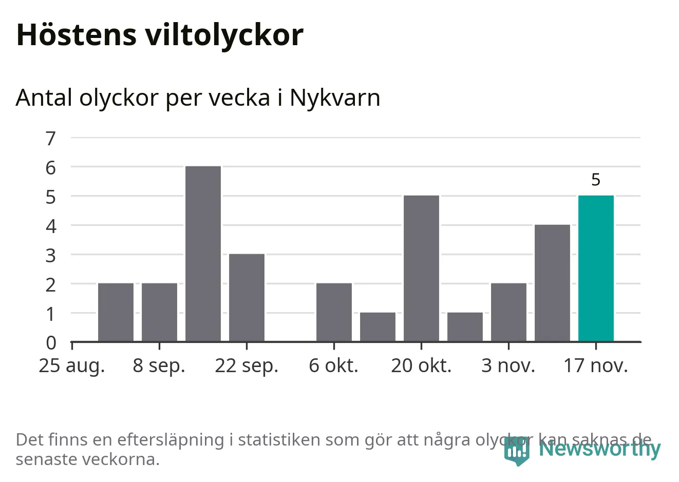 Hittills har fem viltolyckor rapporterats in i Nykvarns kommun från vecka 47. Se listan här.