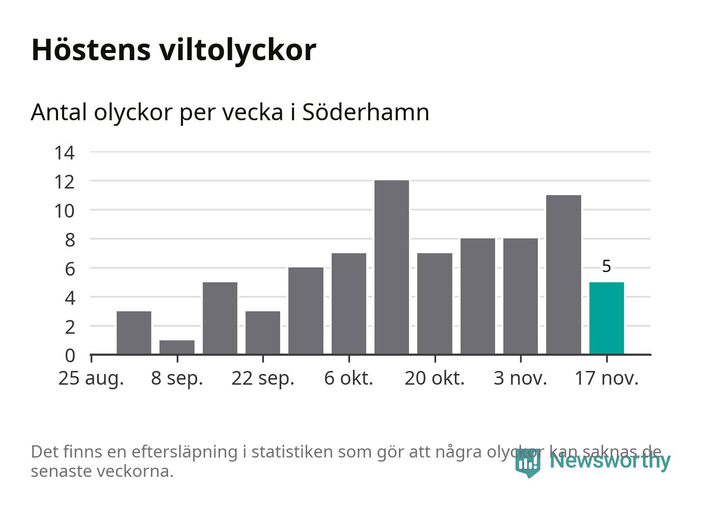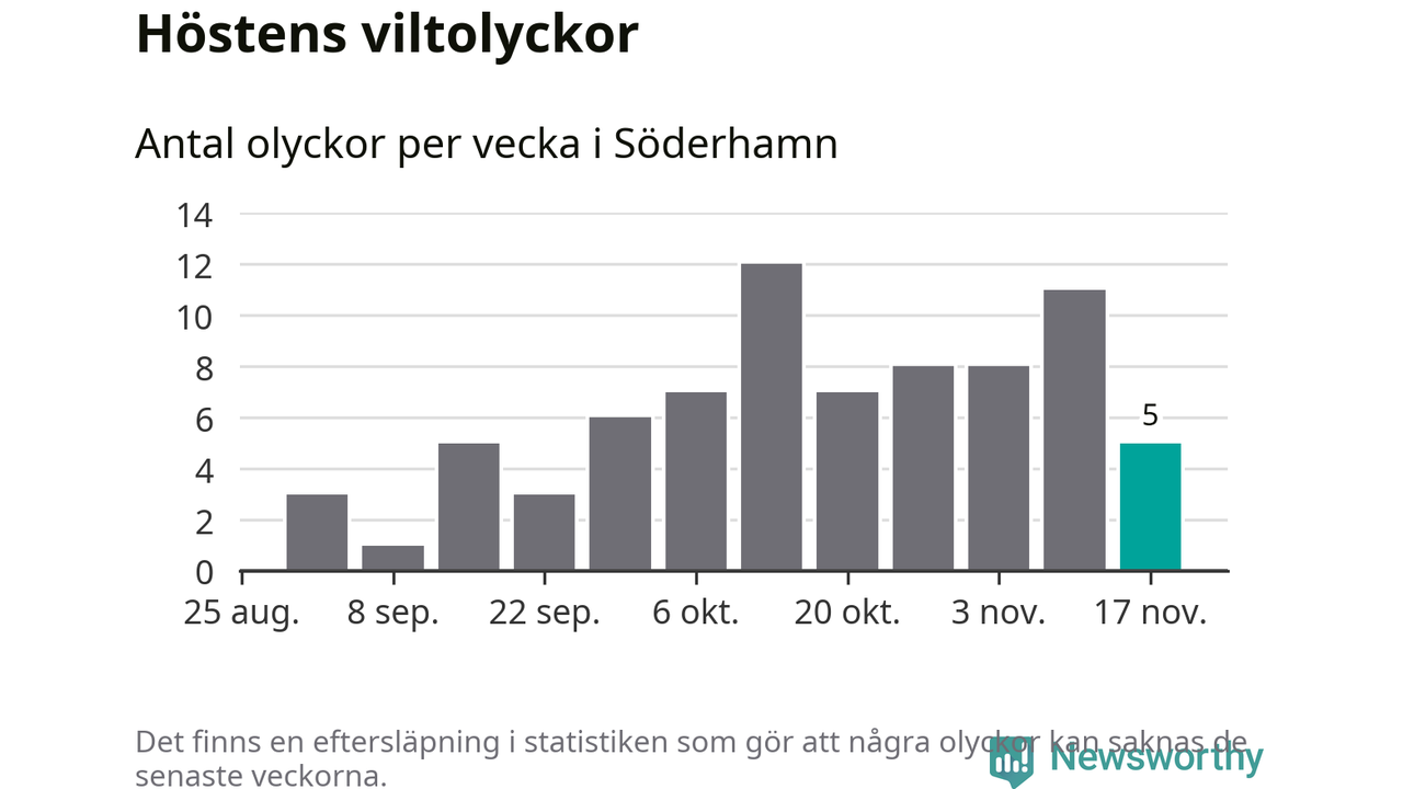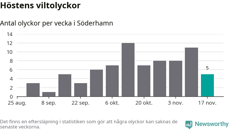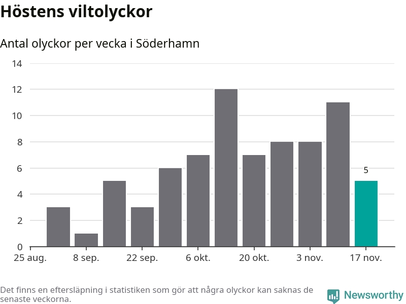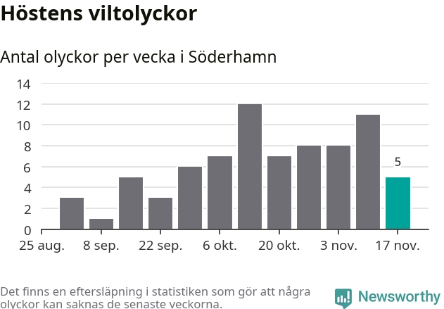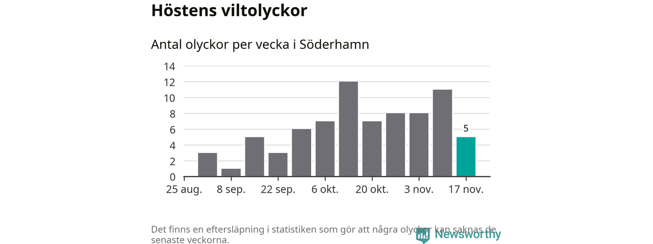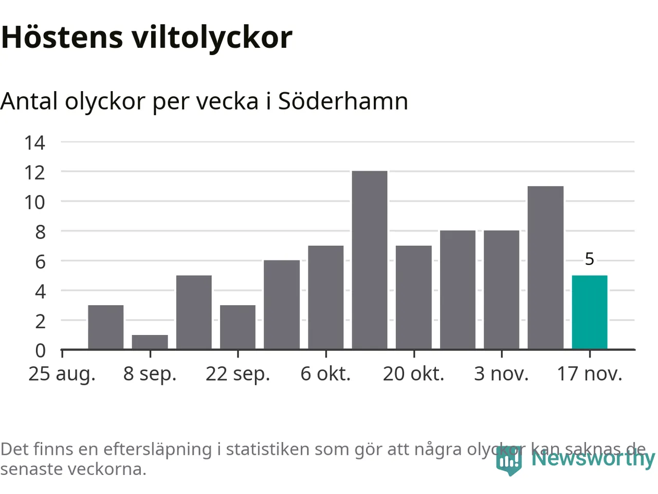 Hittills har fem viltolyckor rapporterats in i Söderhamns kommun från vecka 47. Se listan här.