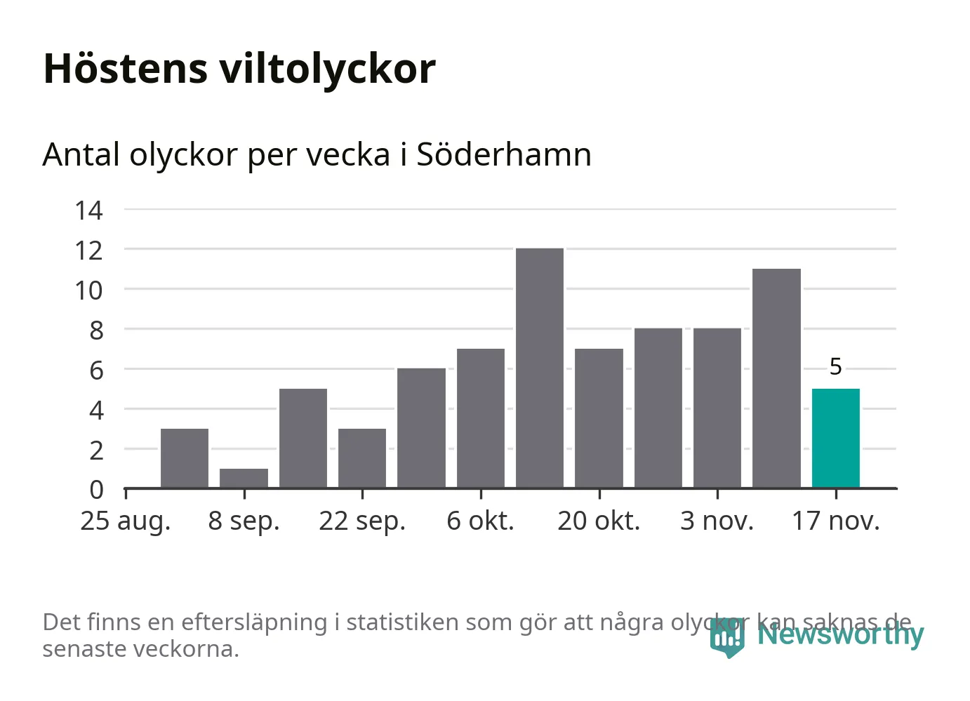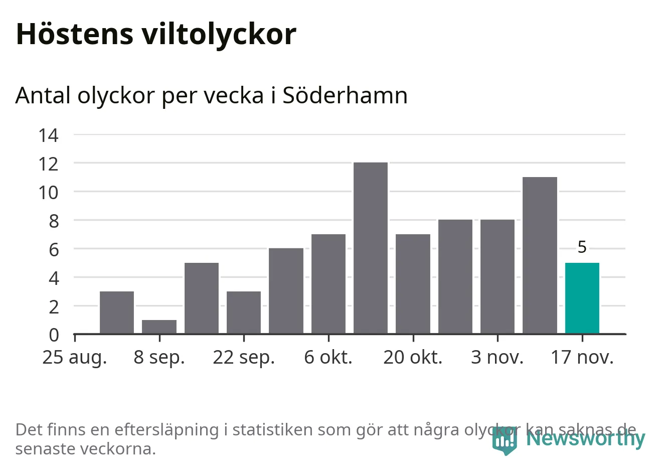 Totalt den här hösten har det inträffat 76 viltolyckor i kommunen. Det är mer än genomsnittet för motsvarande period (omkring 62) de senaste tio åren.