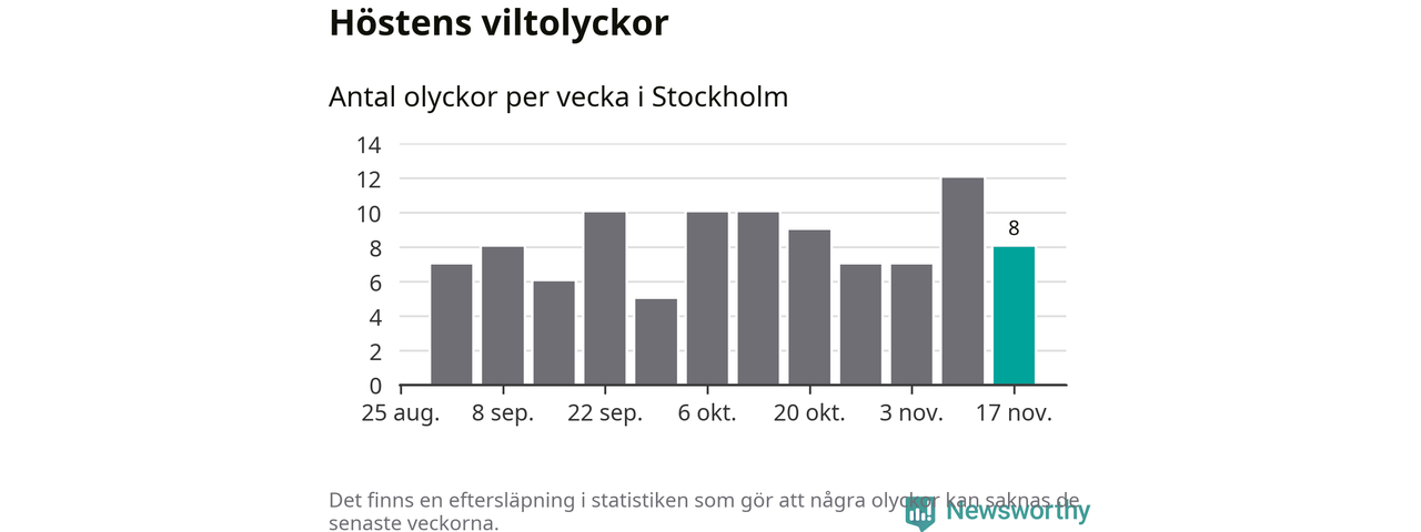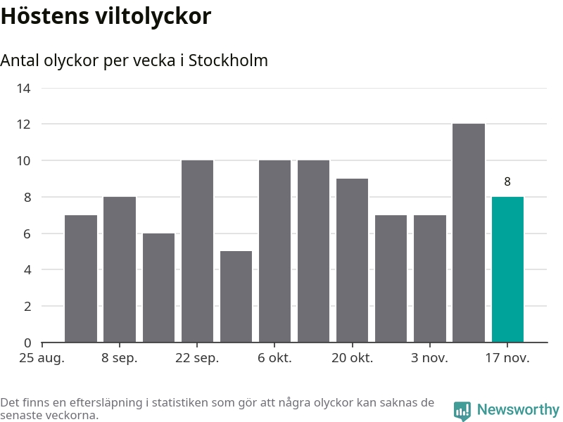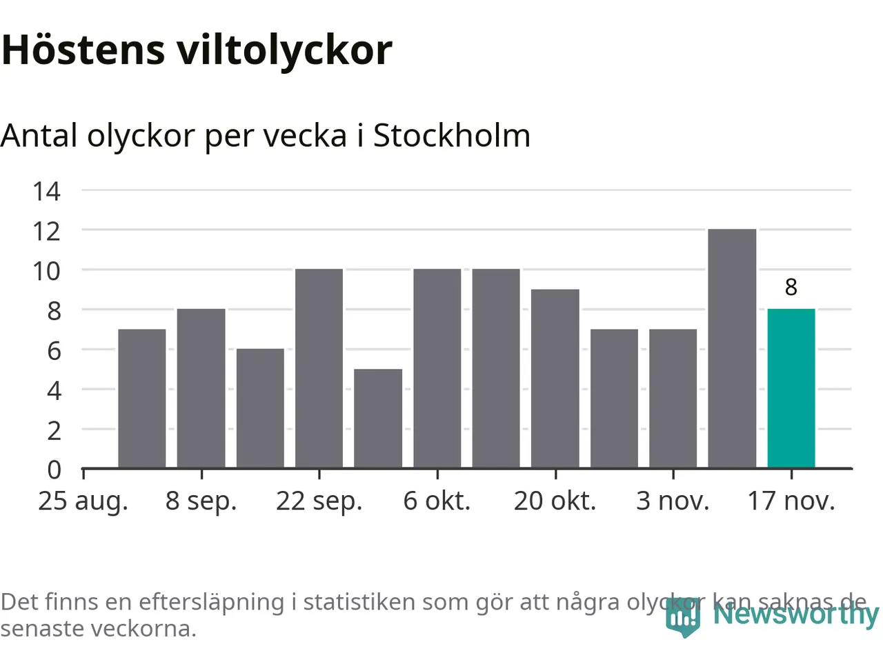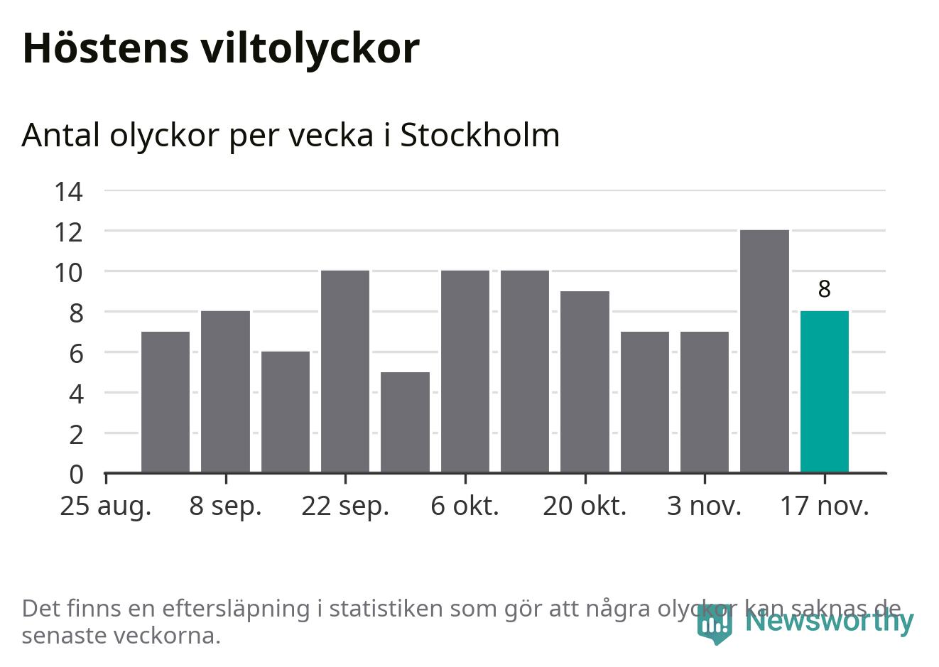 Hittills har åtta viltolyckor rapporterats in i Stockholms kommun från vecka 47. Se listan här.
