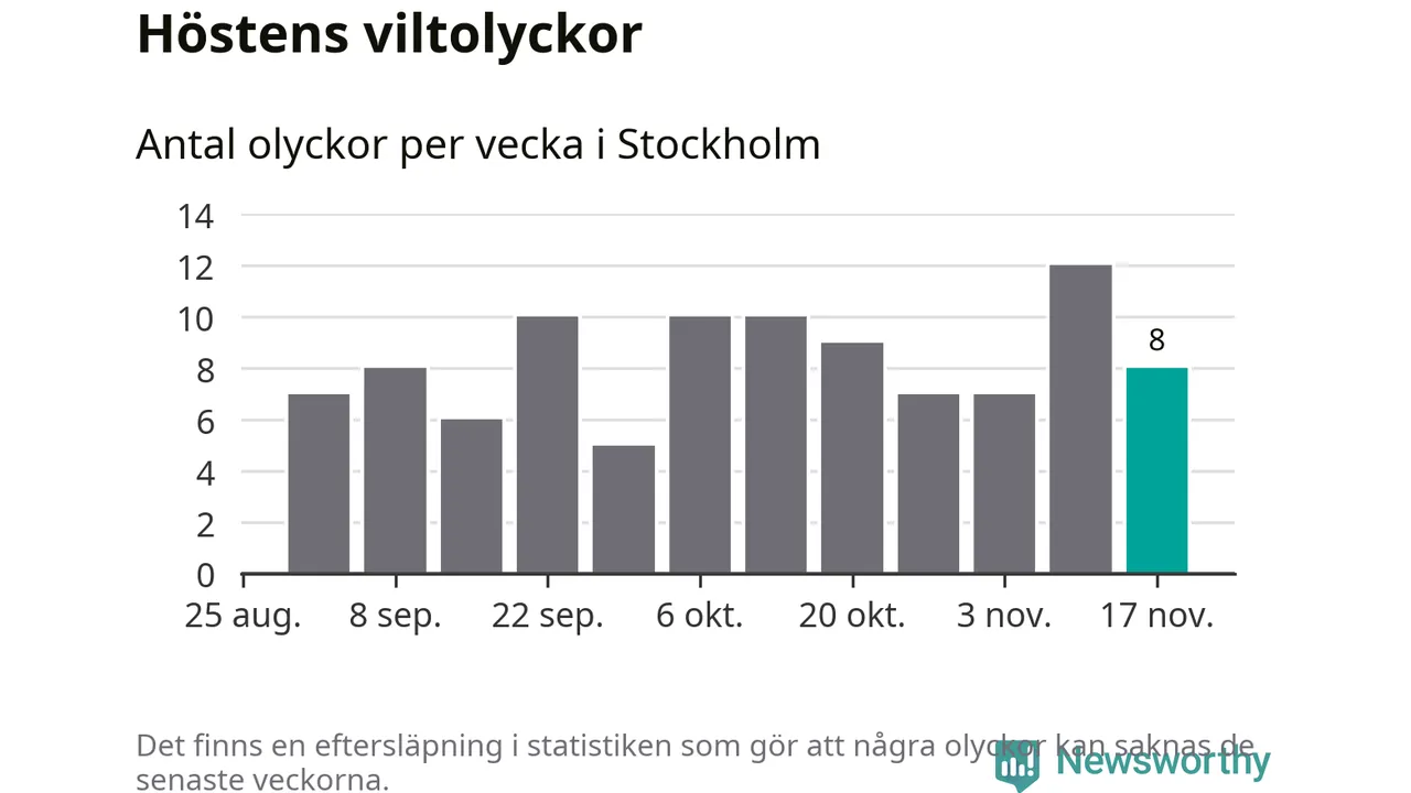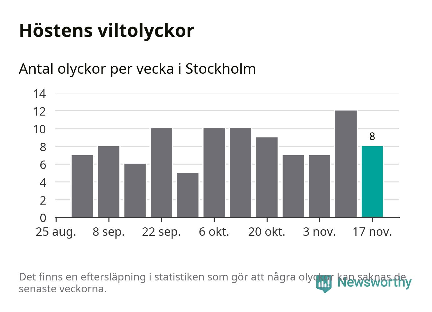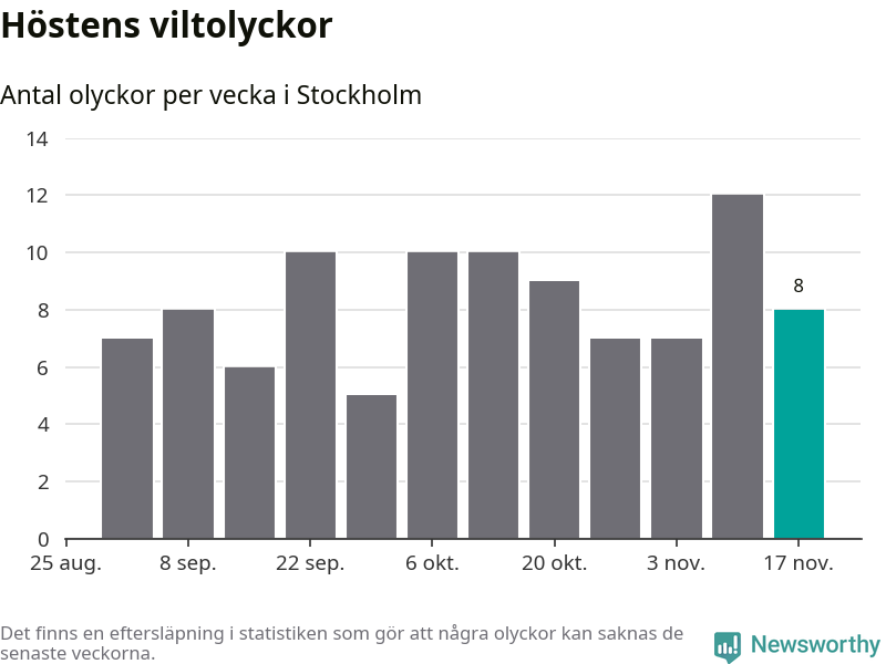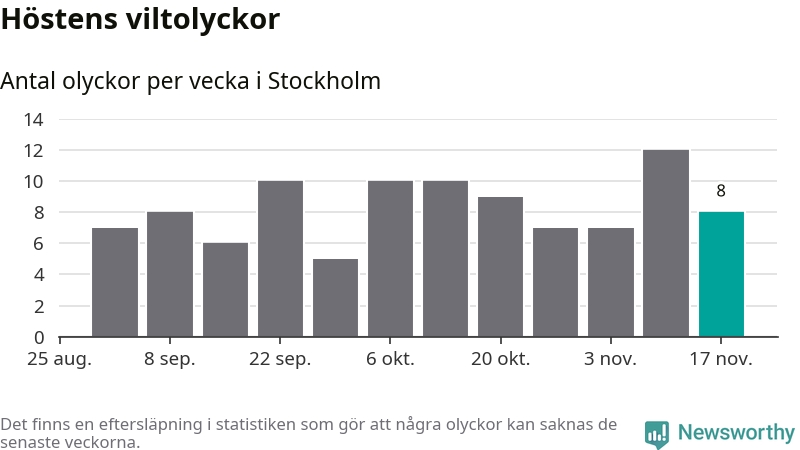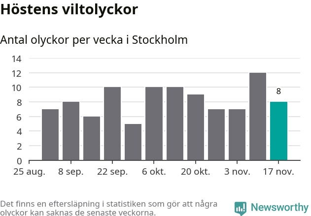 Hittills har åtta viltolyckor rapporterats in i Stockholms kommun från vecka 47. Se listan här.