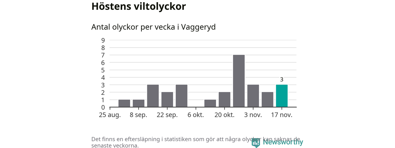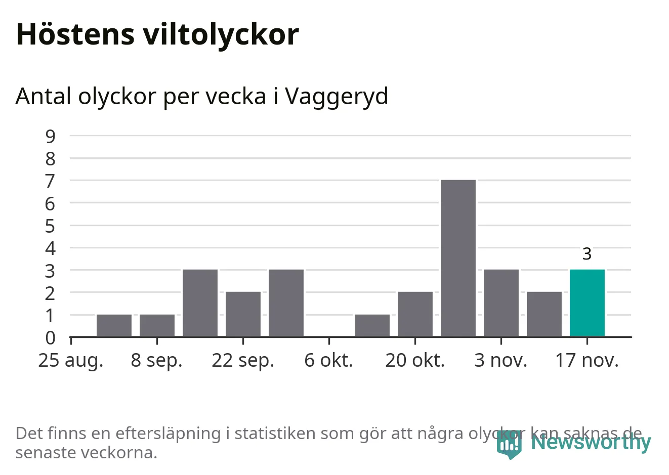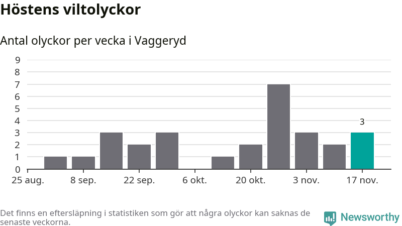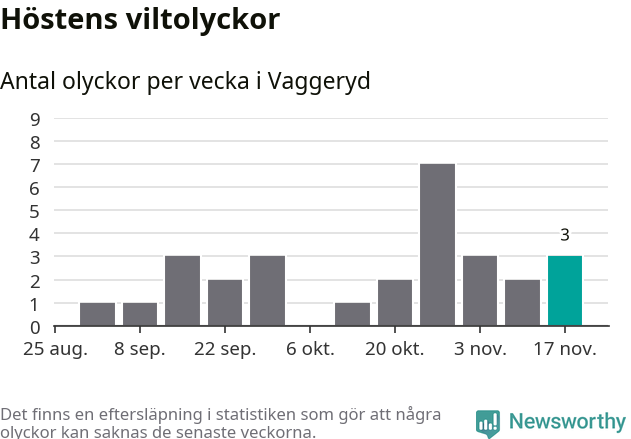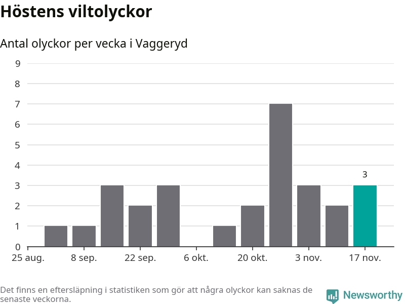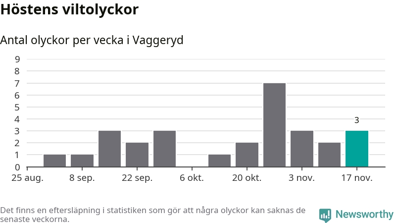 Hittills har tre viltolyckor rapporterats in i Vaggeryds kommun från vecka 47. Se listan här.
