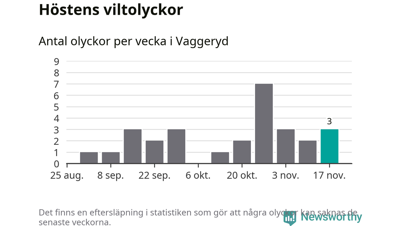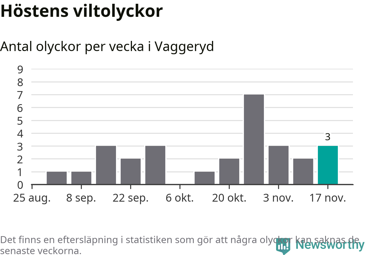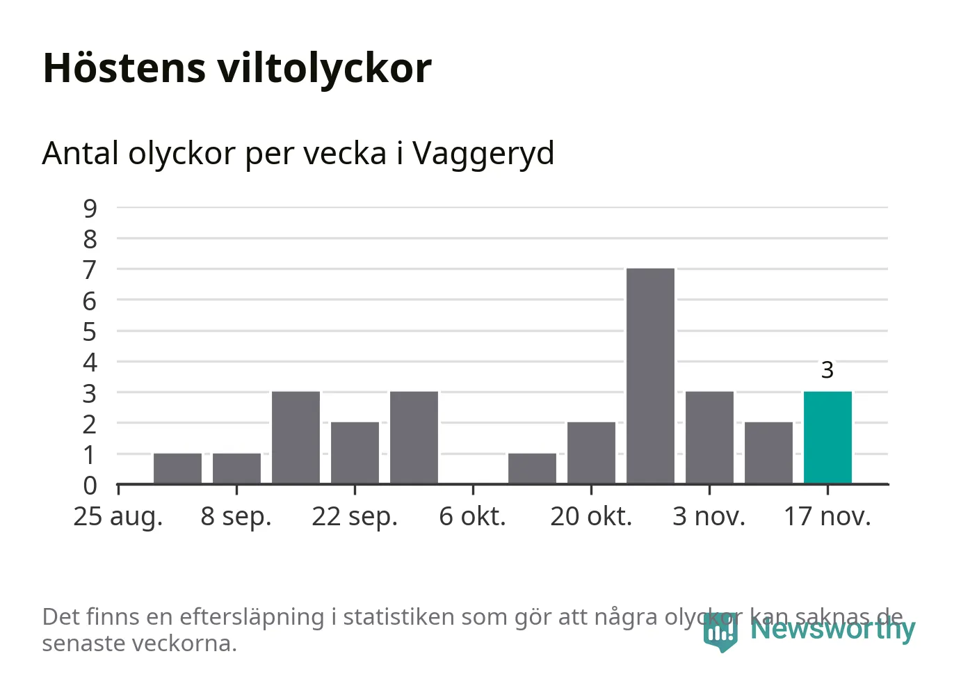 Hittills har tre viltolyckor rapporterats in i Vaggeryds kommun från vecka 47. Se listan här.