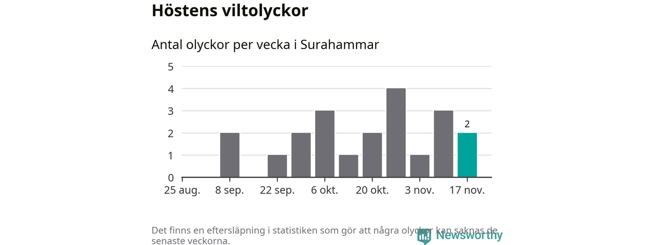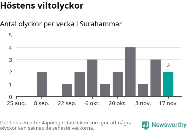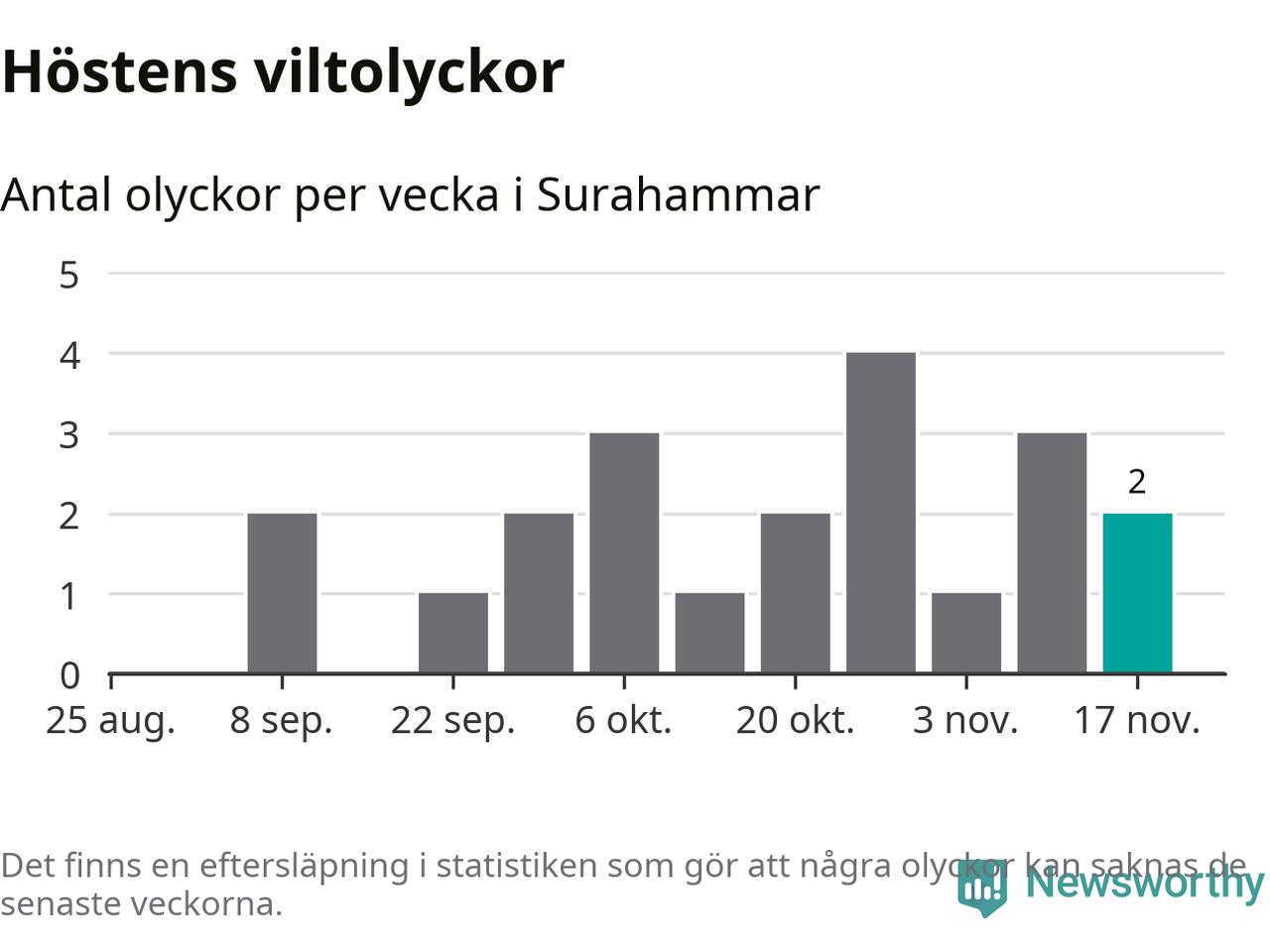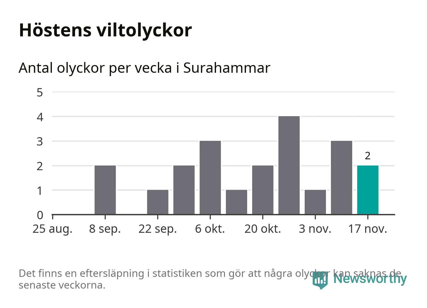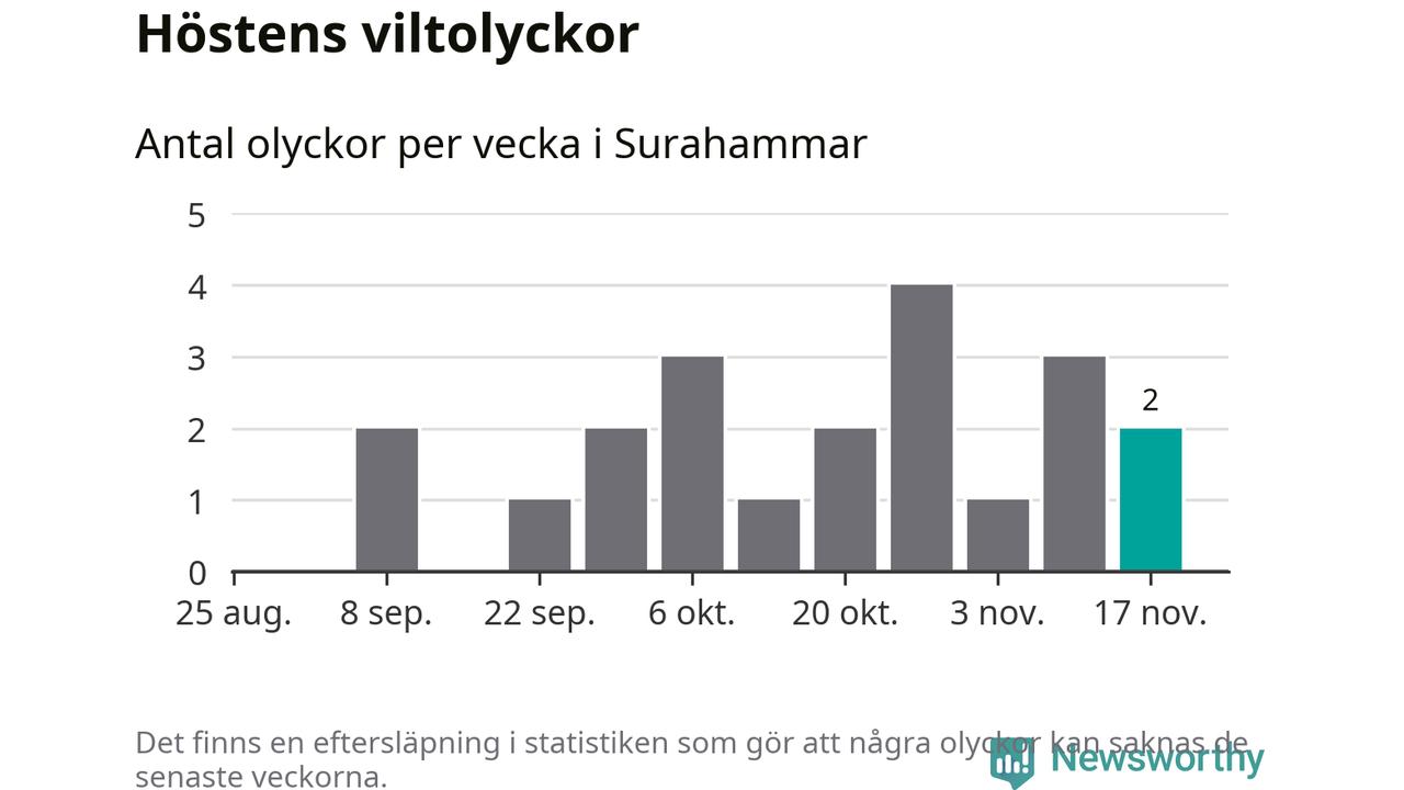 Hittills har två viltolyckor rapporterats in i Surahammars kommun från vecka 47. Se listan här.