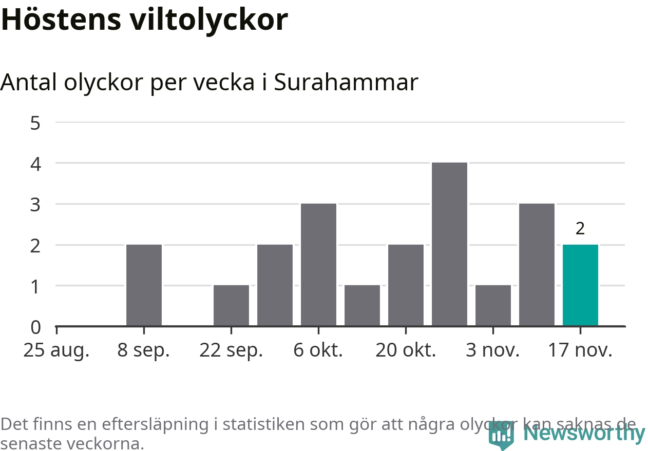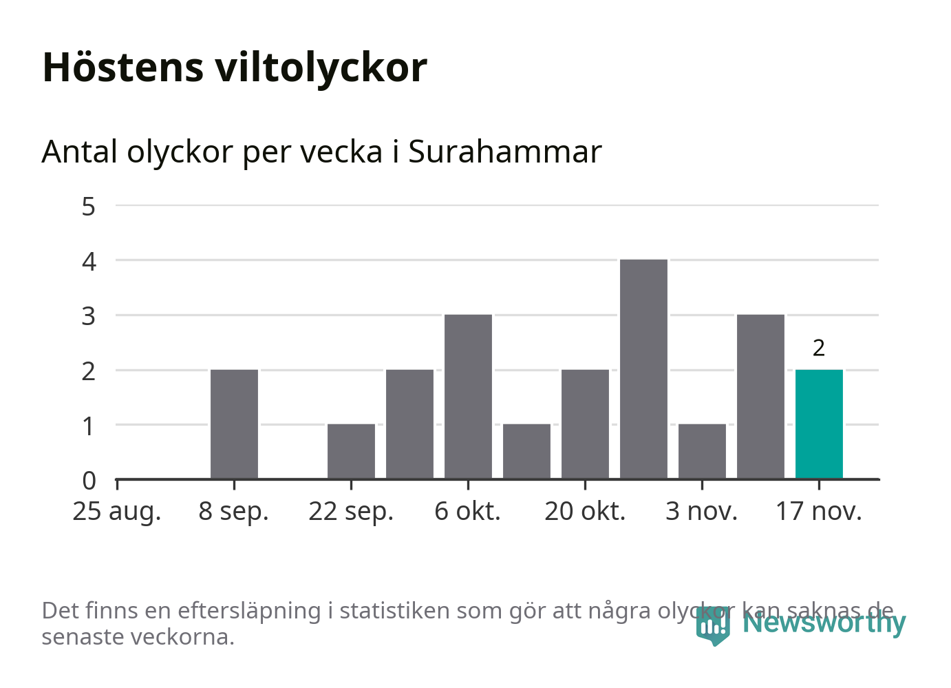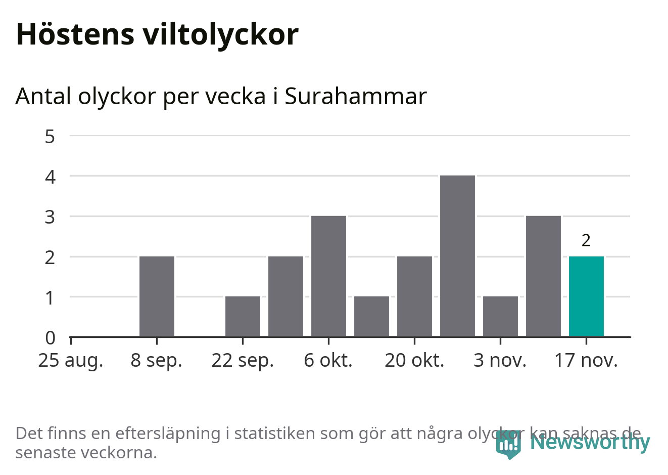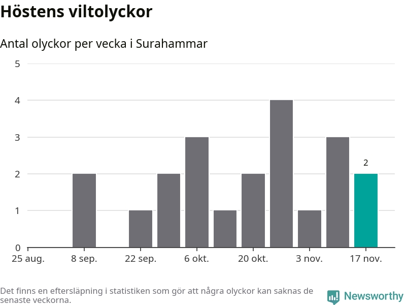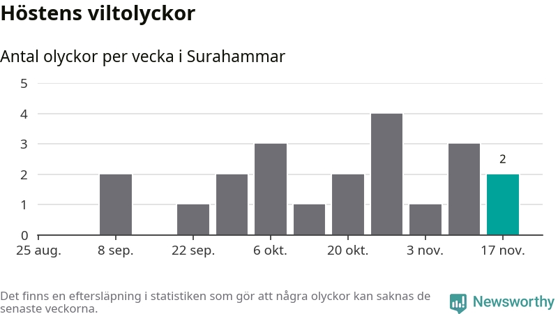 Hittills har två viltolyckor rapporterats in i Surahammars kommun från vecka 47. Se listan här.