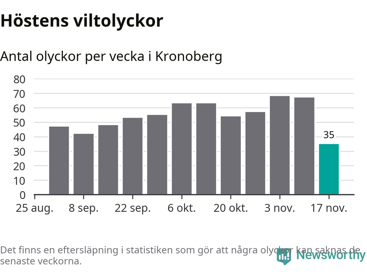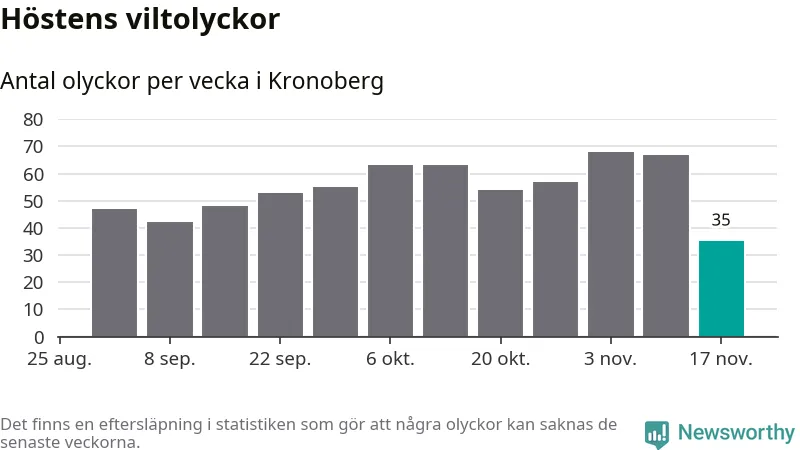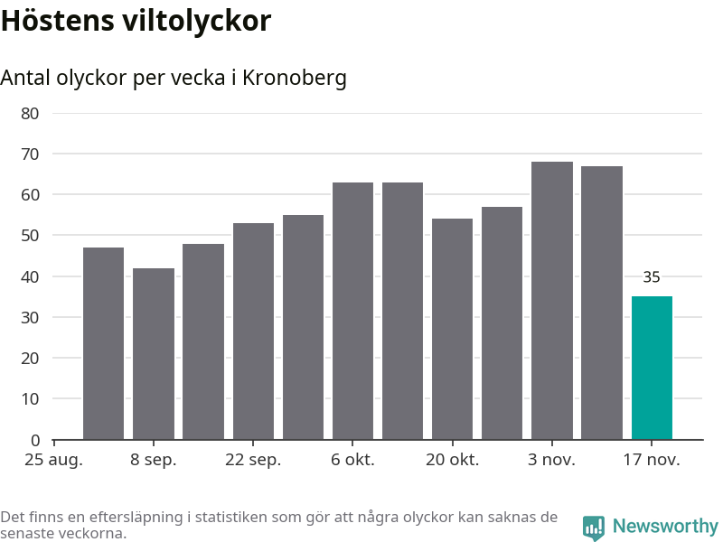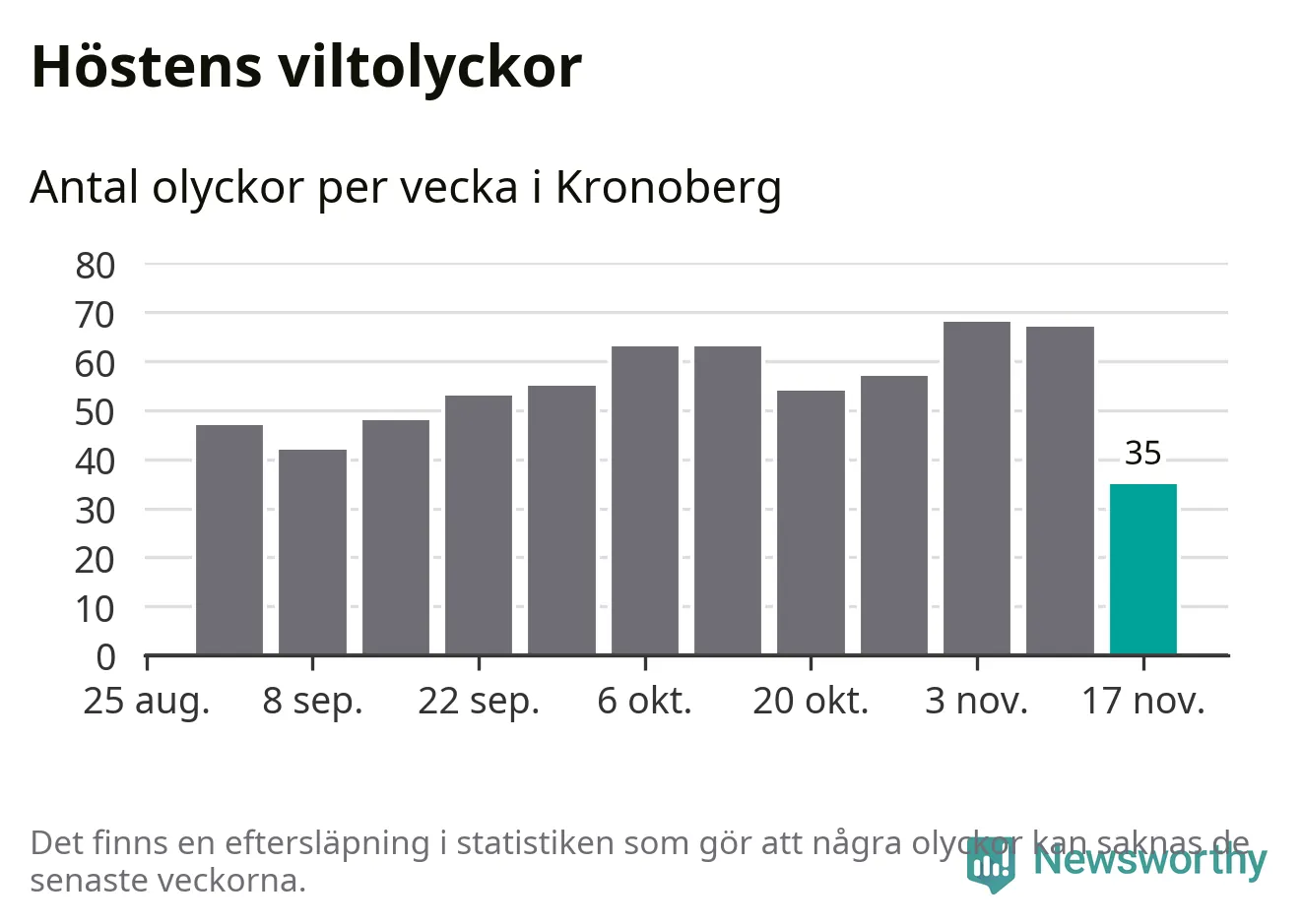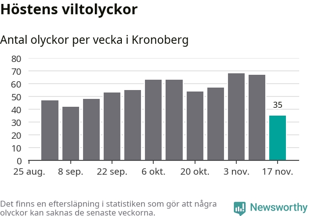 Hittills har 35 viltolyckor rapporterats in i Kronobergs län från vecka 47. Se listan här.