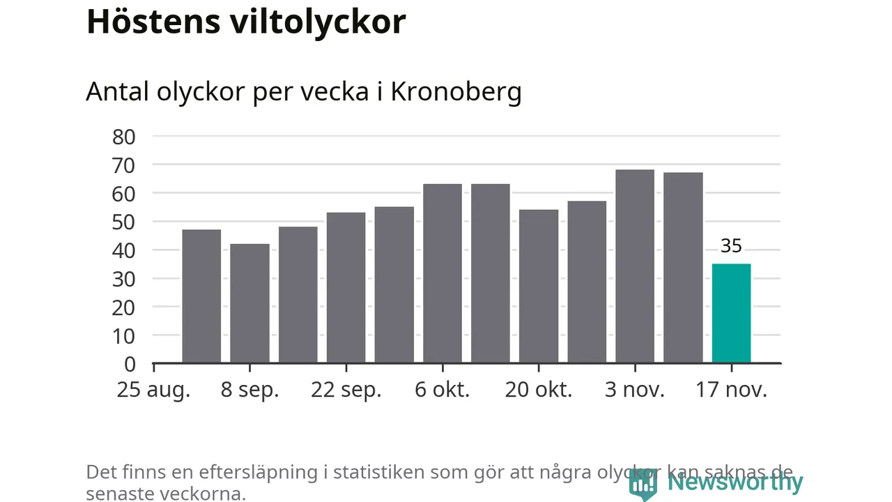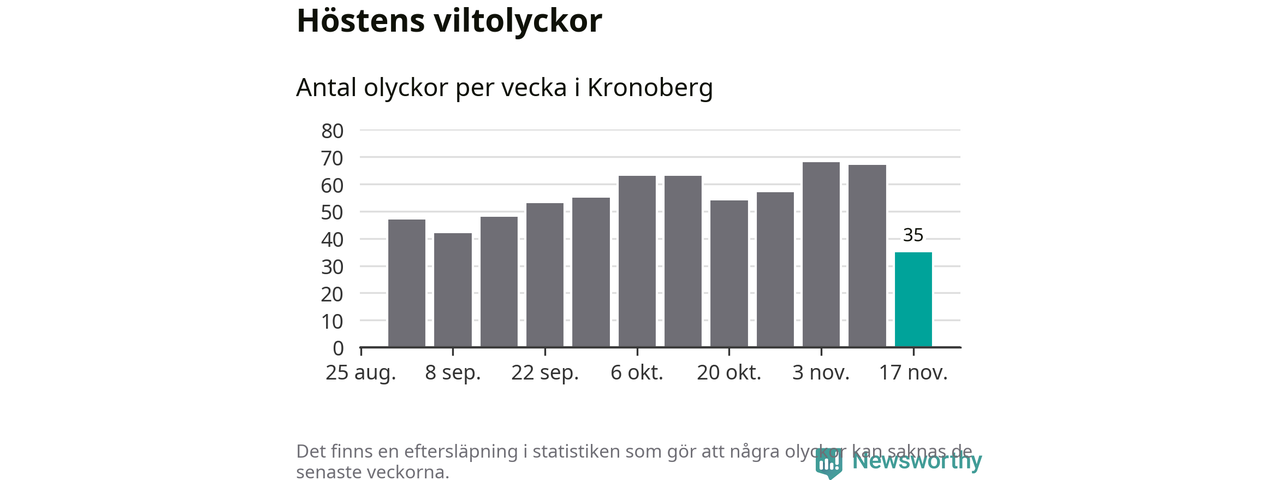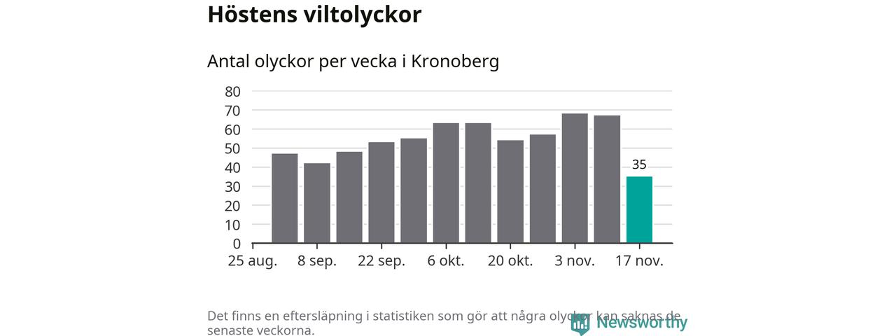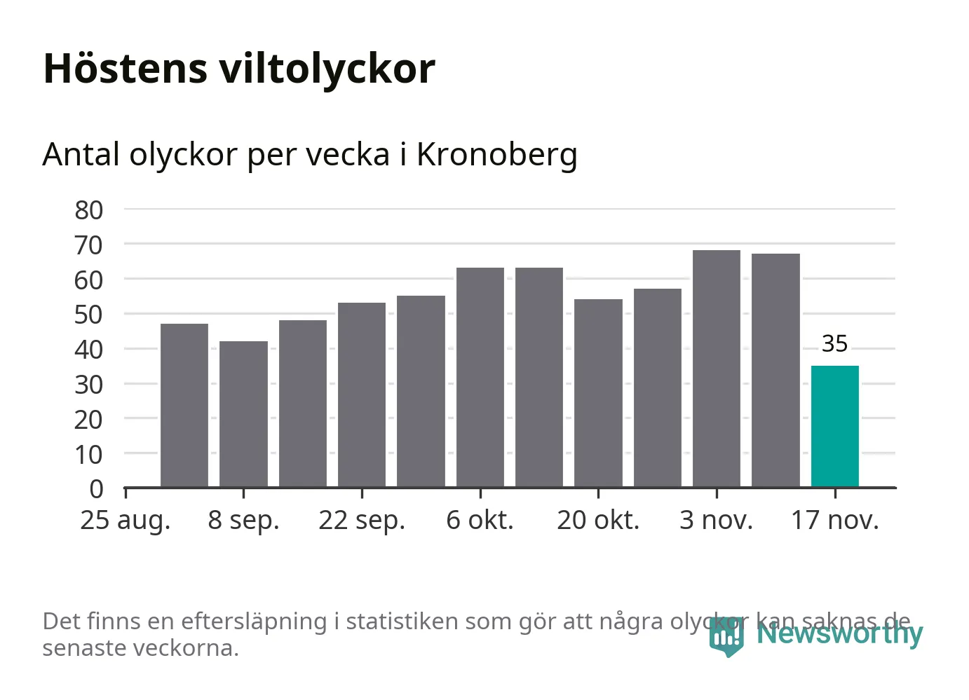 Hittills har 35 viltolyckor rapporterats in i Kronobergs län från vecka 47. Se listan här.