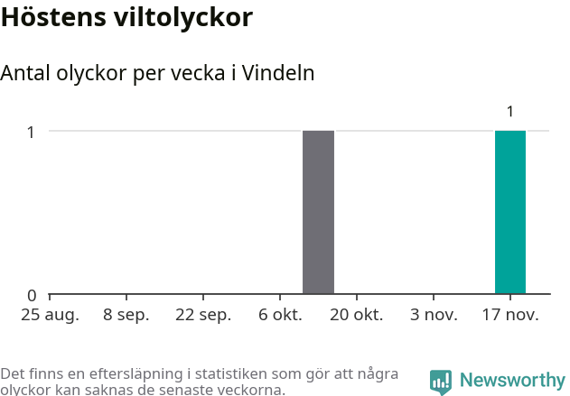 Totalt den här hösten har det inträffat två viltolyckor i kommunen. Det är en normal nivå i förhållande till hur det har sett ut under de senaste tio åren – genomsnittet för motsvarande period är 7.