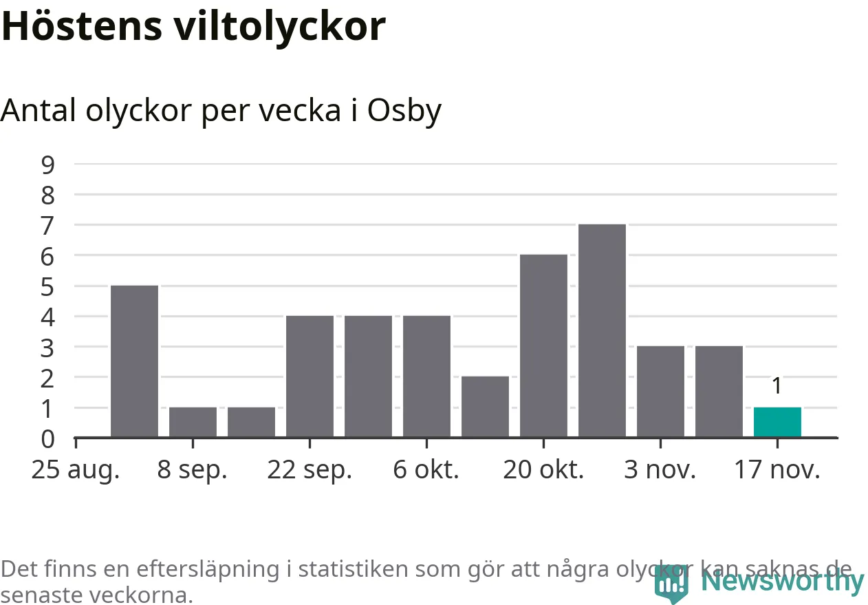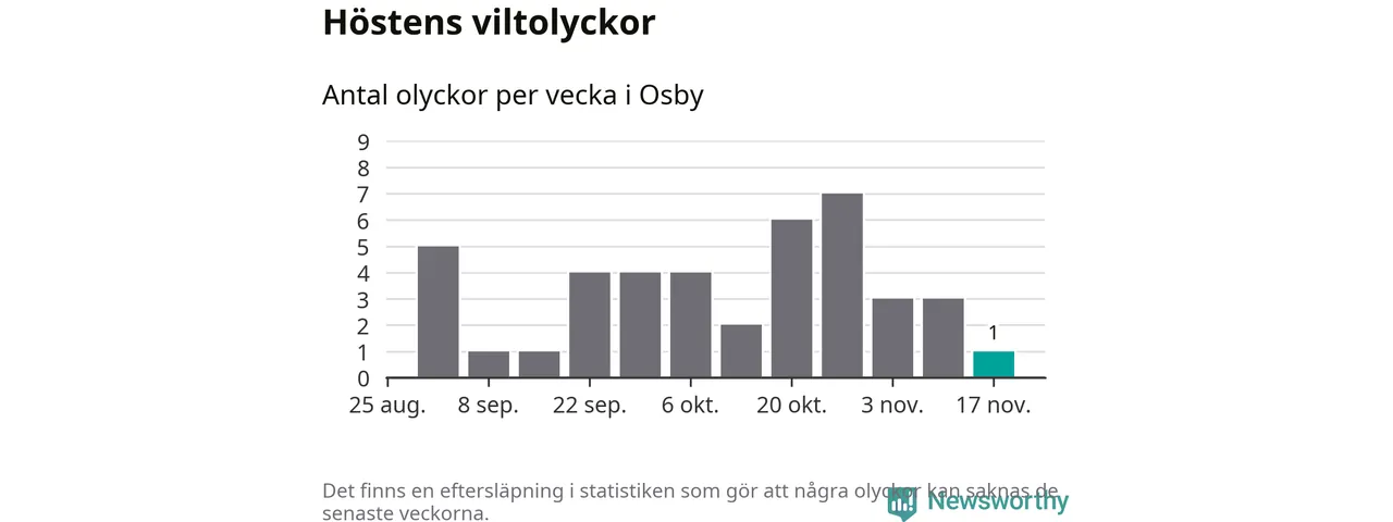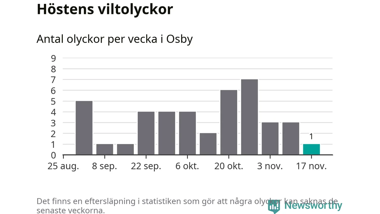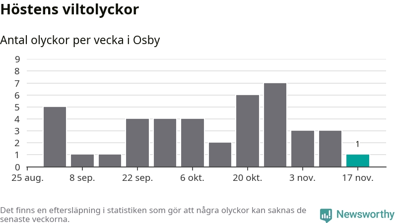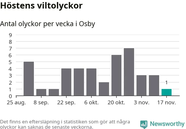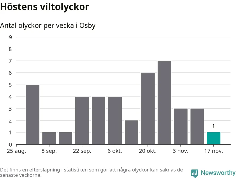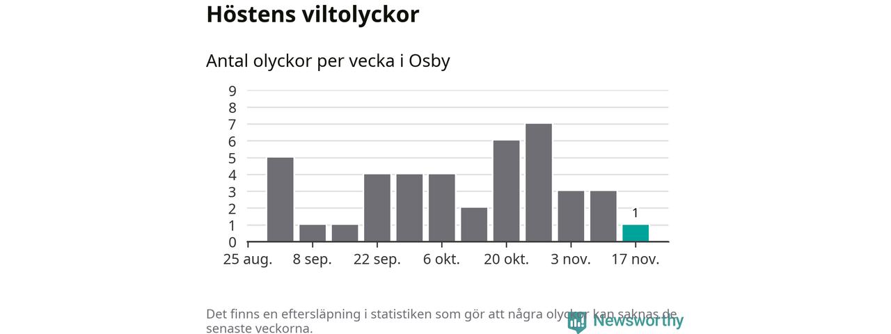 Från förra veckan (vecka 47) har hittills en viltolycka rapporterats in i Osby kommun.