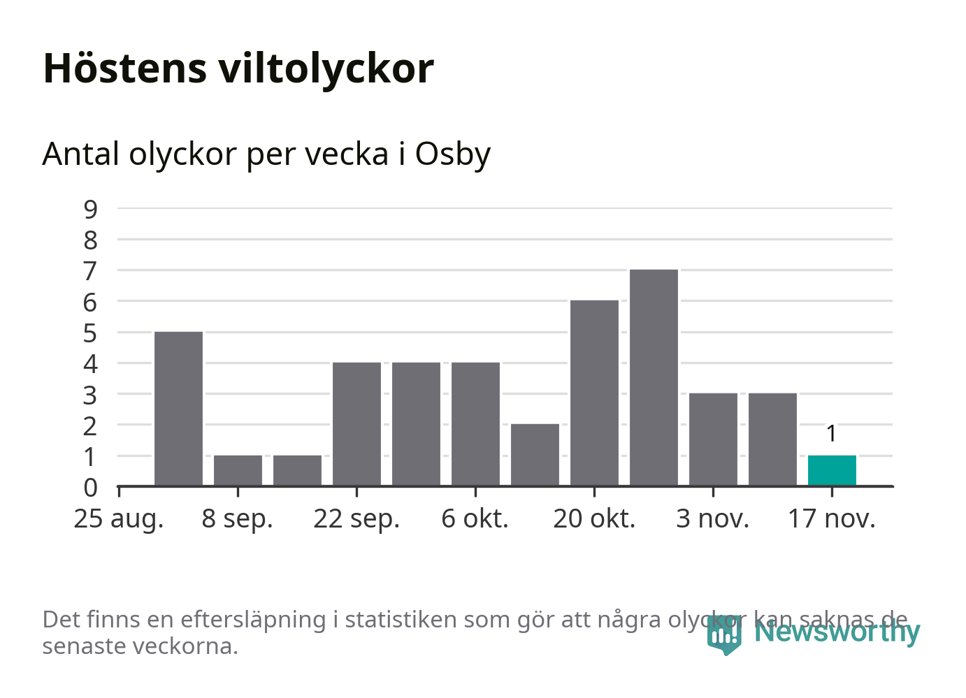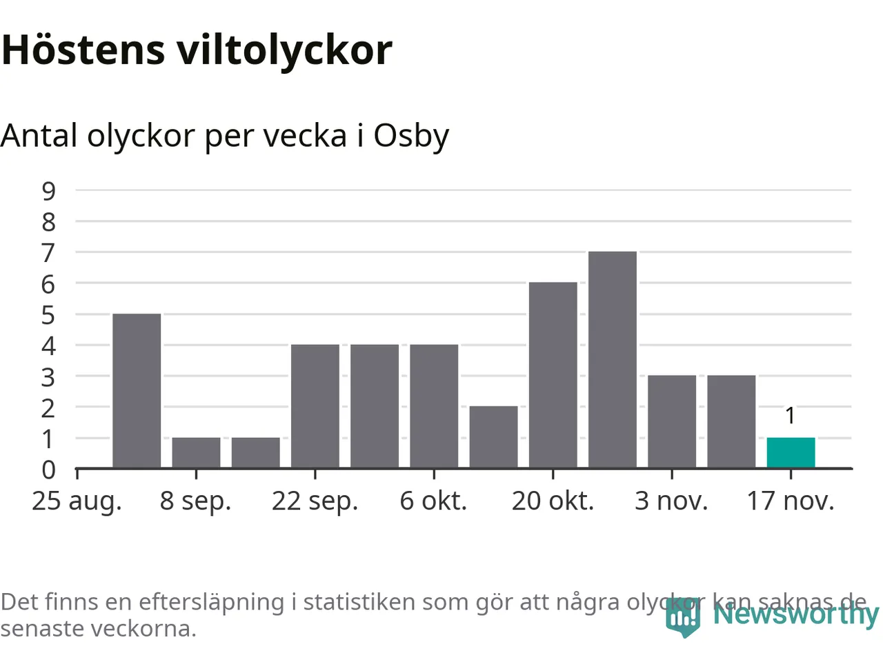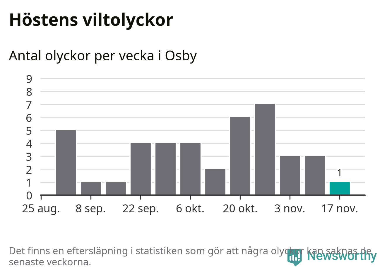 Från förra veckan (vecka 47) har hittills en viltolycka rapporterats in i Osby kommun.