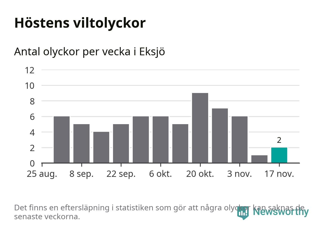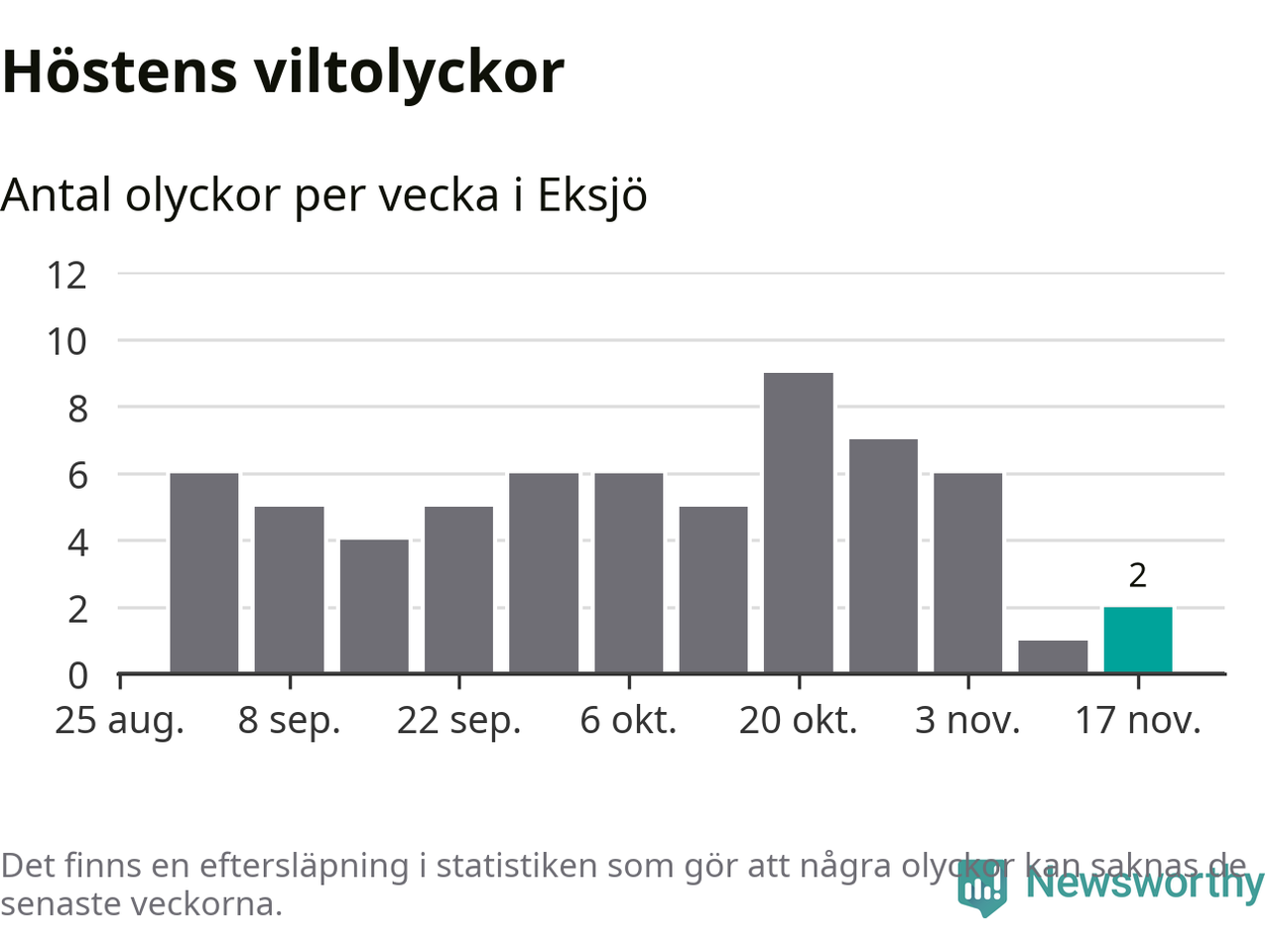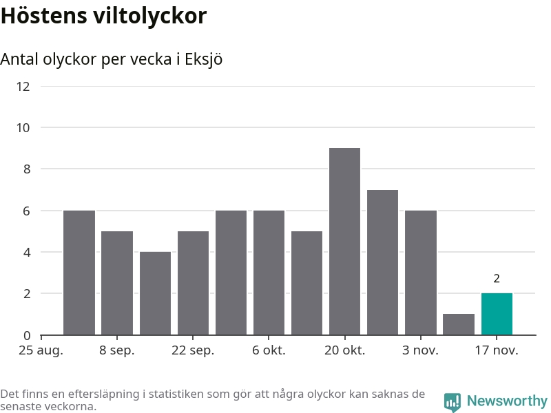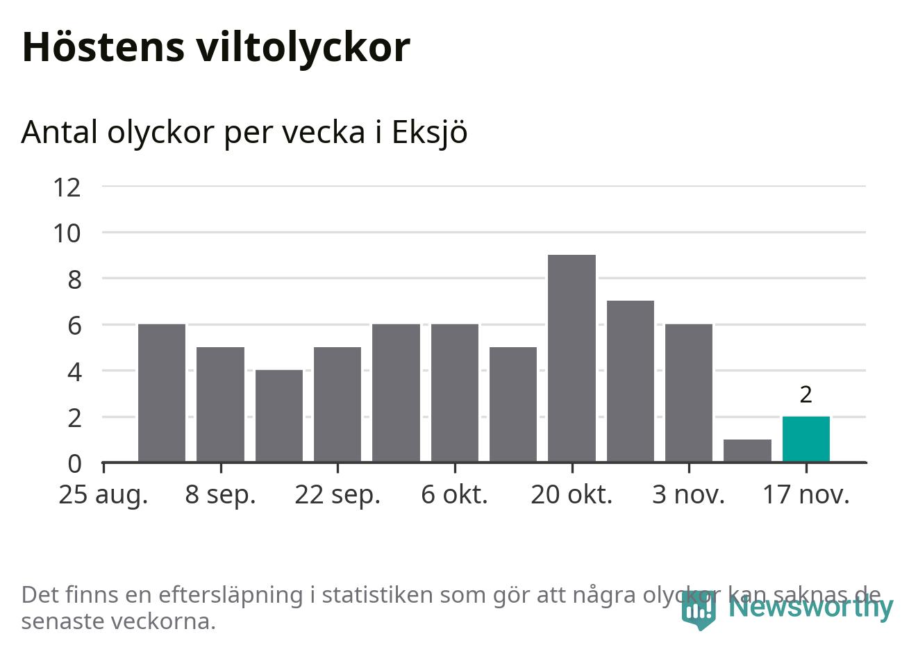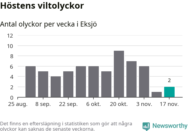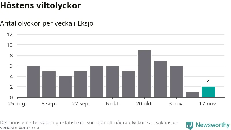 Hittills har två viltolyckor rapporterats in i Eksjö kommun från vecka 47. Se listan här.