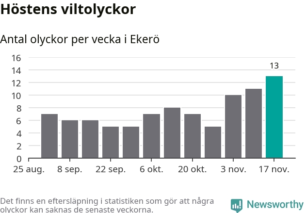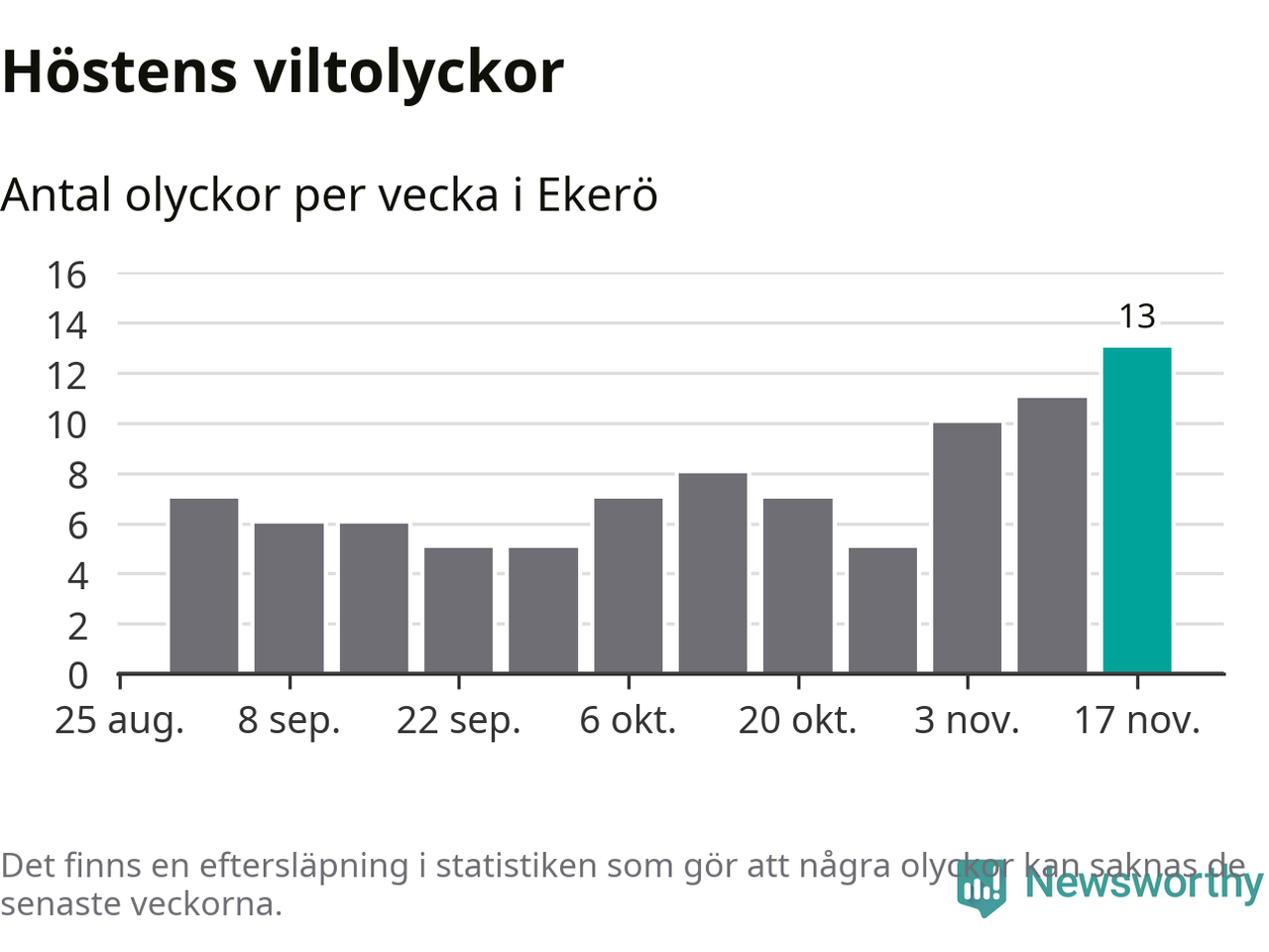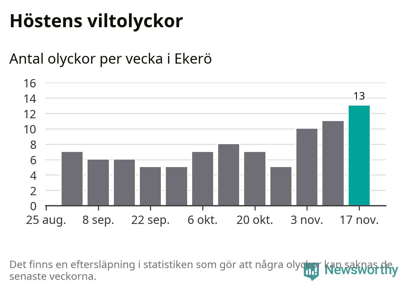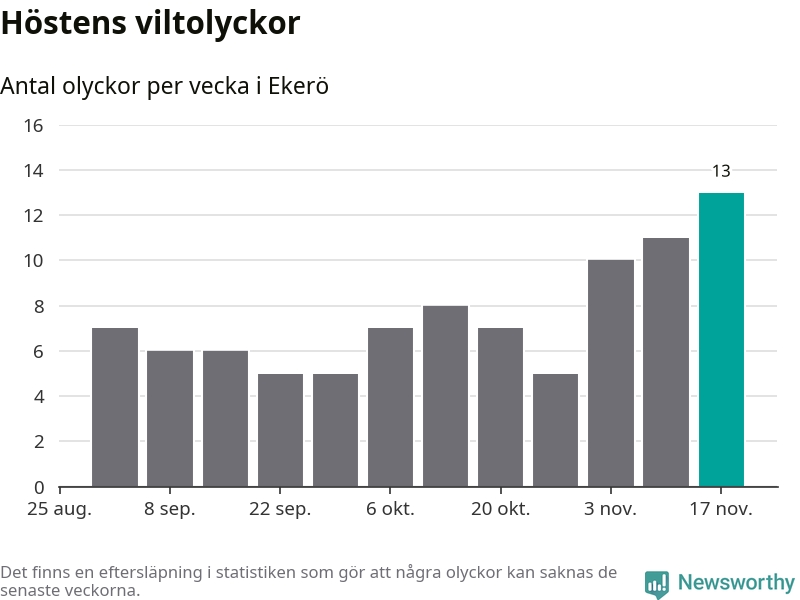 Hittills har 13 viltolyckor rapporterats in i Ekerö kommun från vecka 47. Det är en av de högsta höstsiffrorna för en enskild vecka på över tio år.