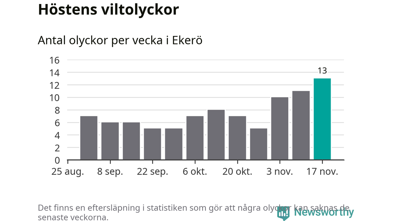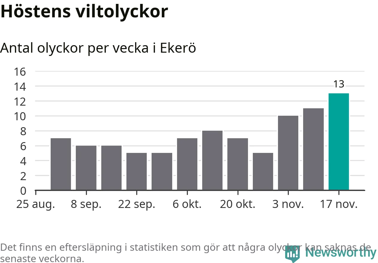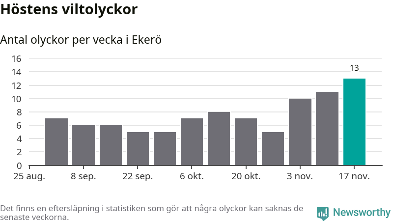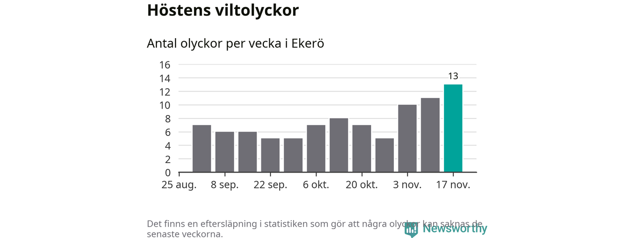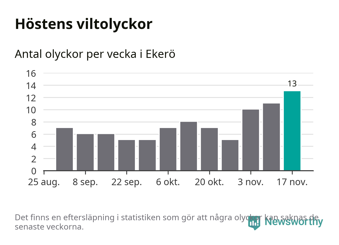 Hittills har 13 viltolyckor rapporterats in i Ekerö kommun från vecka 47. Det är en av de högsta höstsiffrorna för en enskild vecka på över tio år.