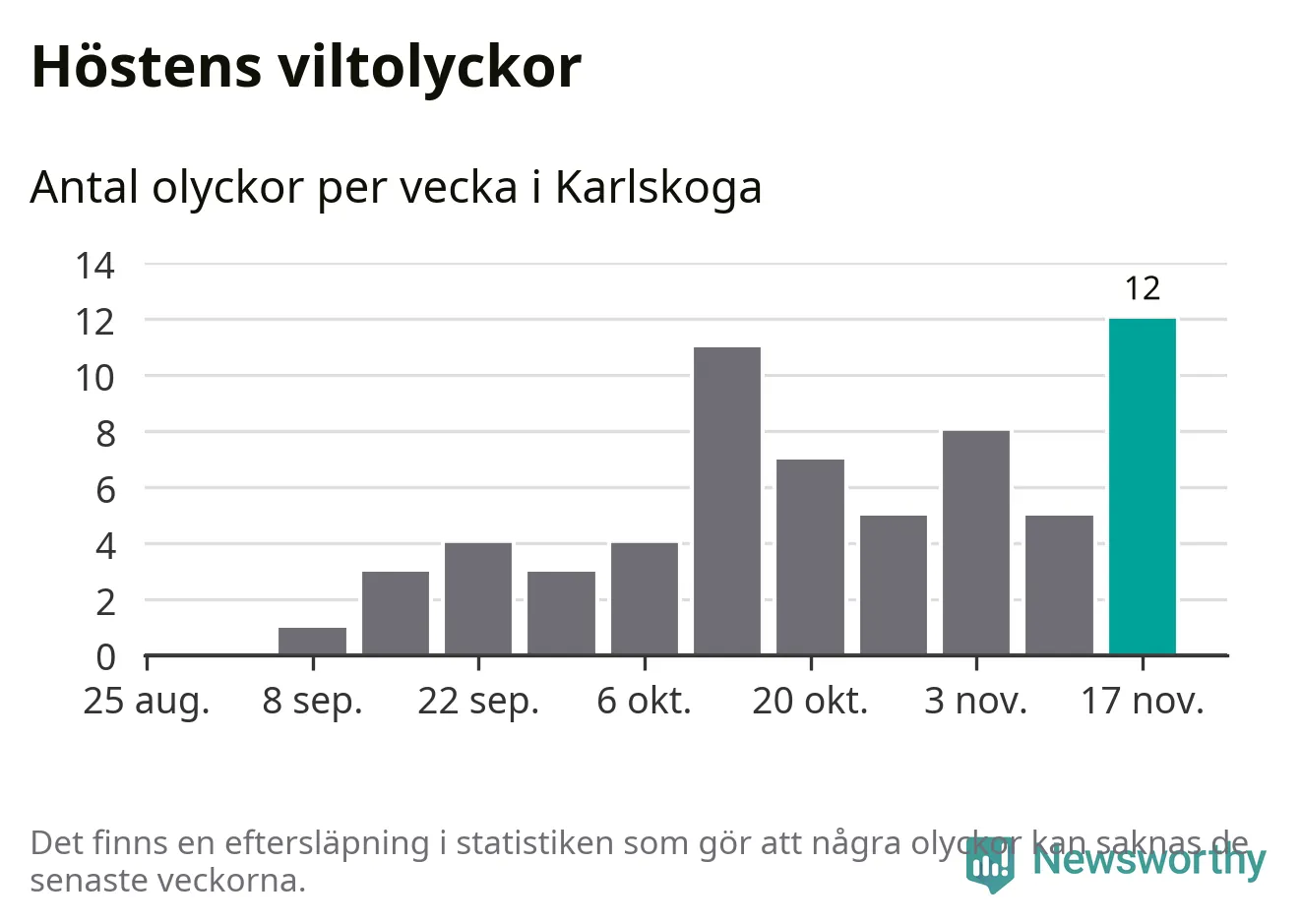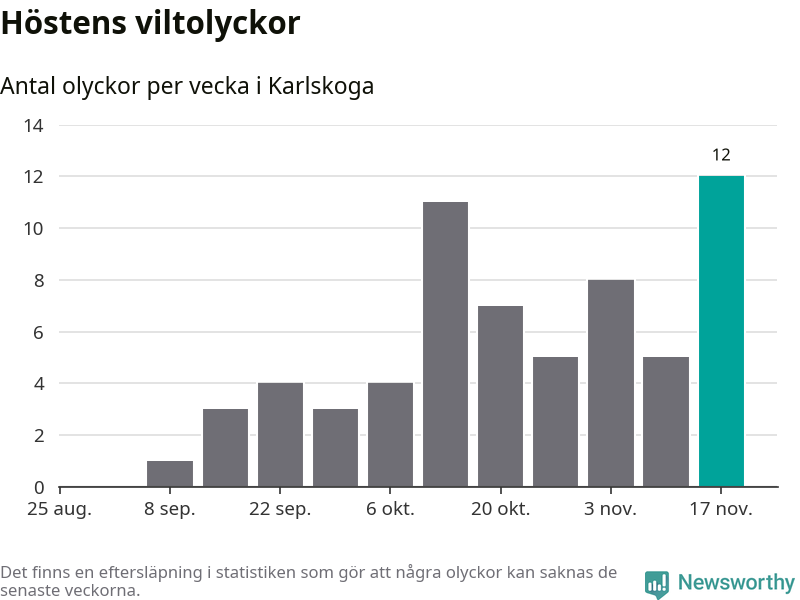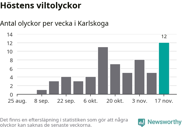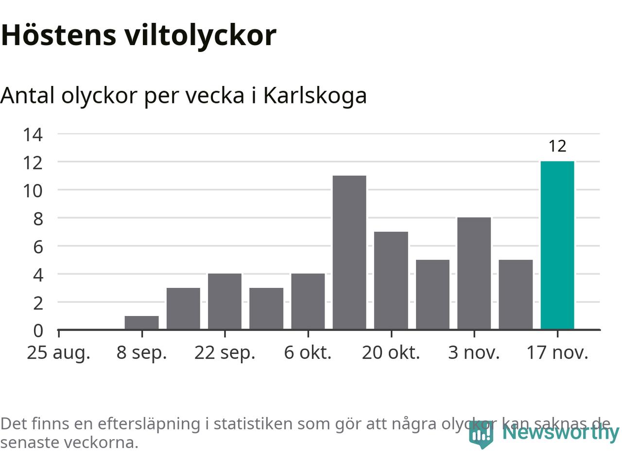 Under vecka 47 rapporterades tolv viltolyckor in i Karlskoga kommun. Det är det största antalet på en vecka den här hösten.