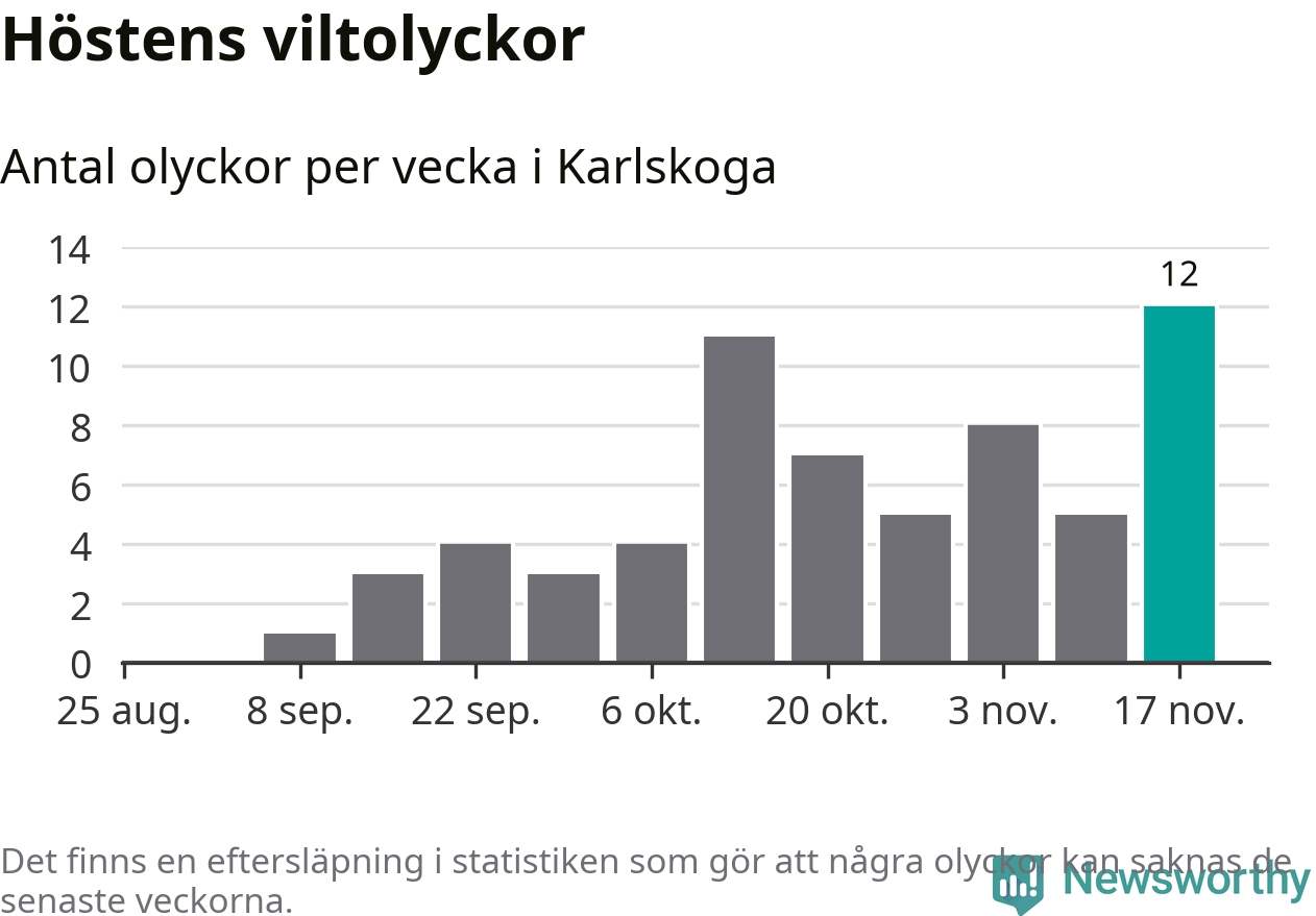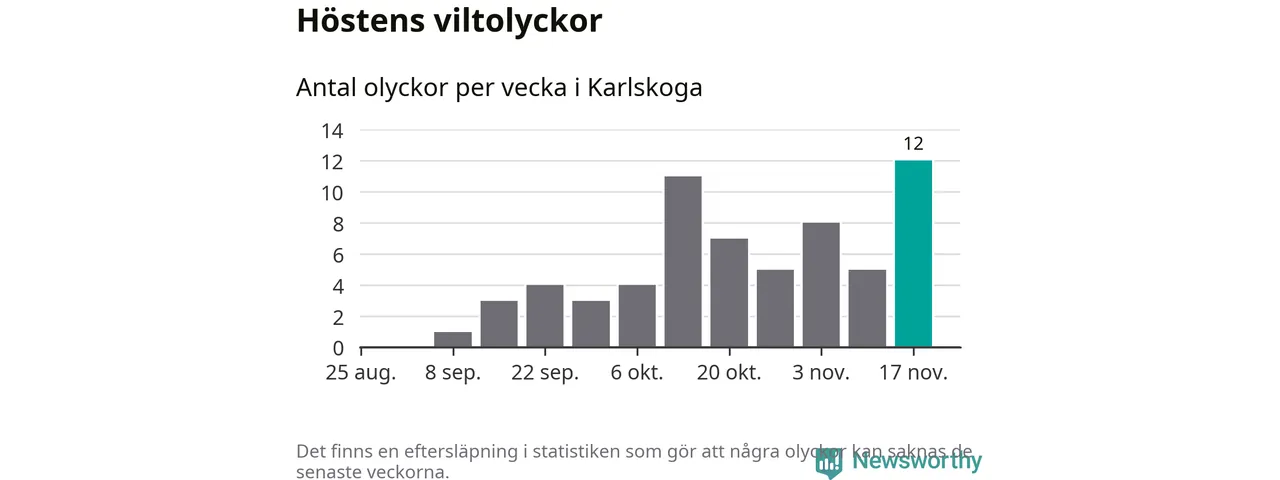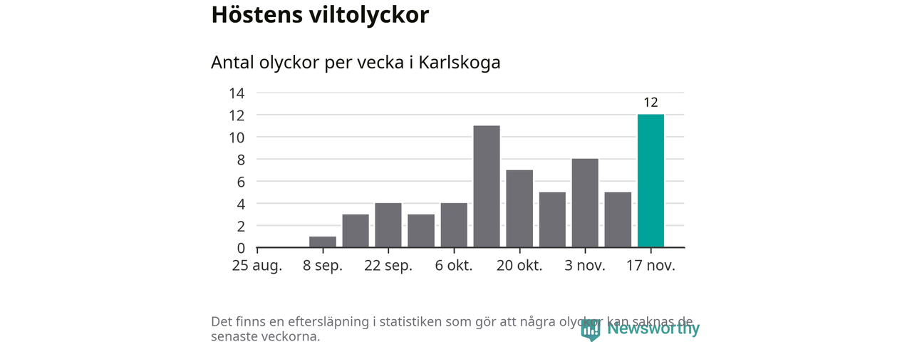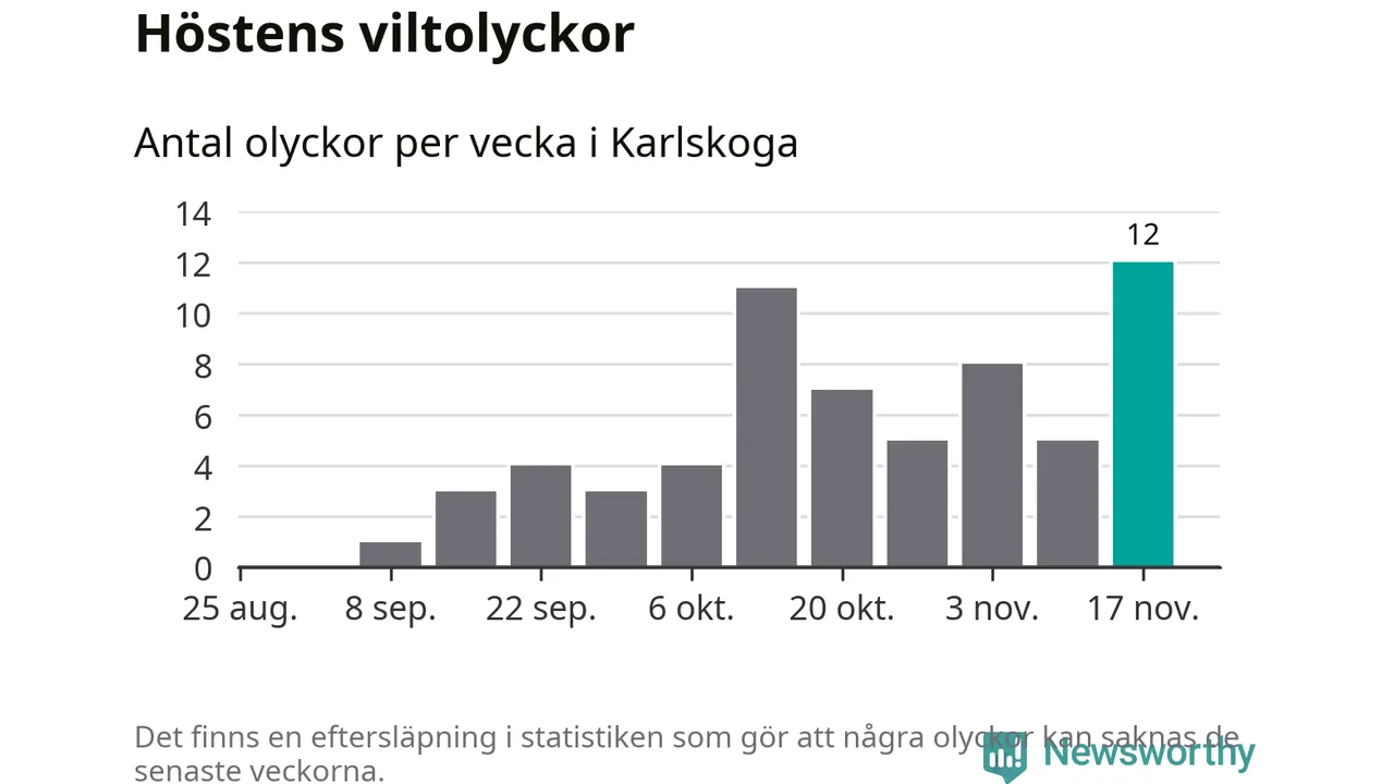 Under vecka 47 rapporterades tolv viltolyckor in i Karlskoga kommun. Det är det största antalet på en vecka den här hösten.