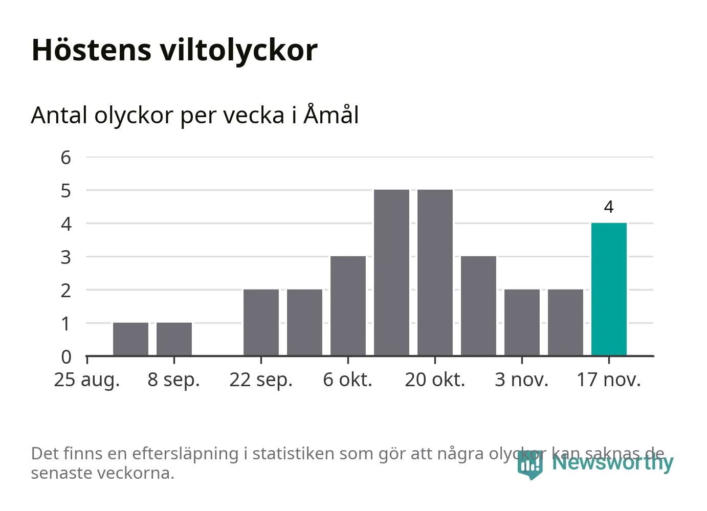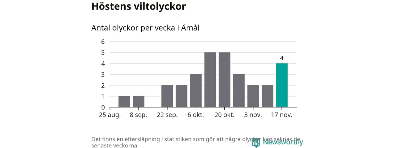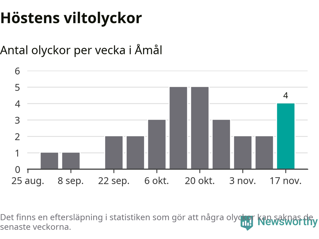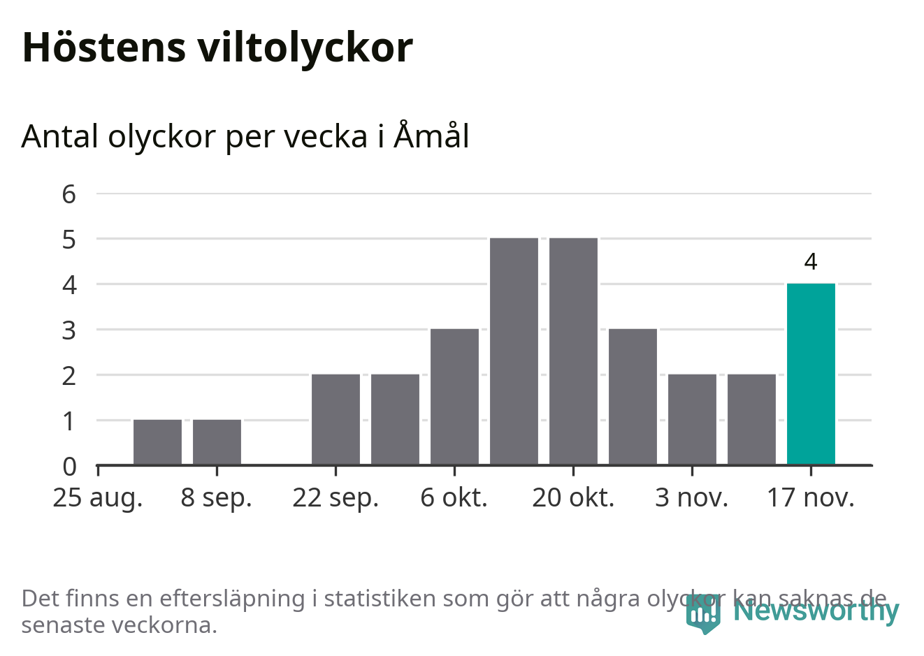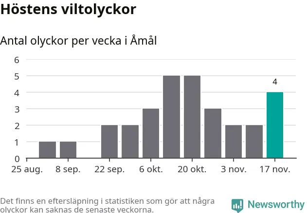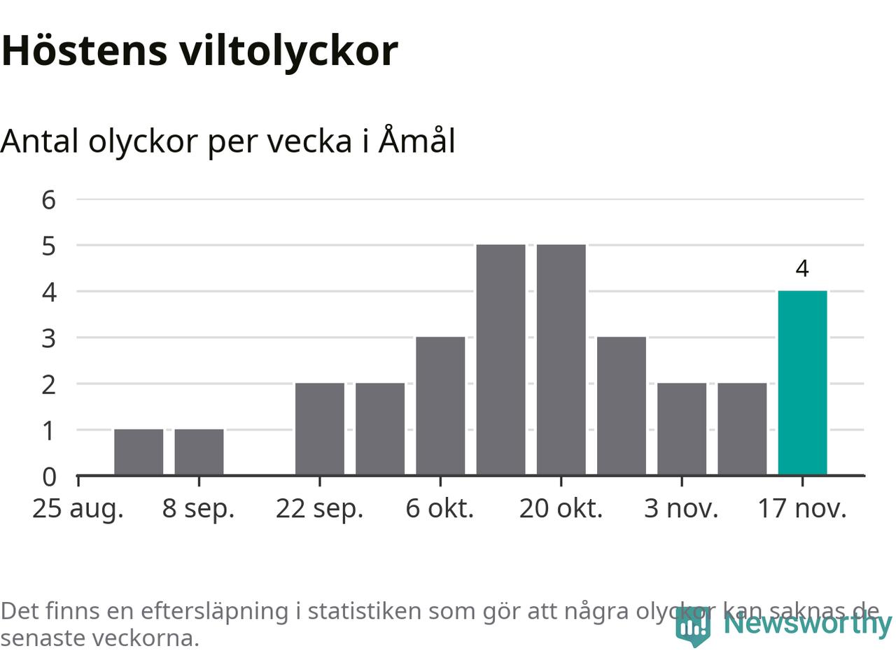 Hittills har fyra viltolyckor rapporterats in i Åmåls kommun från vecka 47. Se listan här.