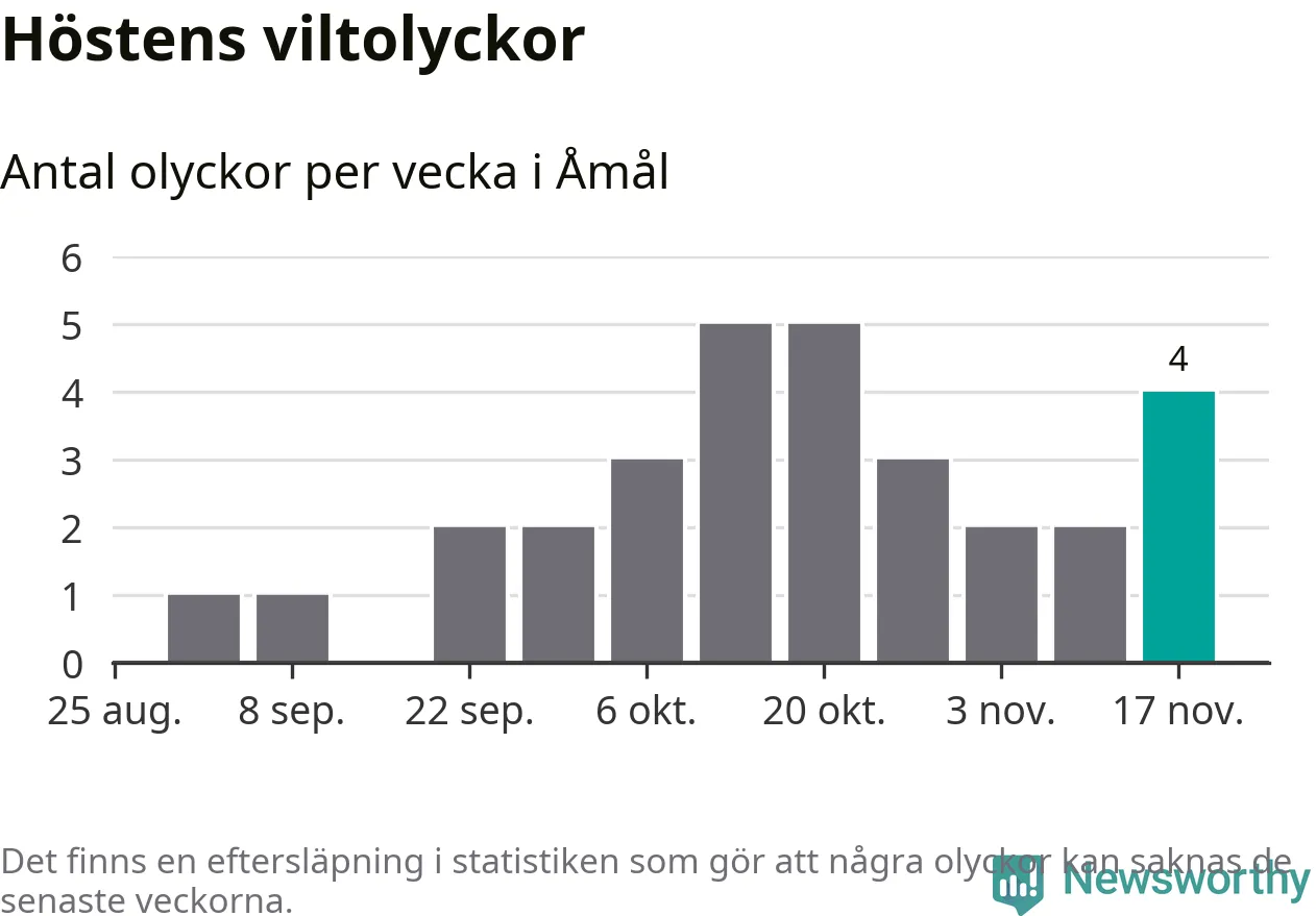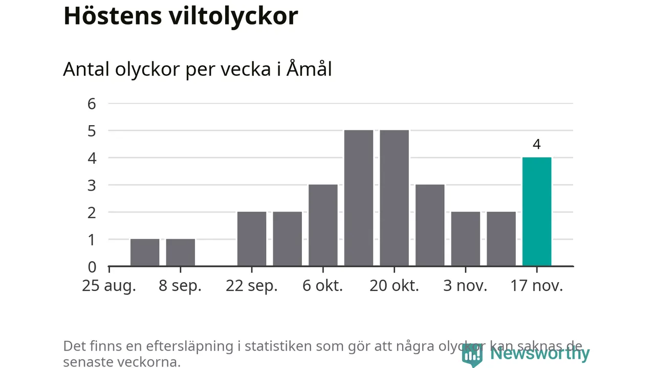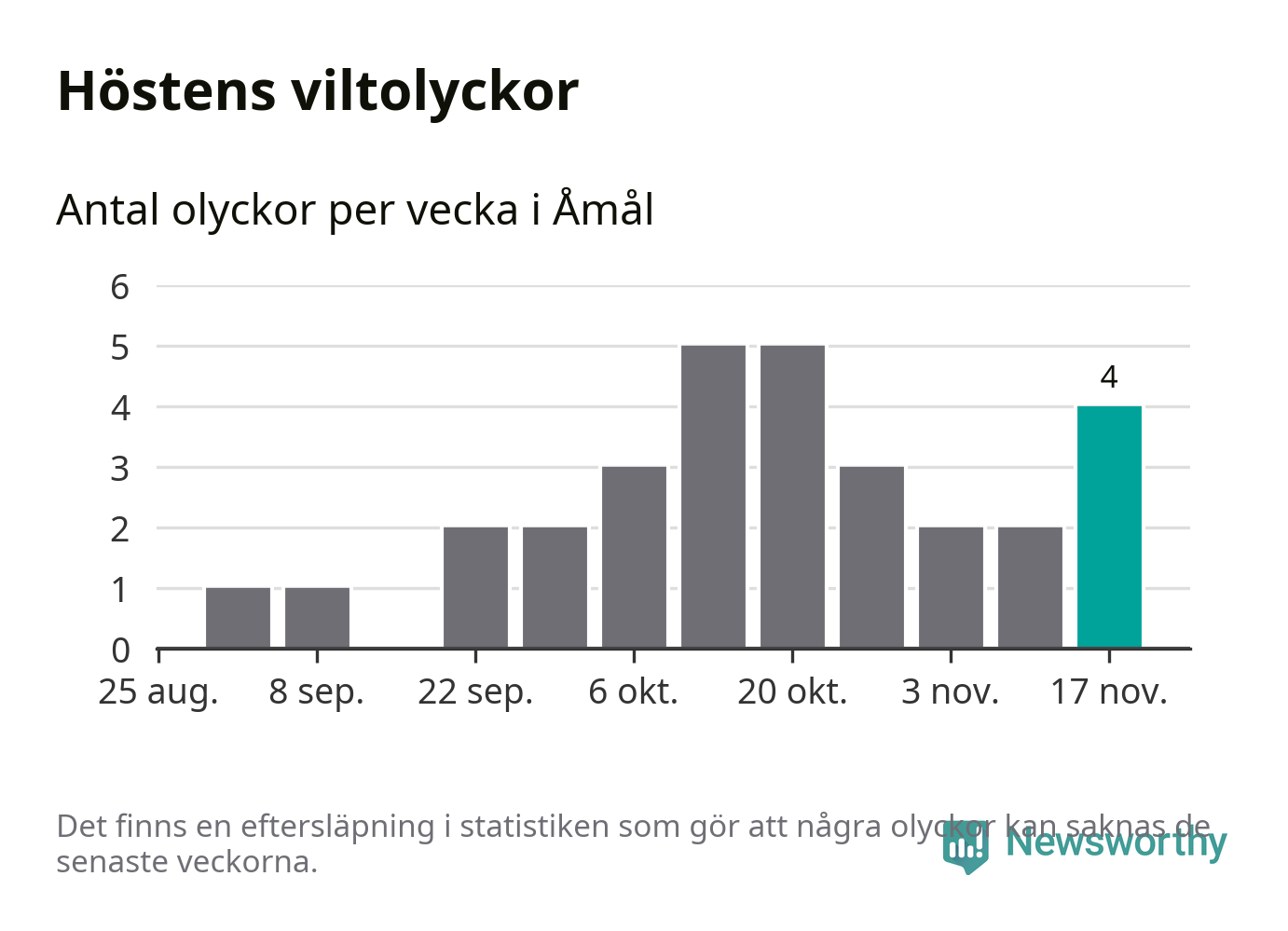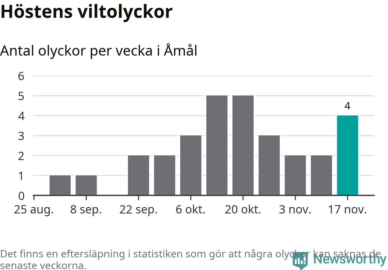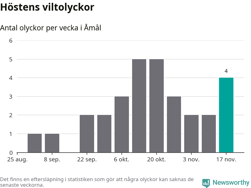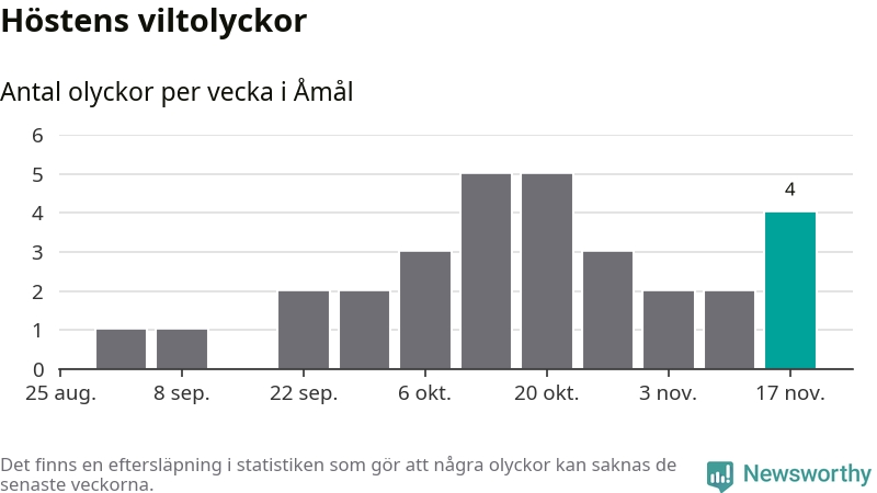Hittills har fyra viltolyckor rapporterats in i Åmåls kommun från vecka 47. Se listan här.