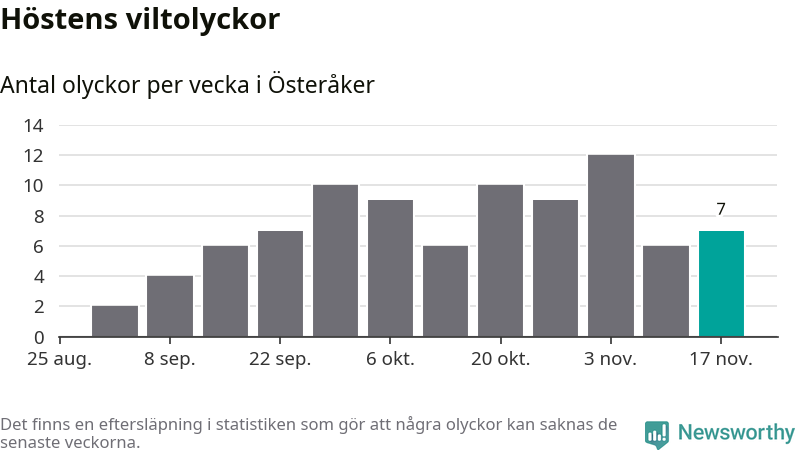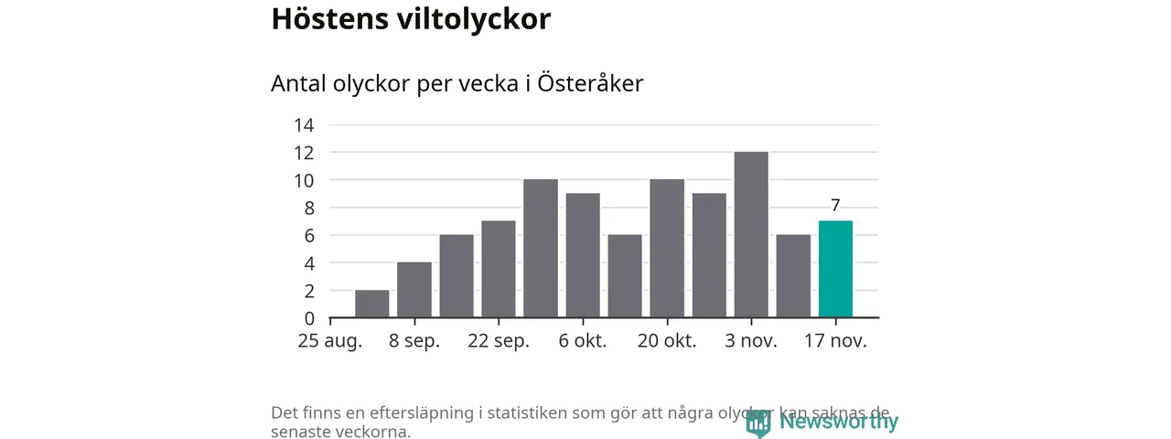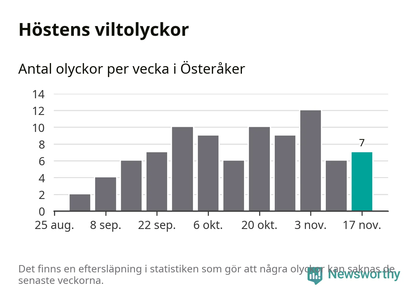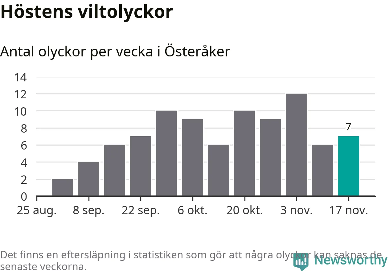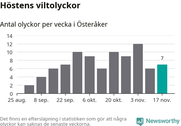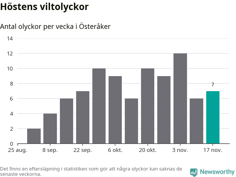 Hittills har sju viltolyckor rapporterats in i Österåkers kommun från vecka 47. Se listan här.