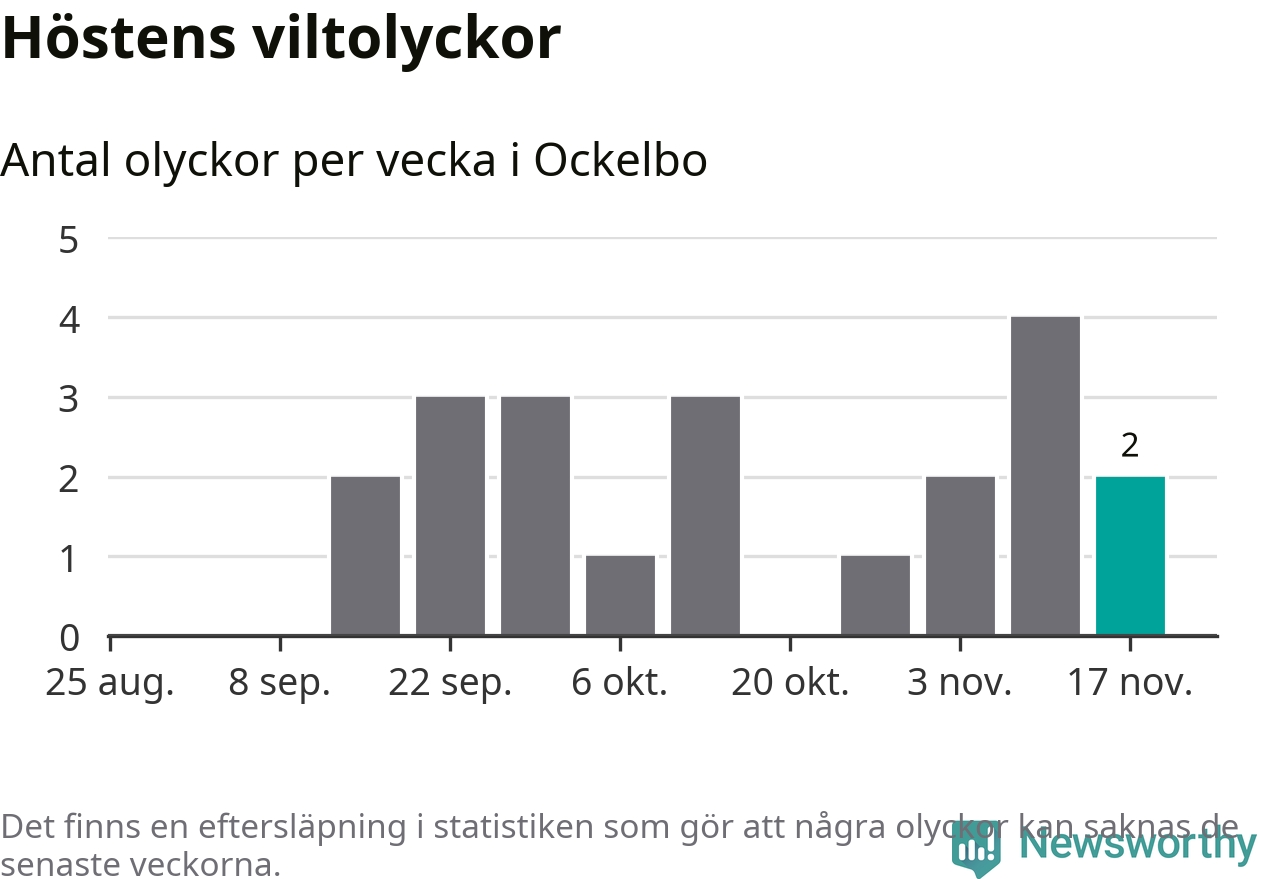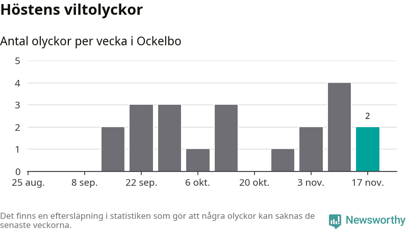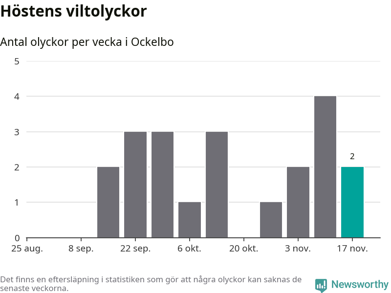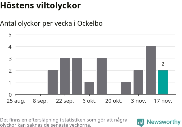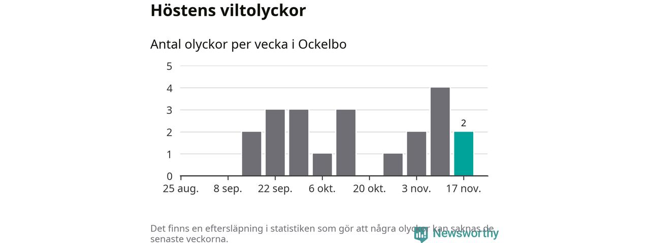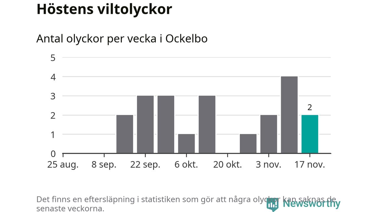 Hittills har två viltolyckor rapporterats in i Ockelbo kommun från vecka 47. Se listan här.