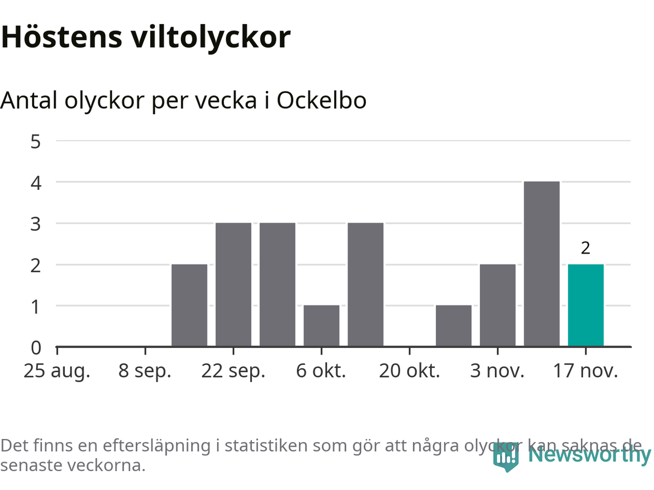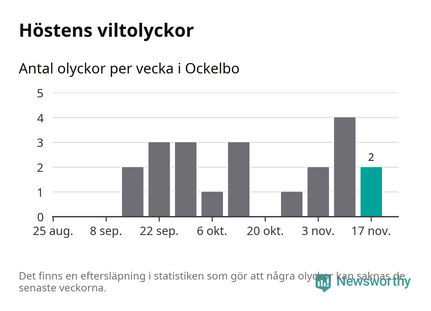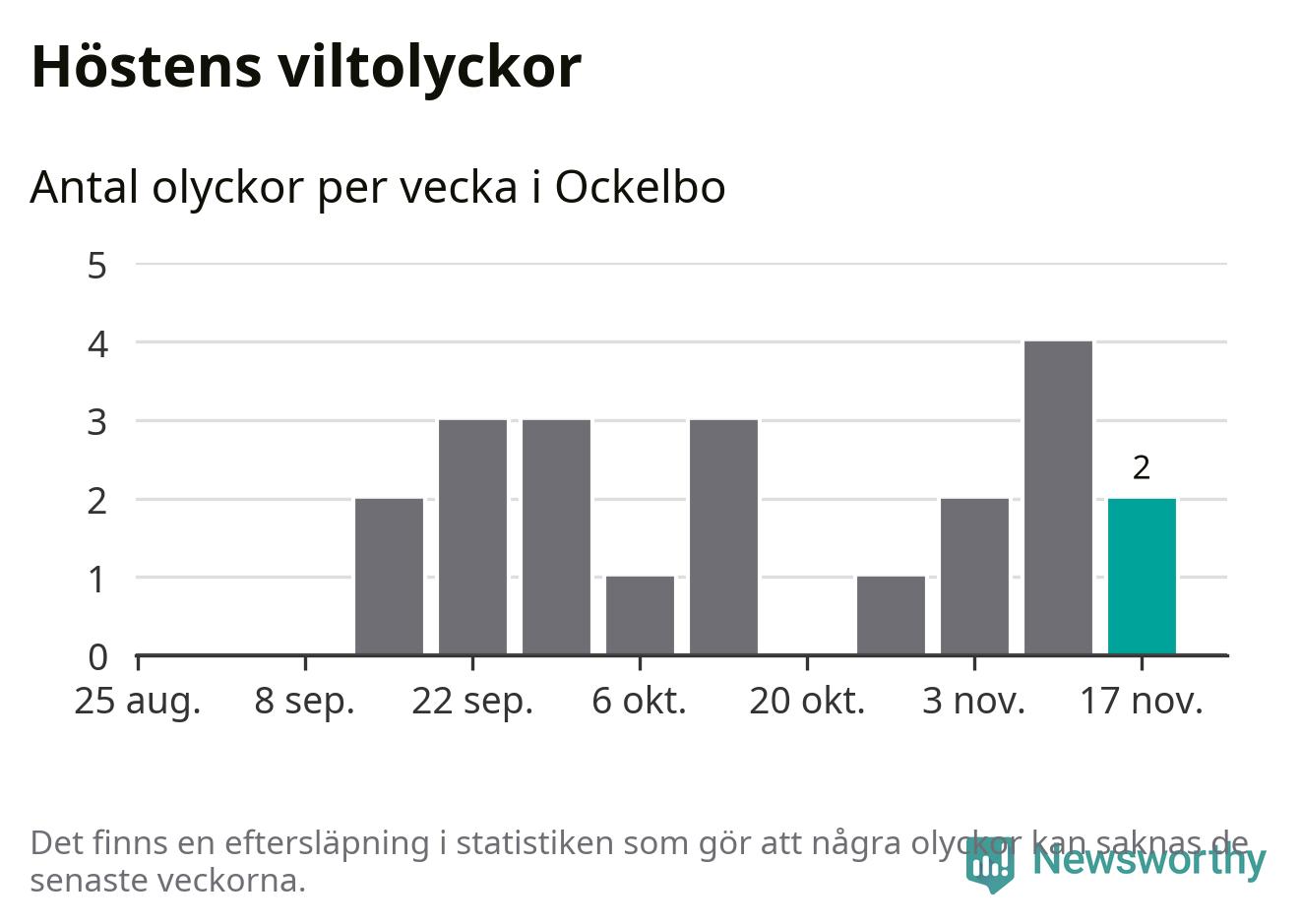 Hittills har två viltolyckor rapporterats in i Ockelbo kommun från vecka 47. Se listan här.