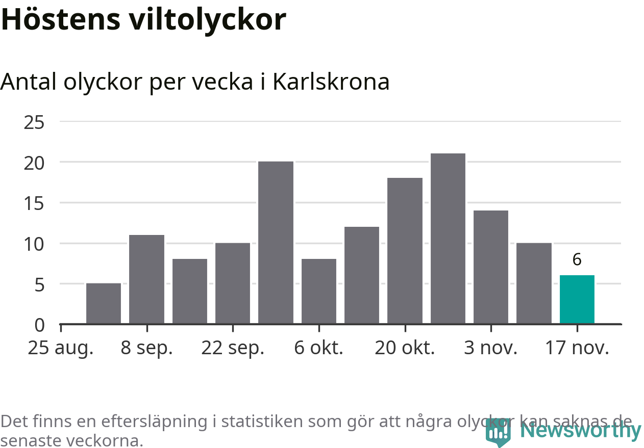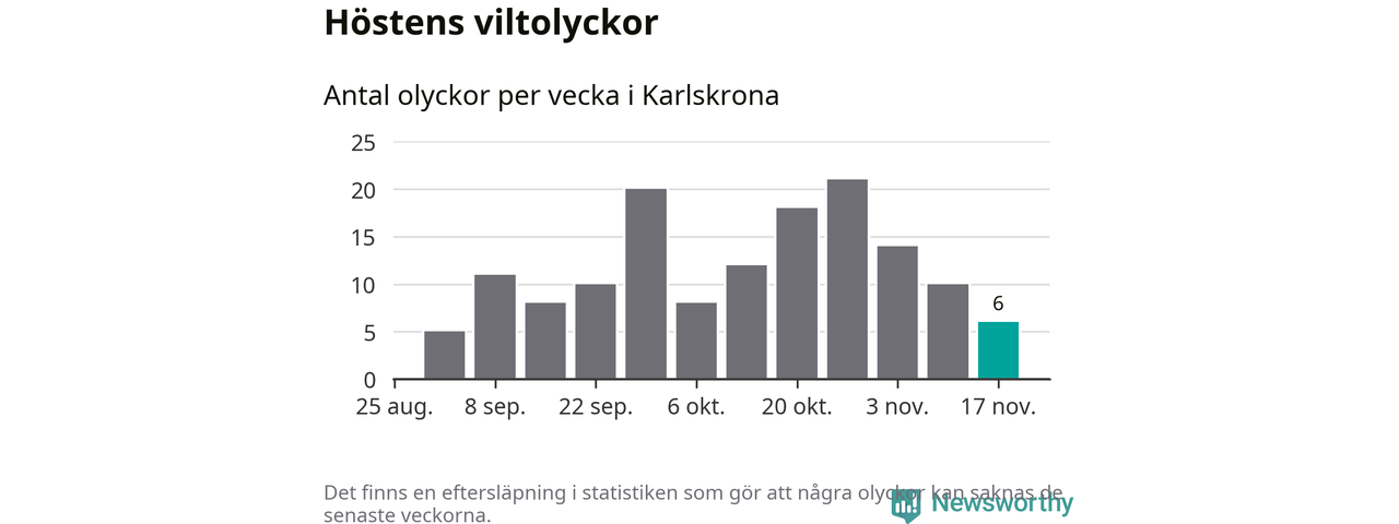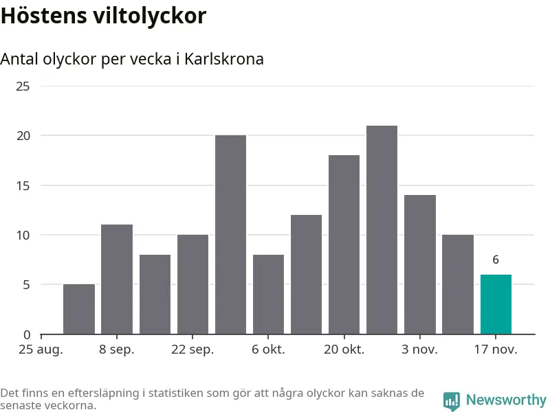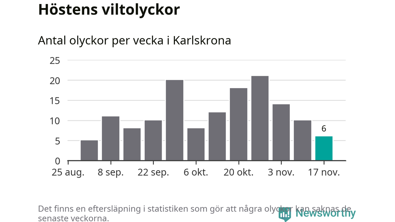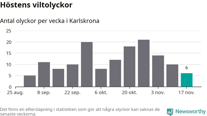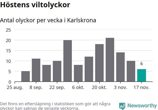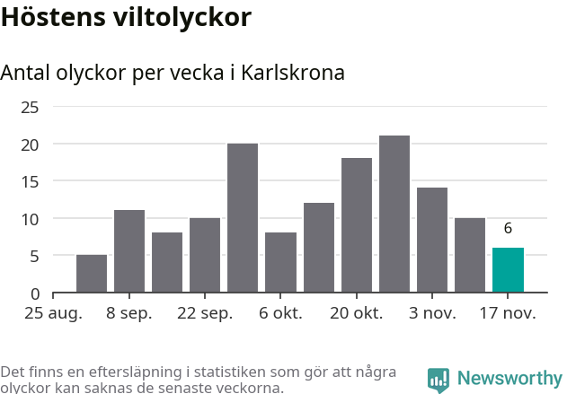 Hittills har sex viltolyckor rapporterats in i Karlskrona kommun från vecka 47. Se listan här.