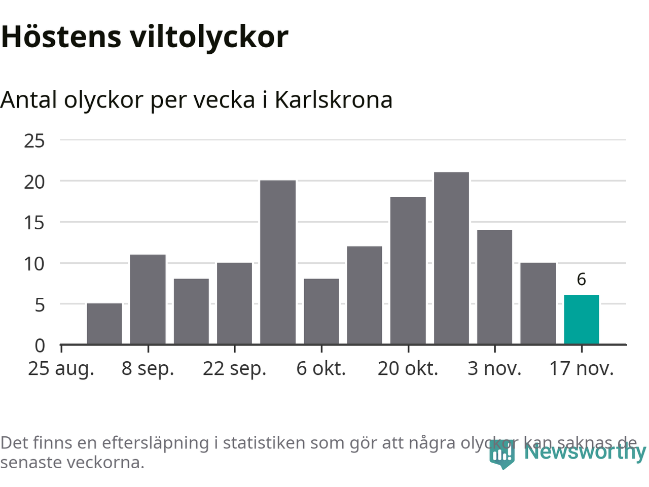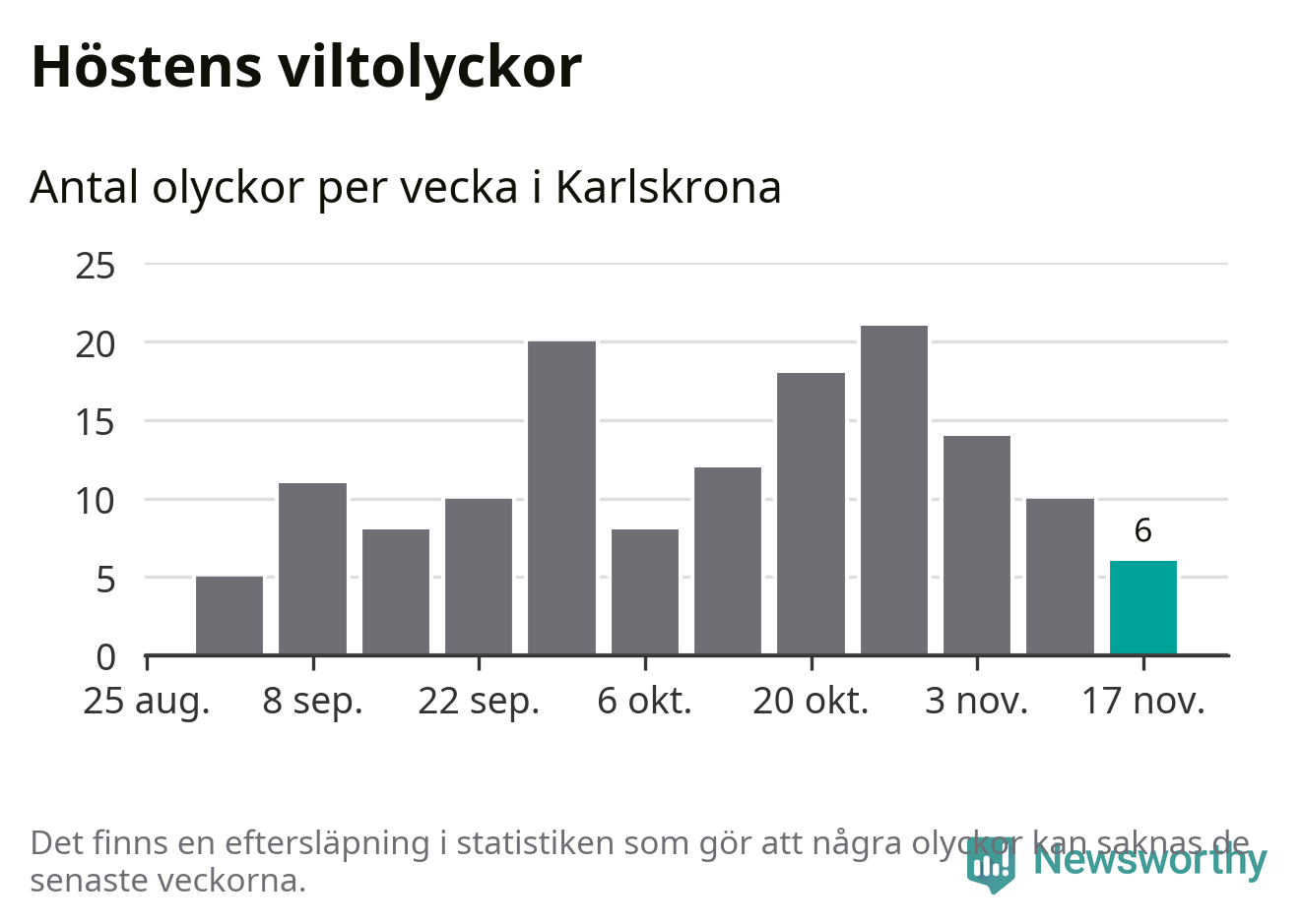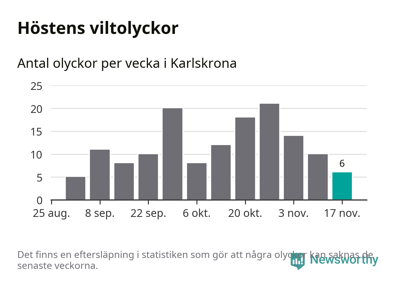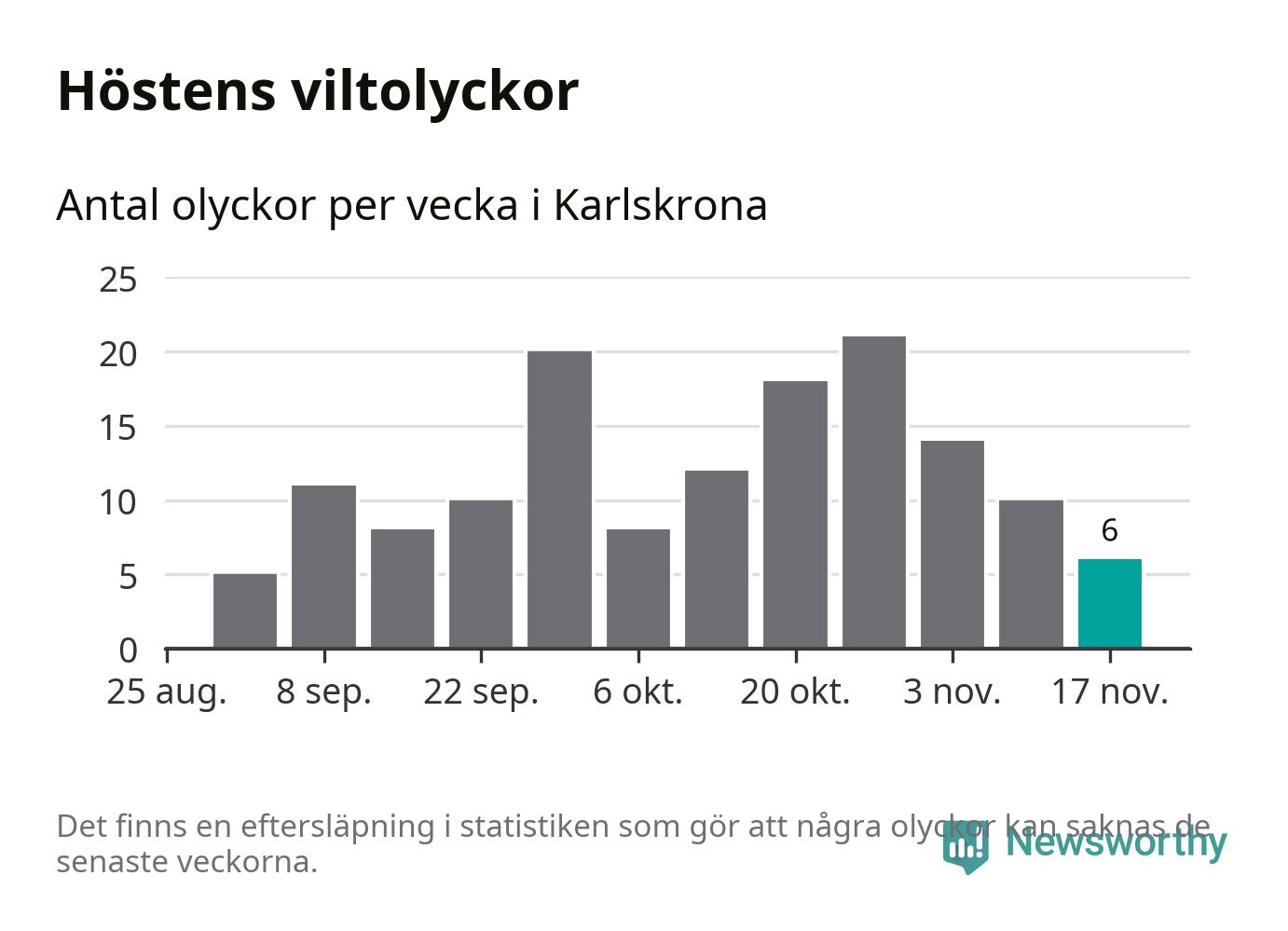 Hittills har sex viltolyckor rapporterats in i Karlskrona kommun från vecka 47. Se listan här.