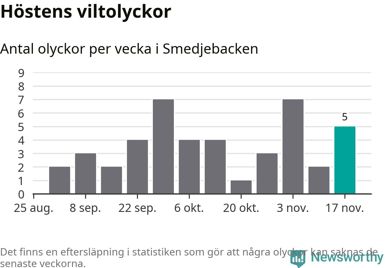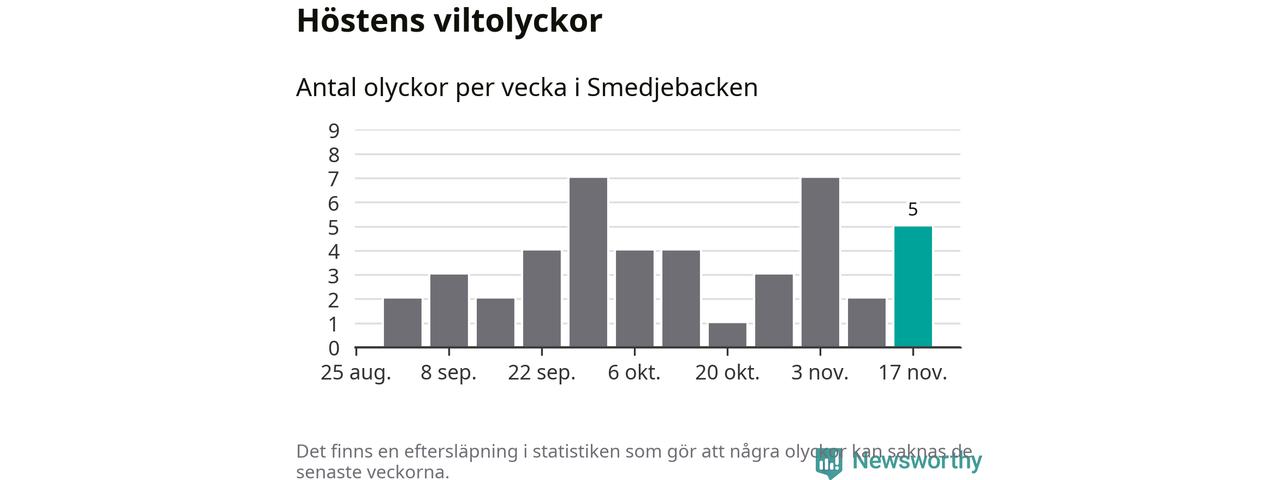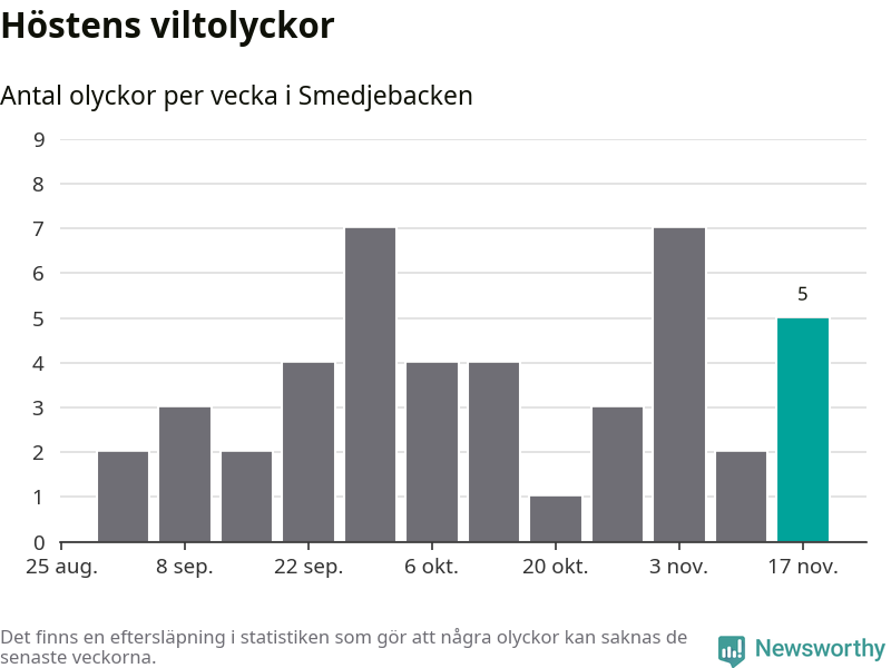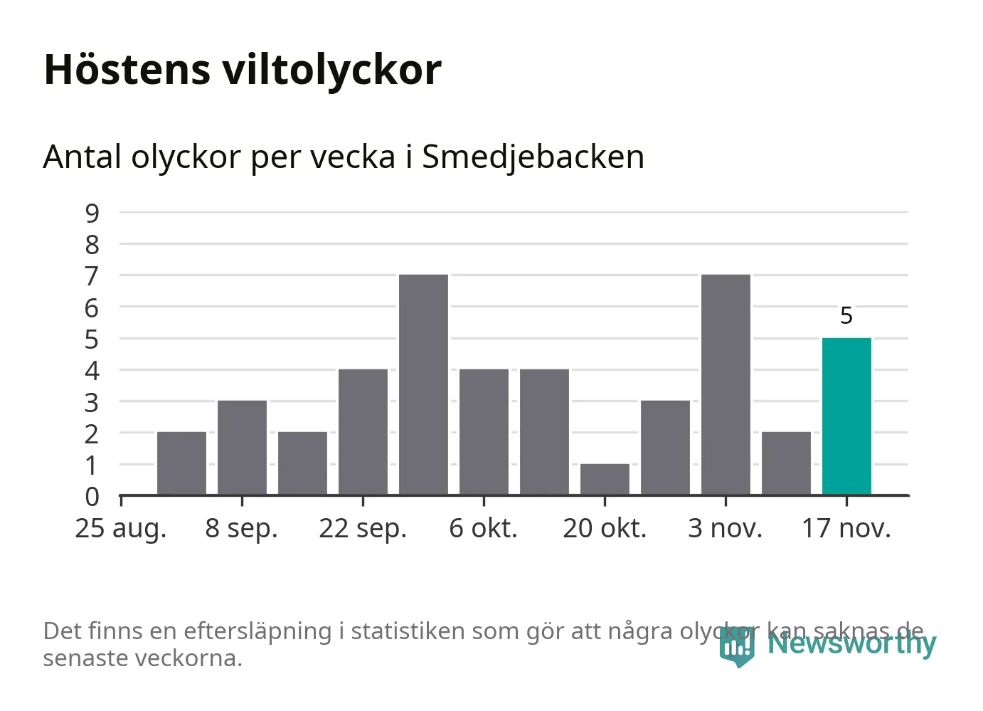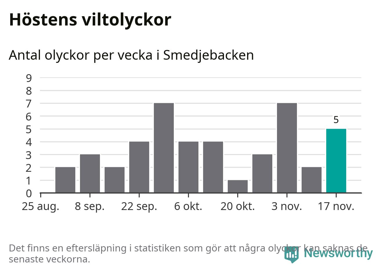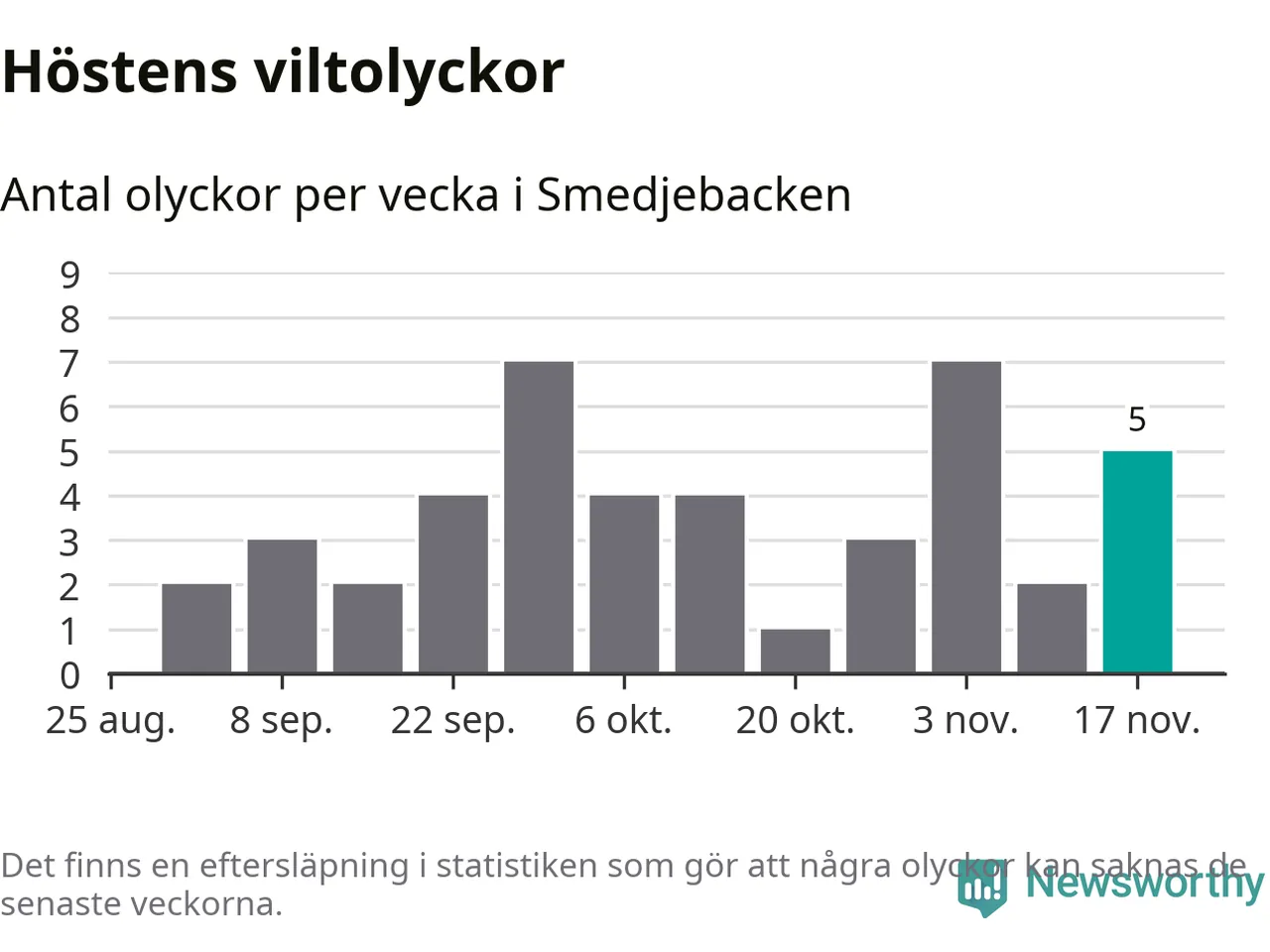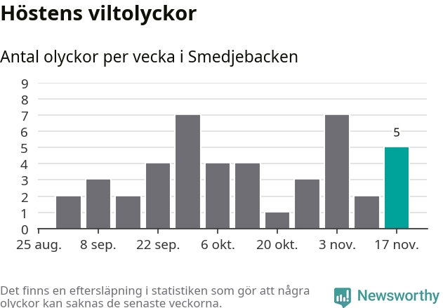 Hittills har fem viltolyckor rapporterats in i Smedjebackens kommun från vecka 47. Se listan här.