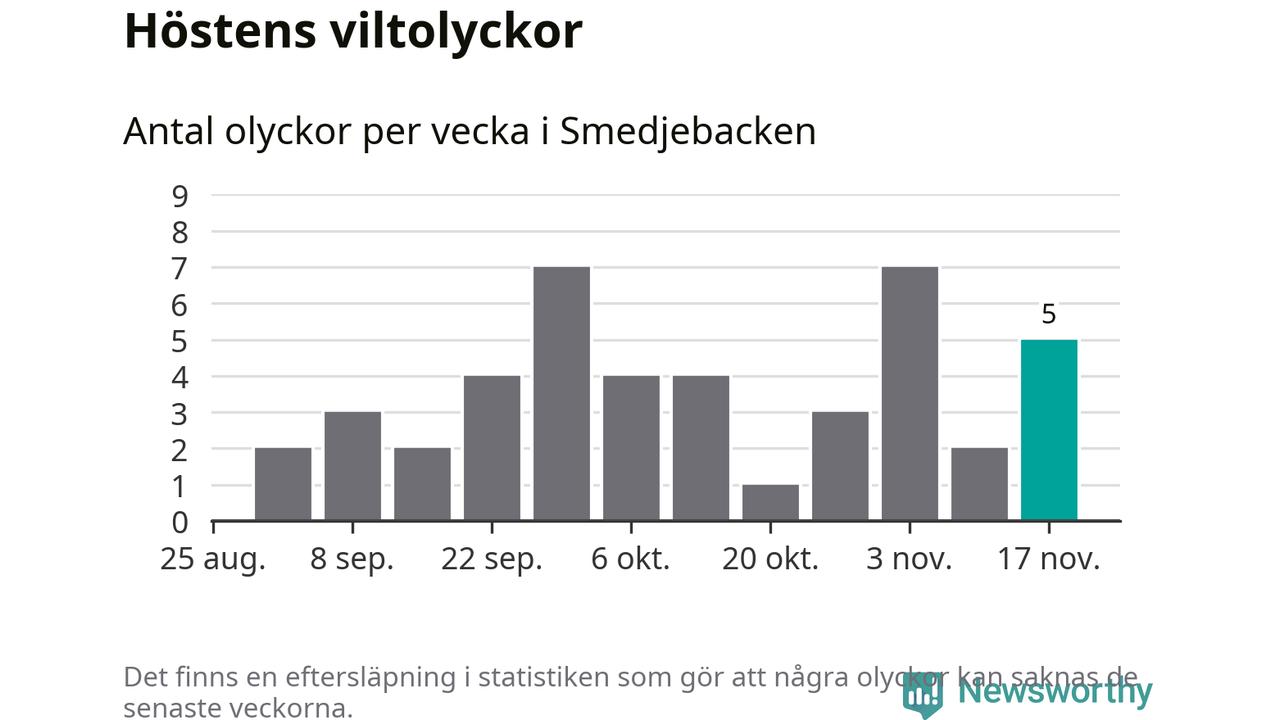 Totalt den här hösten har det inträffat 44 viltolyckor i kommunen. Det är mindre än genomsnittet för motsvarande period (omkring 53) de senaste tio åren.