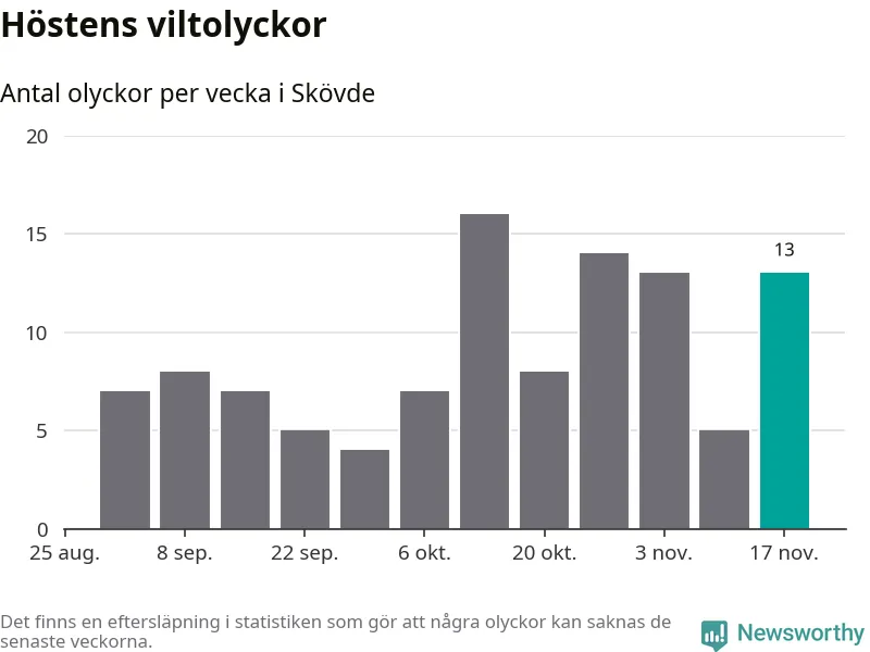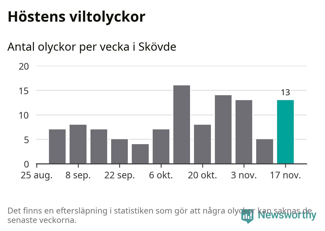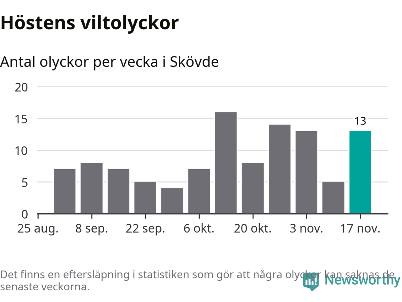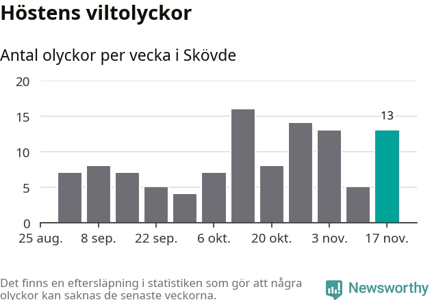 Hittills har 13 viltolyckor rapporterats in i Skövde kommun från vecka 47. Se listan här.